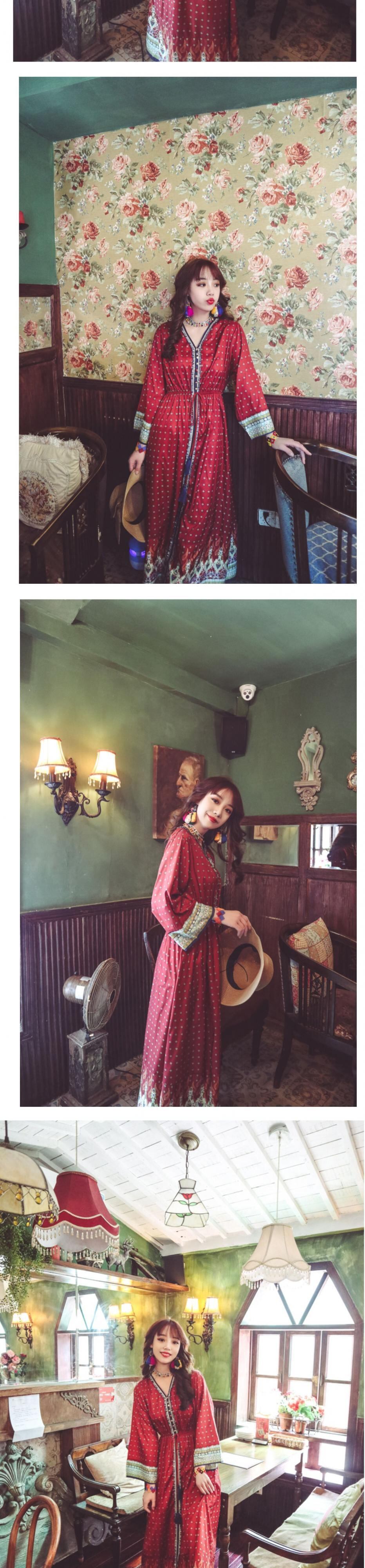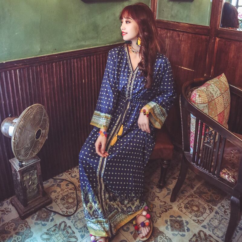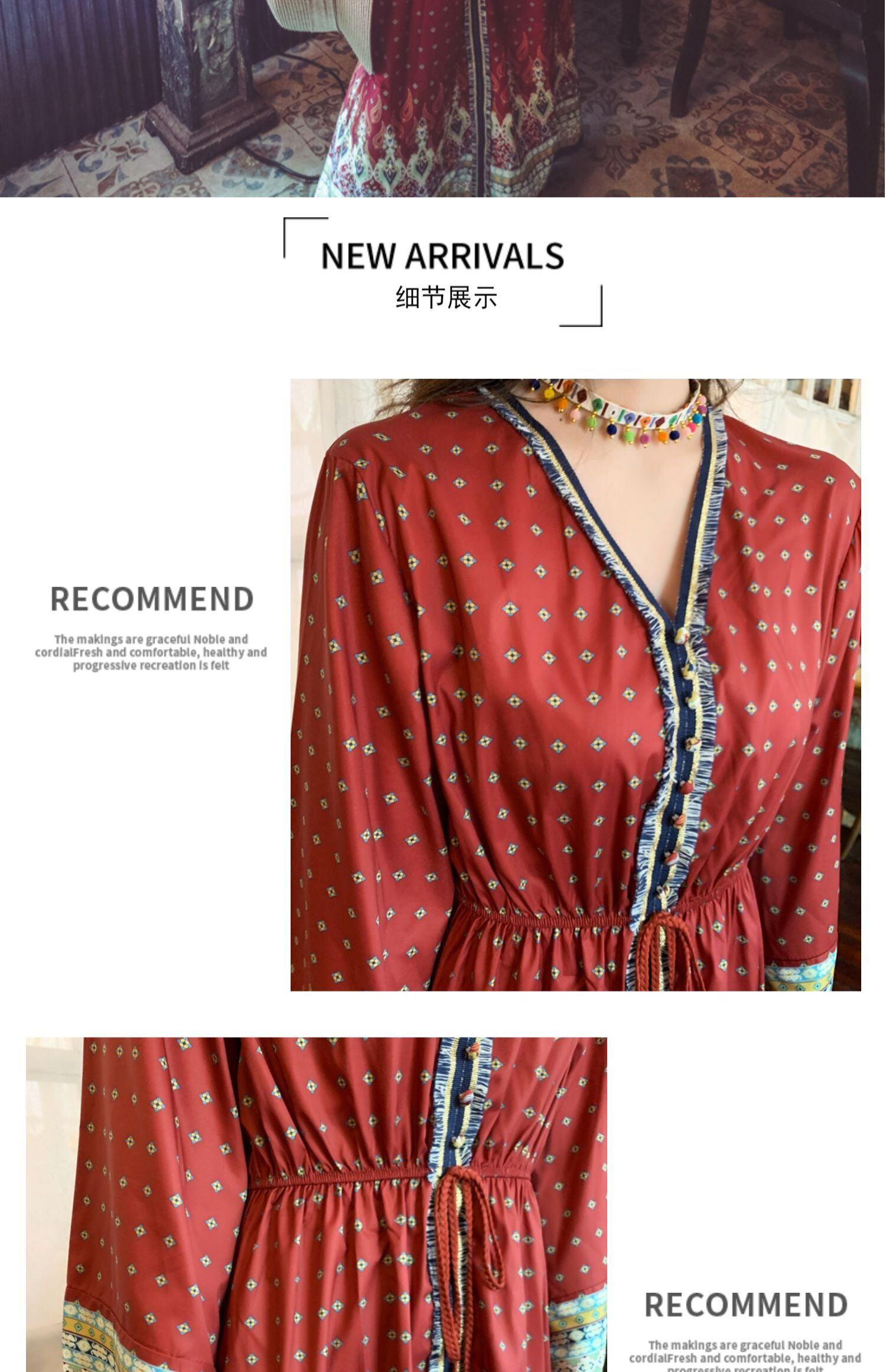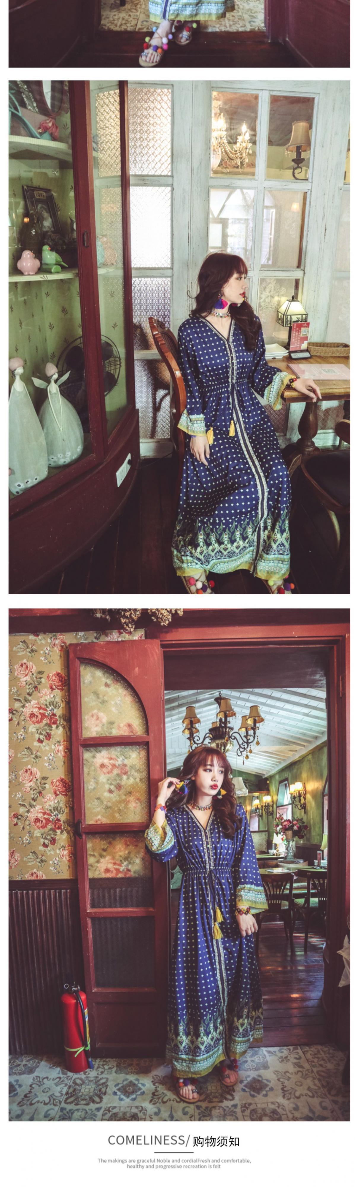 タイタイドブランドボヘミア三亜ビーチスカートエスニックスタイルレトロプリントVネックtelエラスティックバンドドレス 延命家ファッション1053677