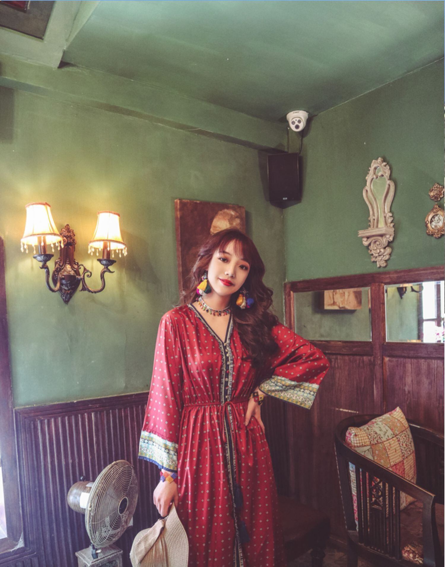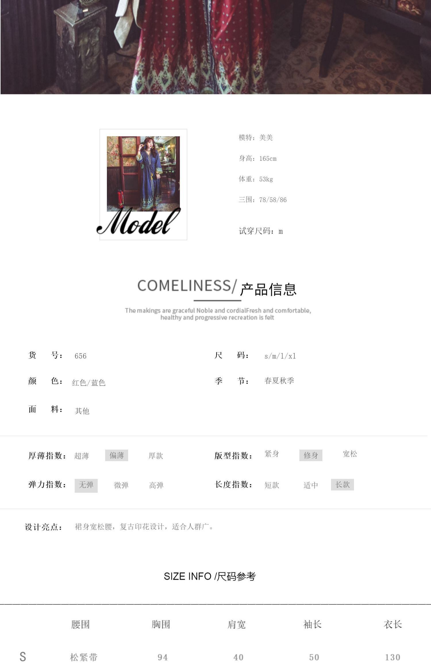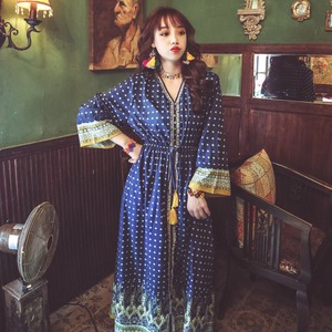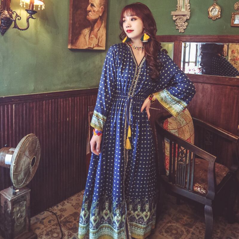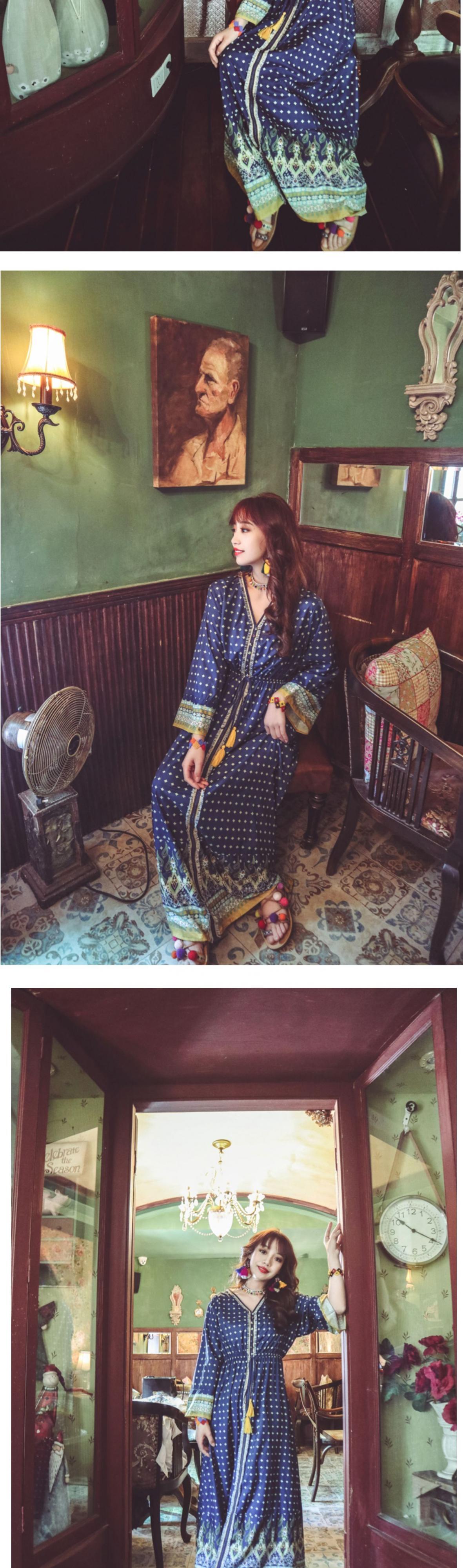 タイタイドブランドボヘミア三亜ビーチスカートエスニックスタイルレトロプリントVネックtelエラスティックバンドドレス 延命家ファッション1053677
