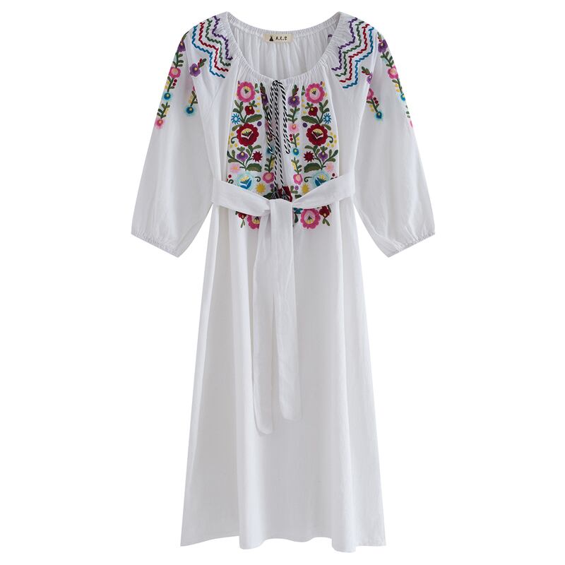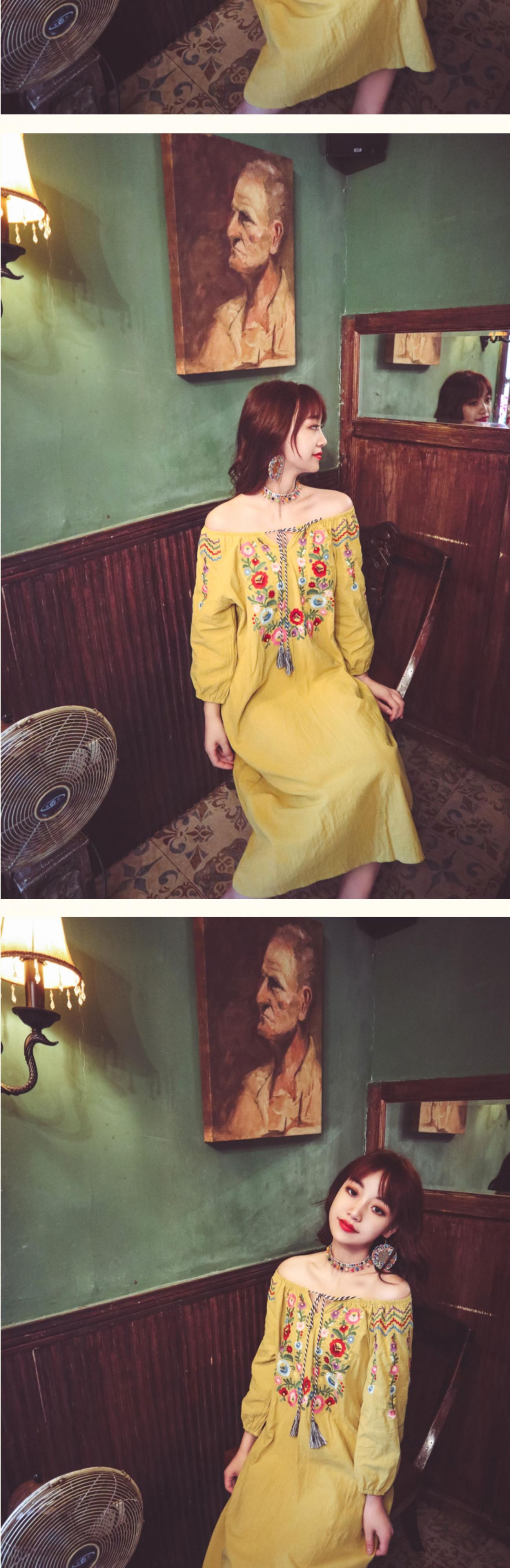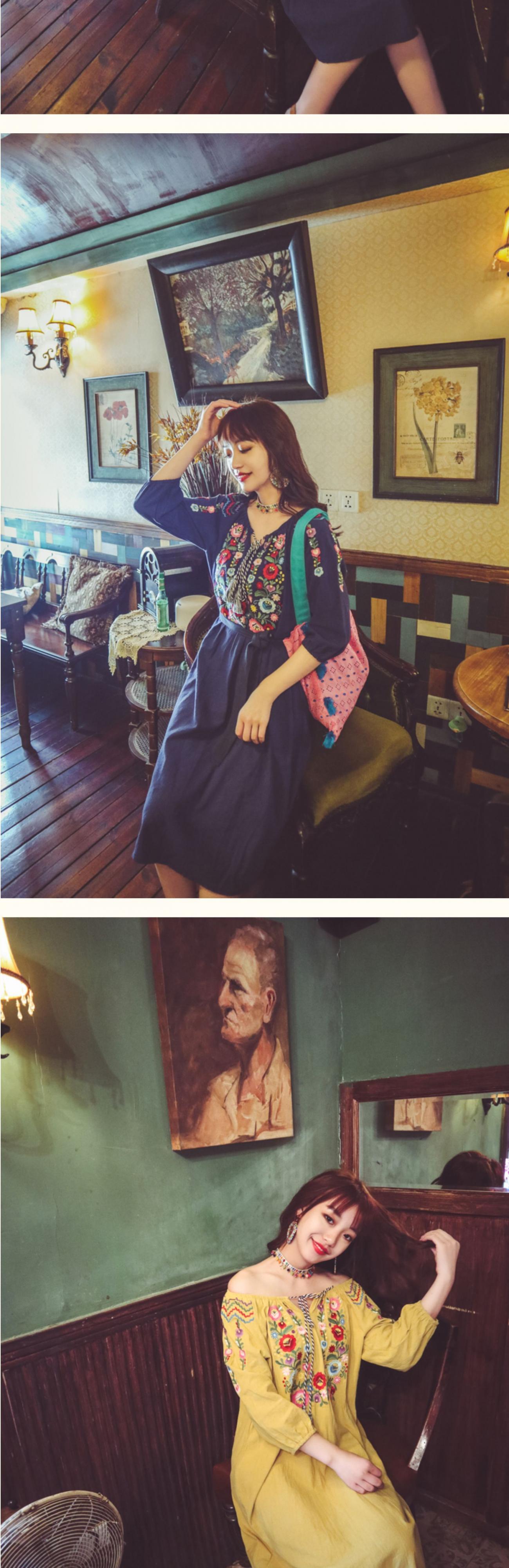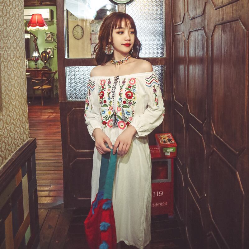 エスニックスタイルロングスカート ボヘミアン刺繍レースドレス サマー コットン 夏物 延命家ファッション1537115