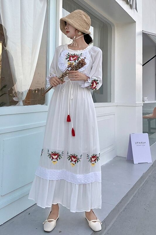 タイタイドブランドホリデーレトロ風ロングスカートネパール旅行s単語襟2着薄い刺繍女神ドレス 延命家ファッション2380898