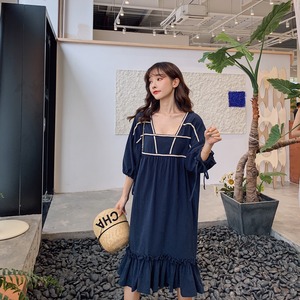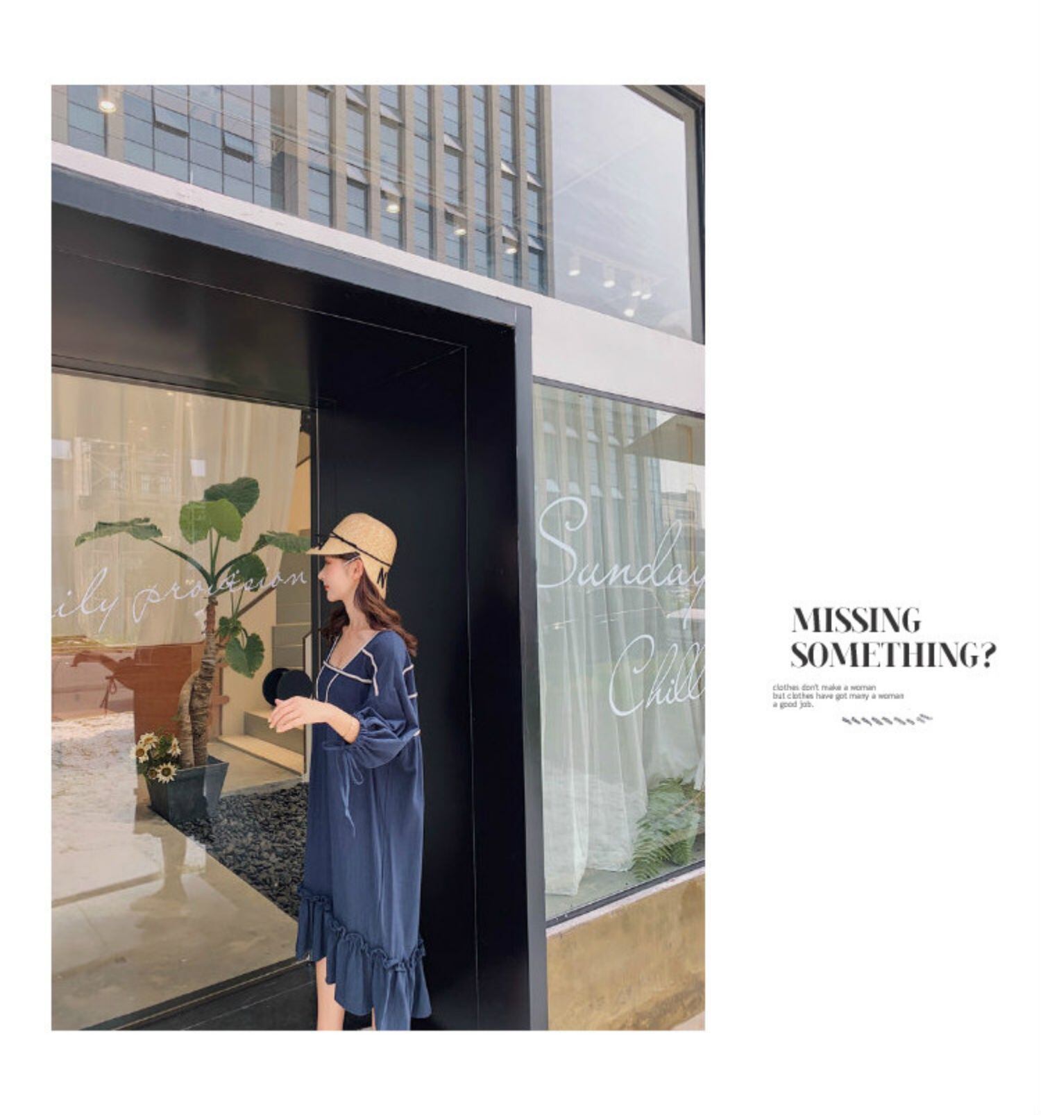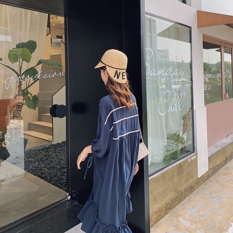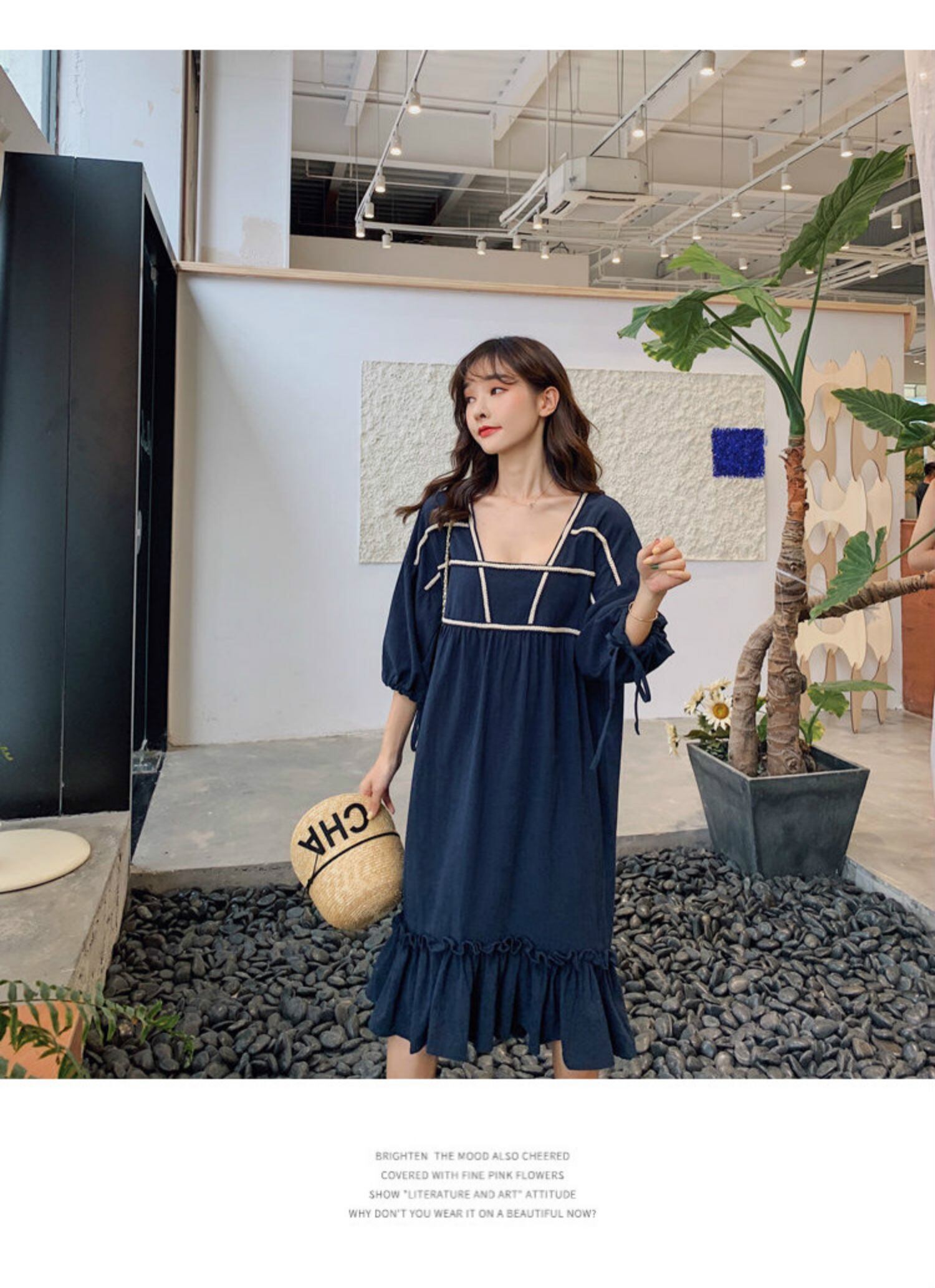 タイタイドブランドフレンチレトロスタイル秋新しいvネックスカートコントラストカラードローストリングリボンフリルコットンとリネンドレス 延命家ファッション3724318