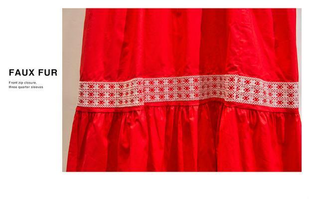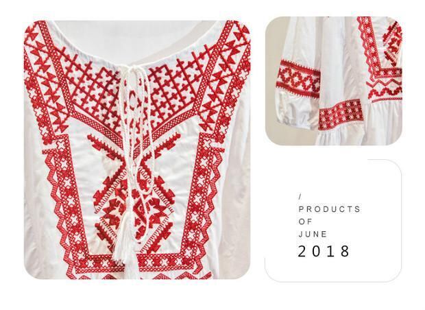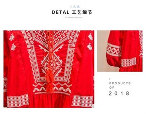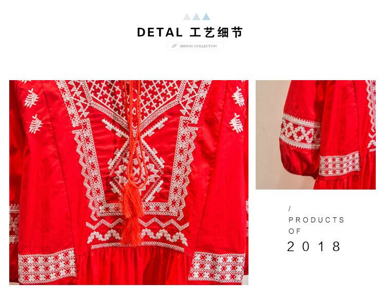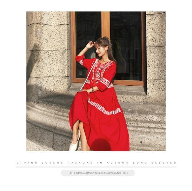 スプリングボヘミアンスタイルルーズドレス スカート レッド 刺繍 春物 延命家ファッション4744220