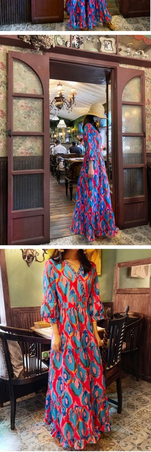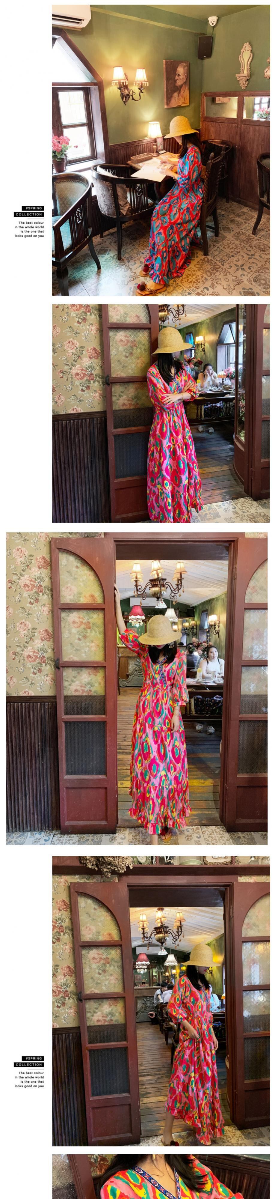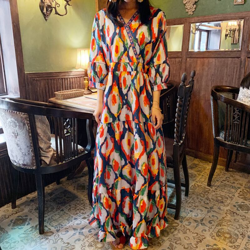 スタンダードロングスカート Vネックエスニック刺繍ドレス レトロ ビーチ 延命家ファッション0245763