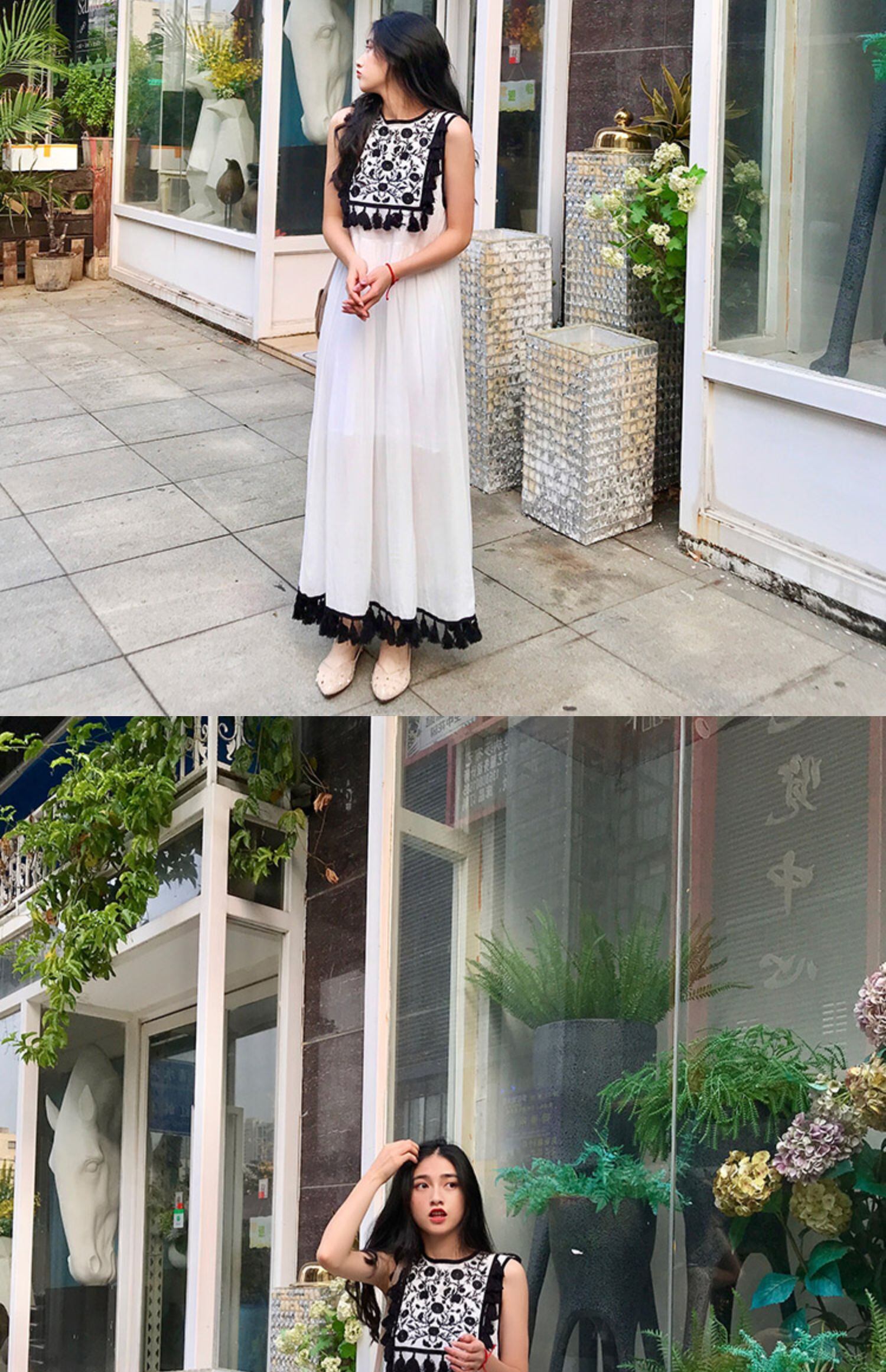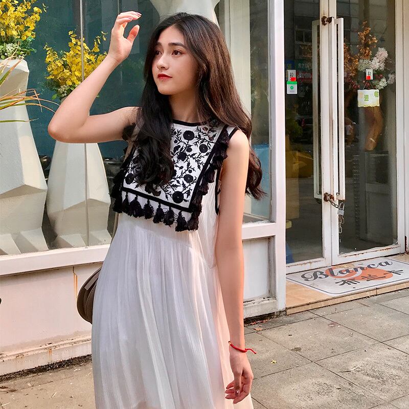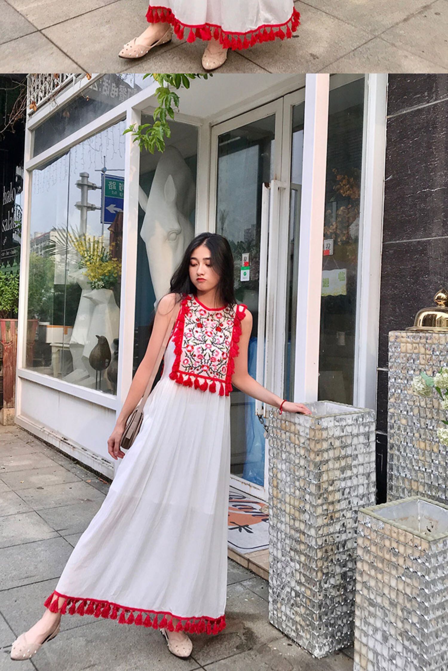 タイタイドブランドのホリデースタイルのレトロロングスカートネパール旅行スカート花刺繍フリンジサイドベストビーチロングスカート 延命家ファッション3689489
