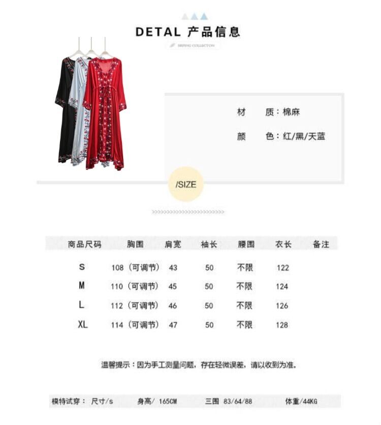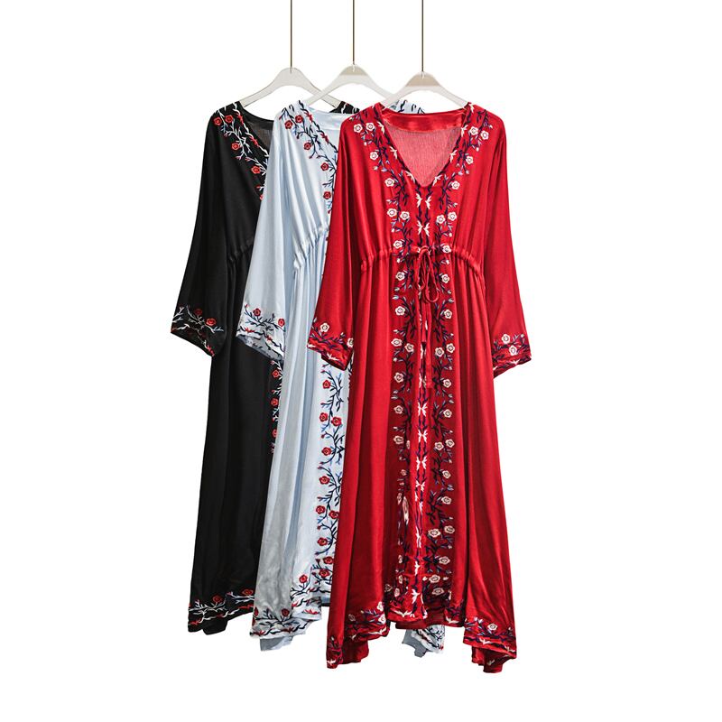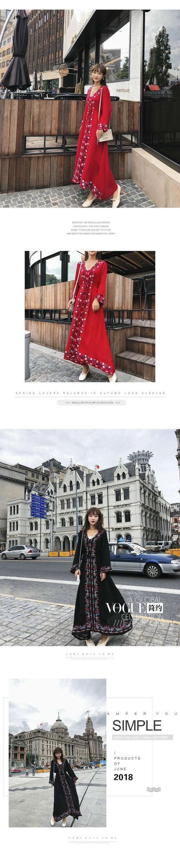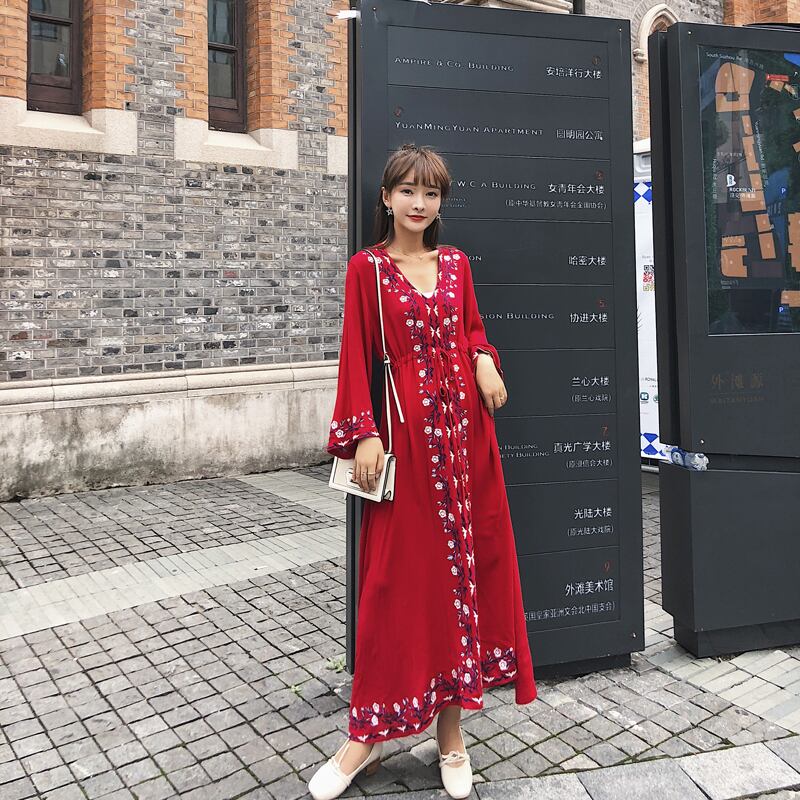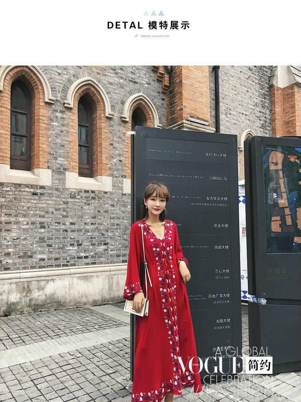 スプリングサマーボヘミアン薄手ドレス レディース レッド コットン 刺繍 大きめサイズ 春物 夏物 延命家ファッション8895961