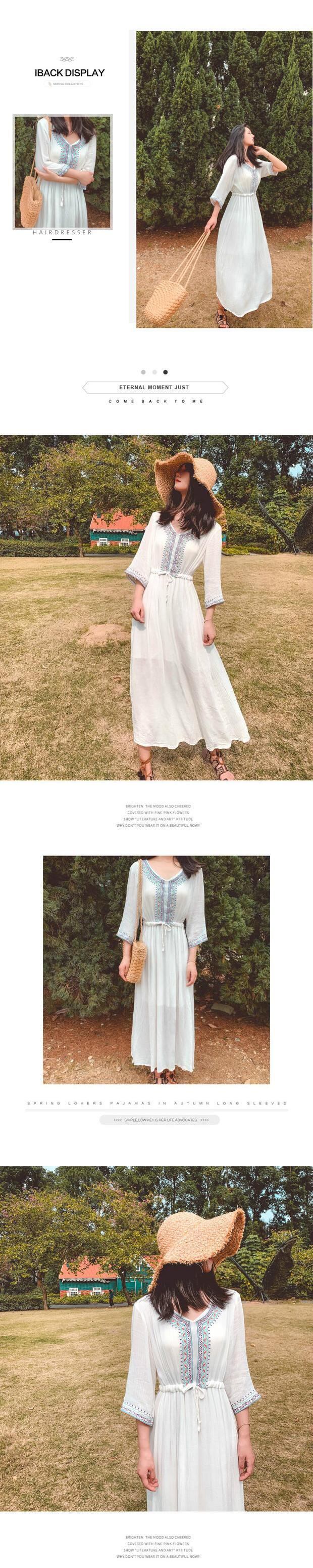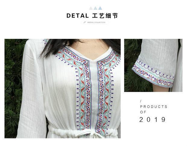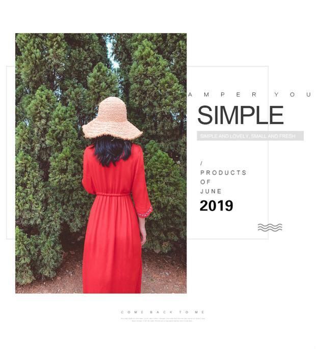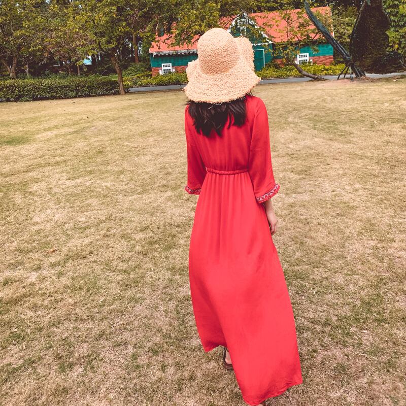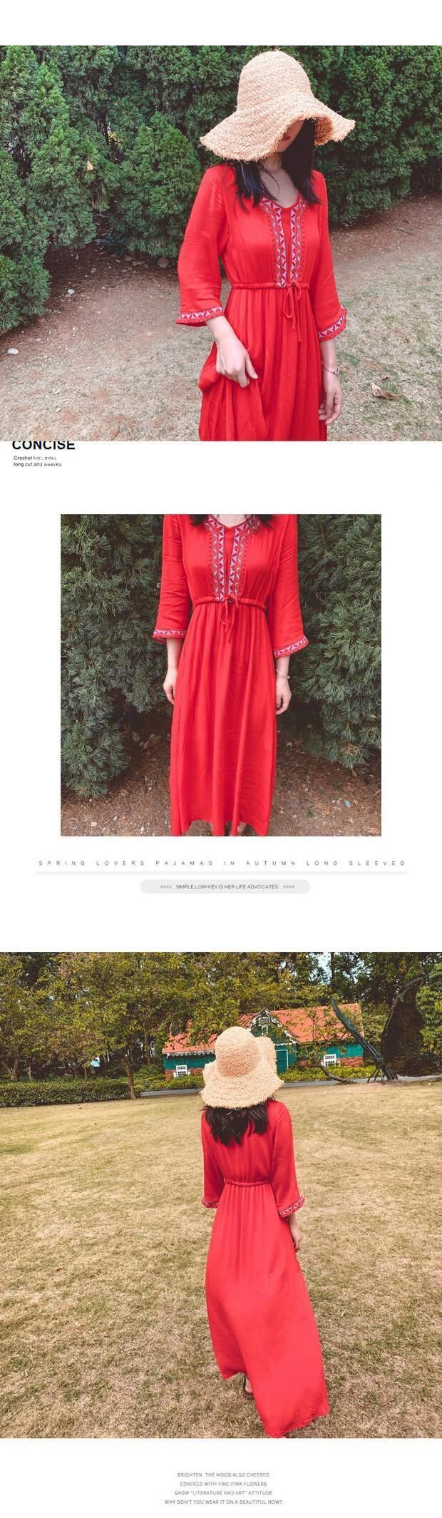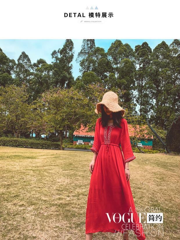 エスニックスタイルドレス サマーレッドロングスカート ルーズ薄手刺繍 コットン 夏物 ビーチ 延命家ファッション9712631