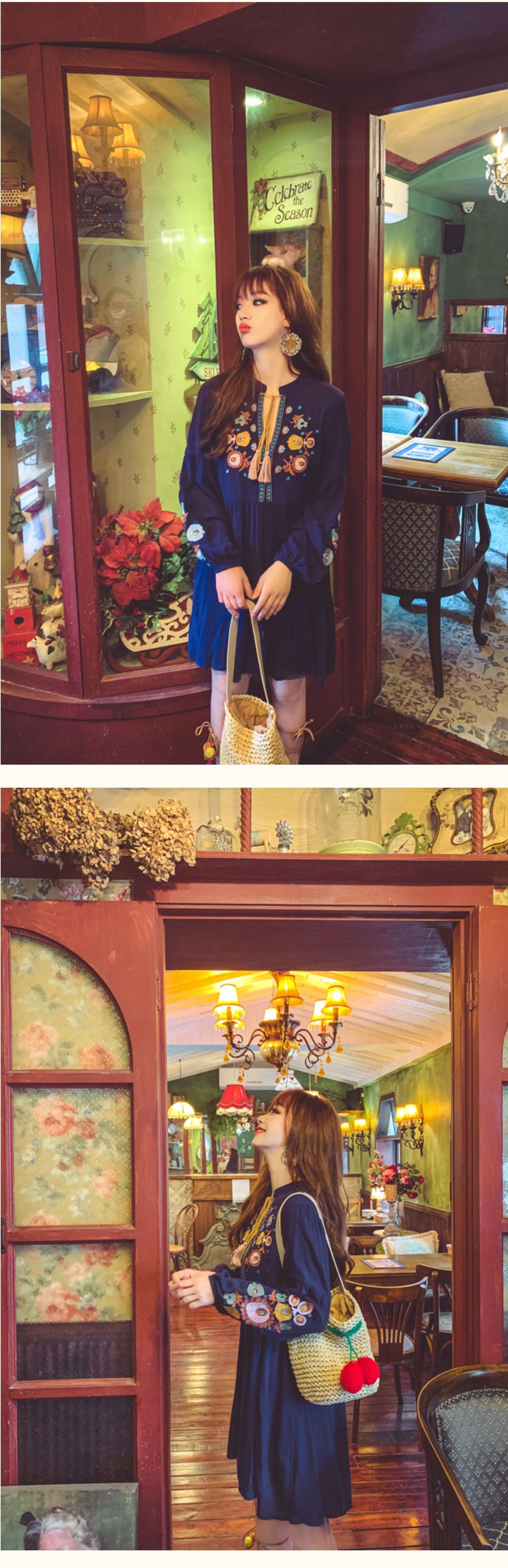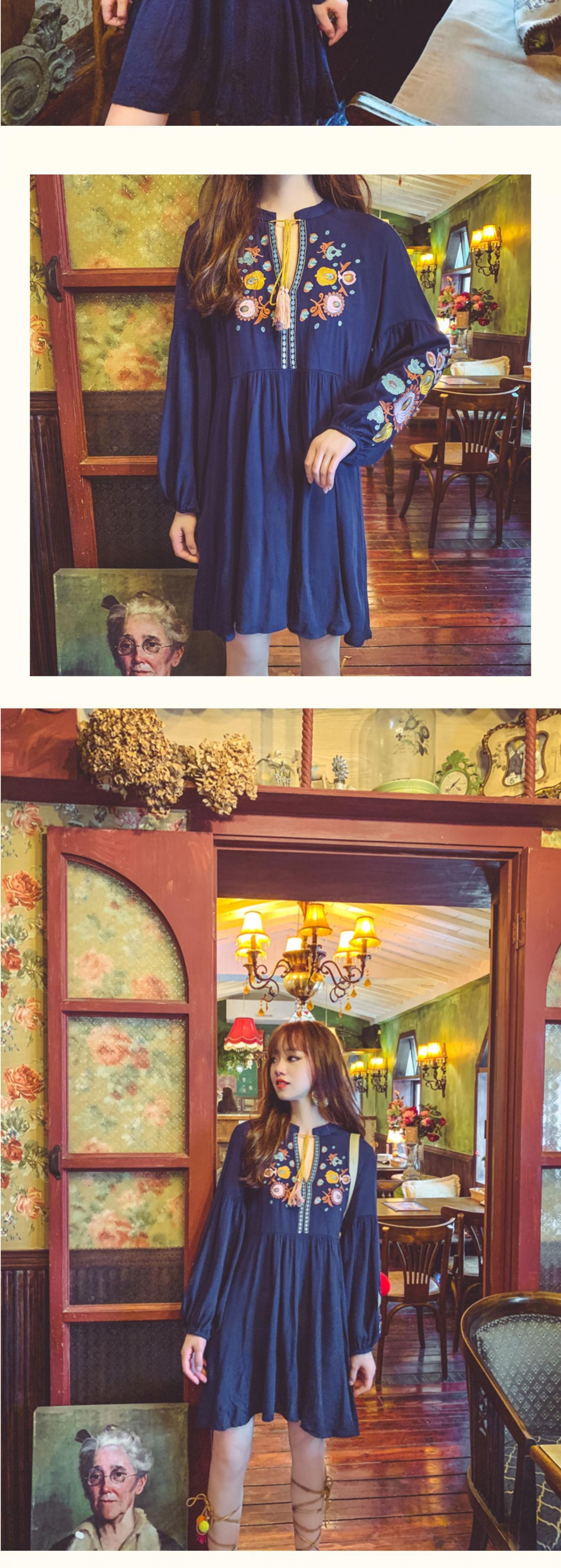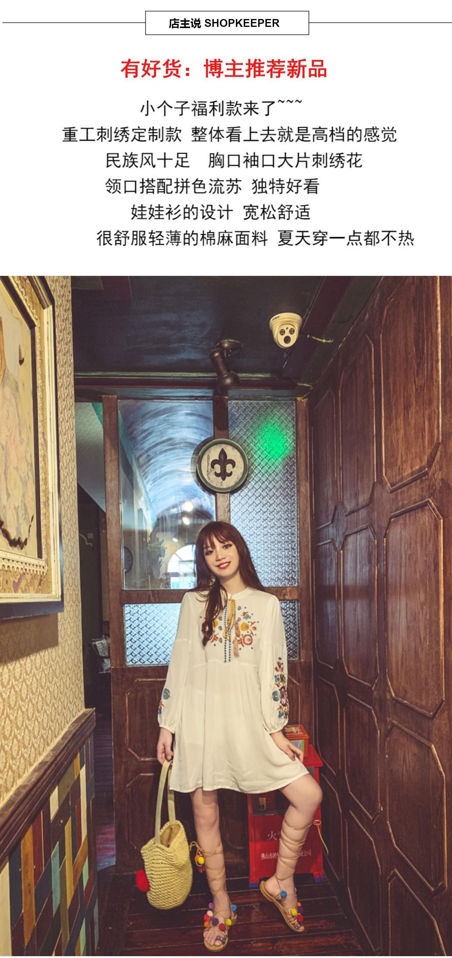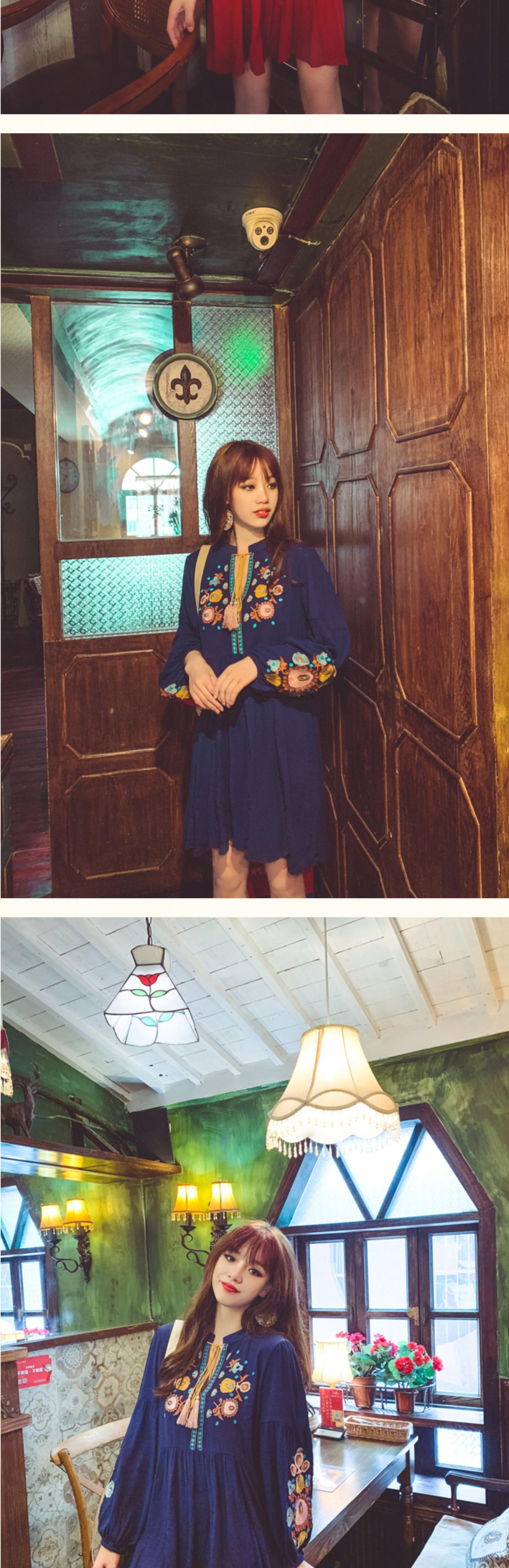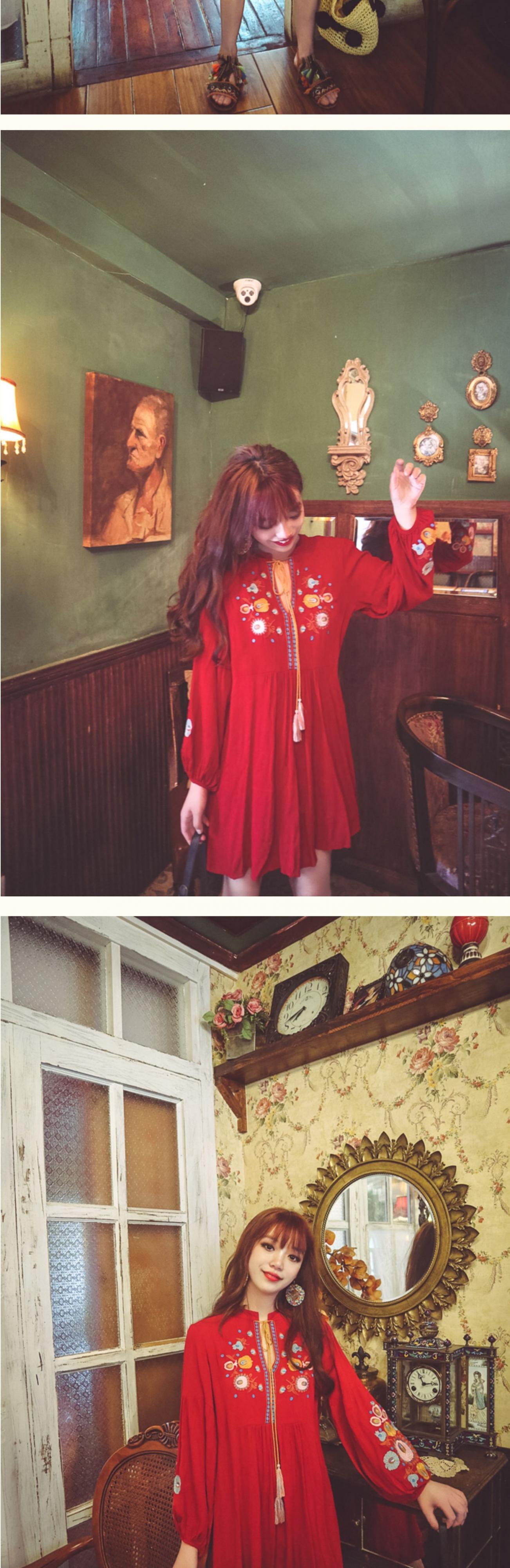 ボヘミアンスカート 刺繍ショートエスニックスタイルVネックスリーブドレス ランタンスリーブ ビーチ 延命家ファッション9630638