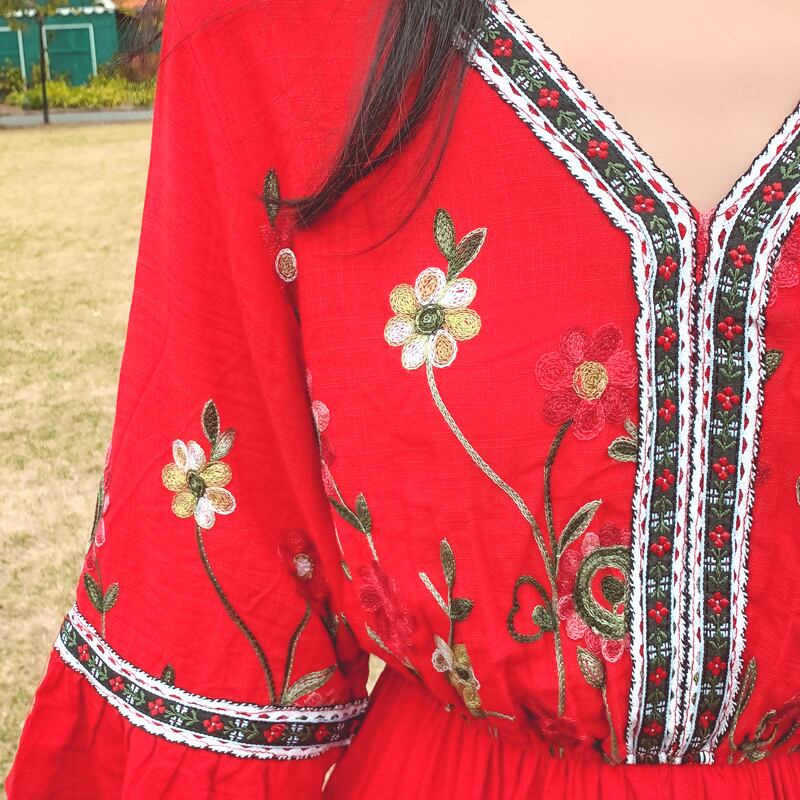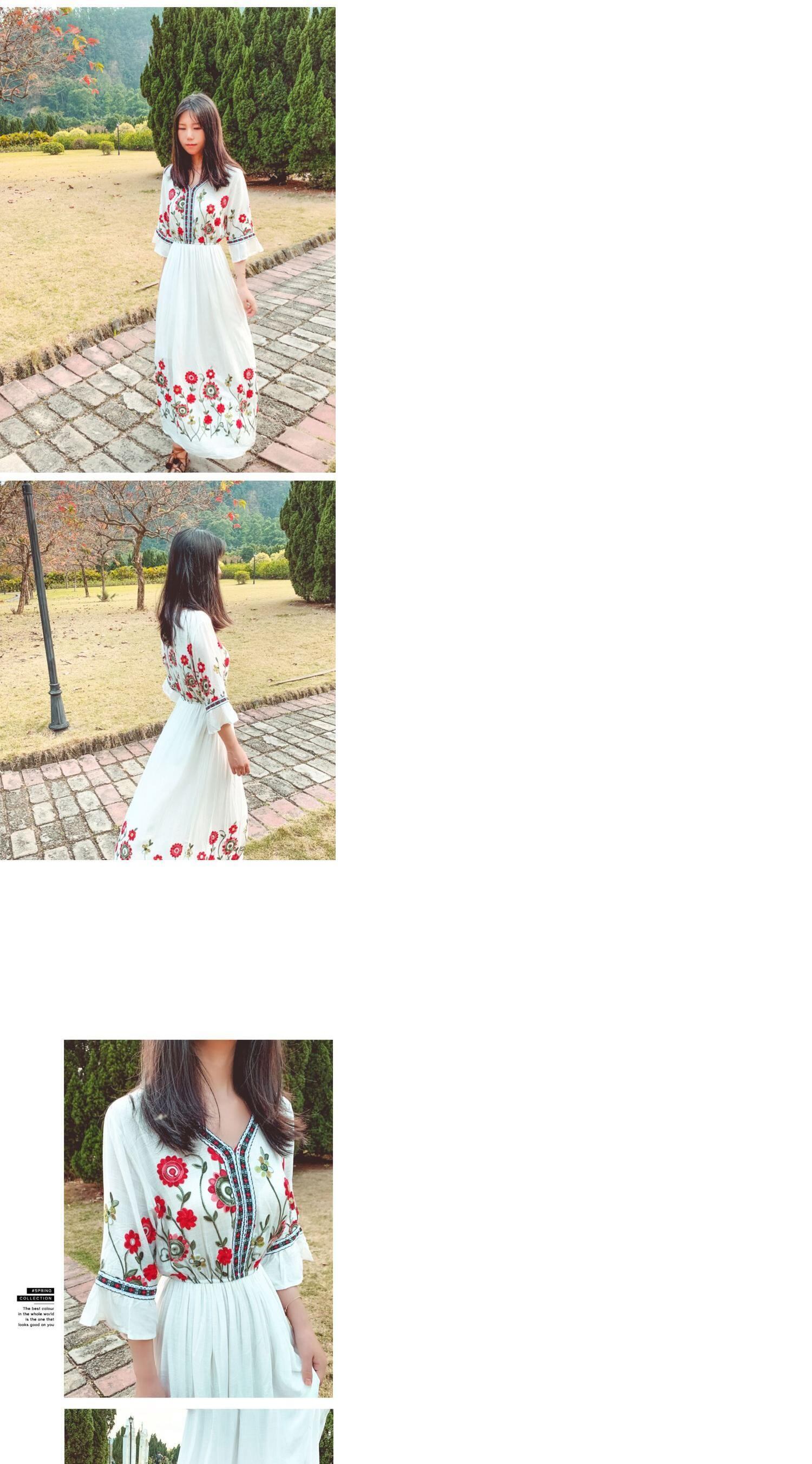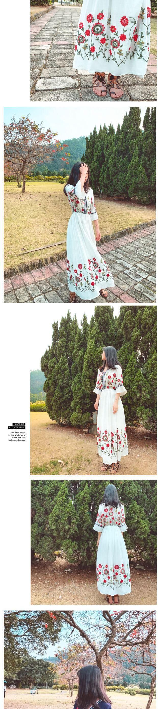 スタンダードロングスカート サマーエスニックスタイル刺繍ウェストVネックドレス コットン レトロ 大きめサイズ 夏物 延命家ファッション7380962