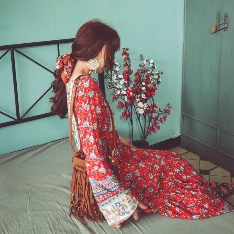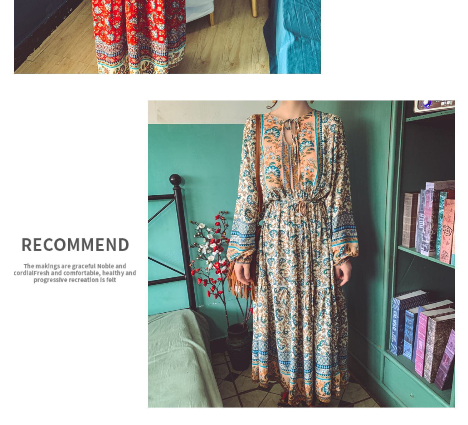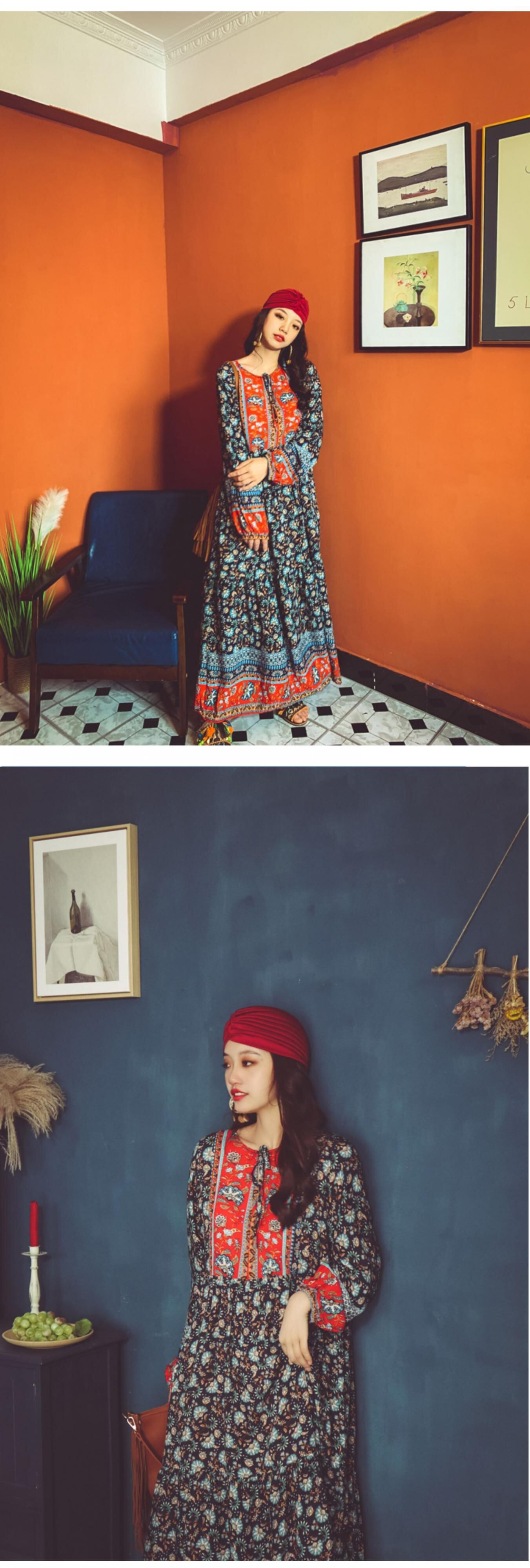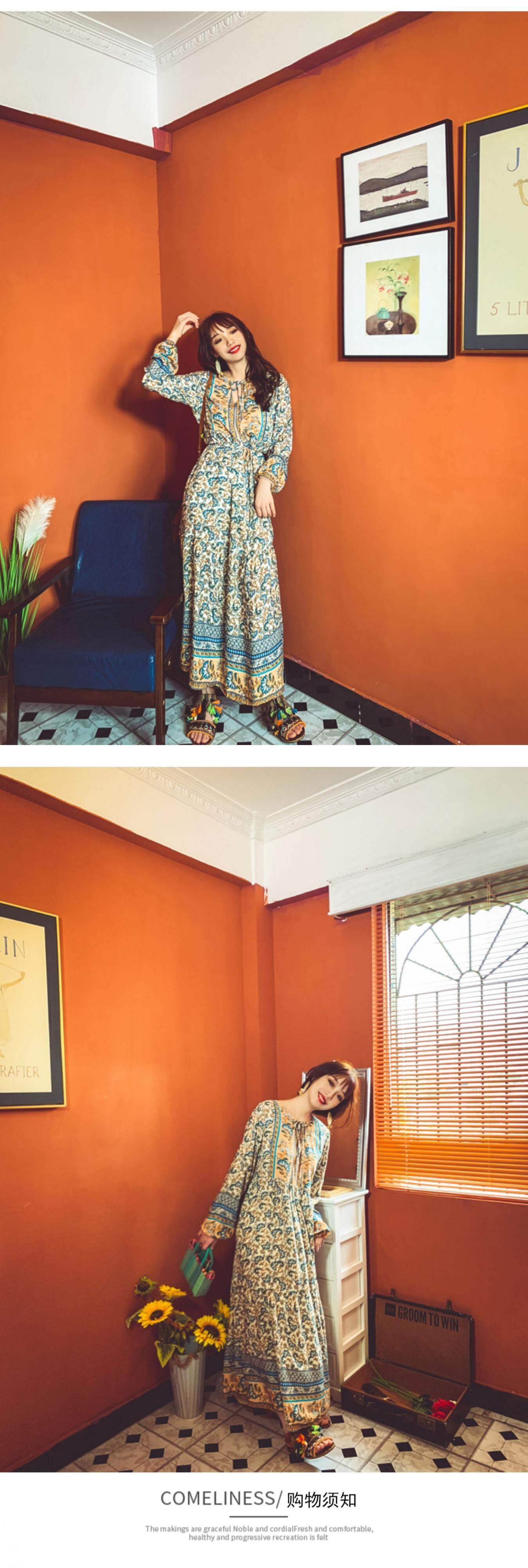 サマースタンダードロングスカート ボヘミアンプリントハイウェストルーズレースドレス レトロ 夏物 延命家ファッション5337663