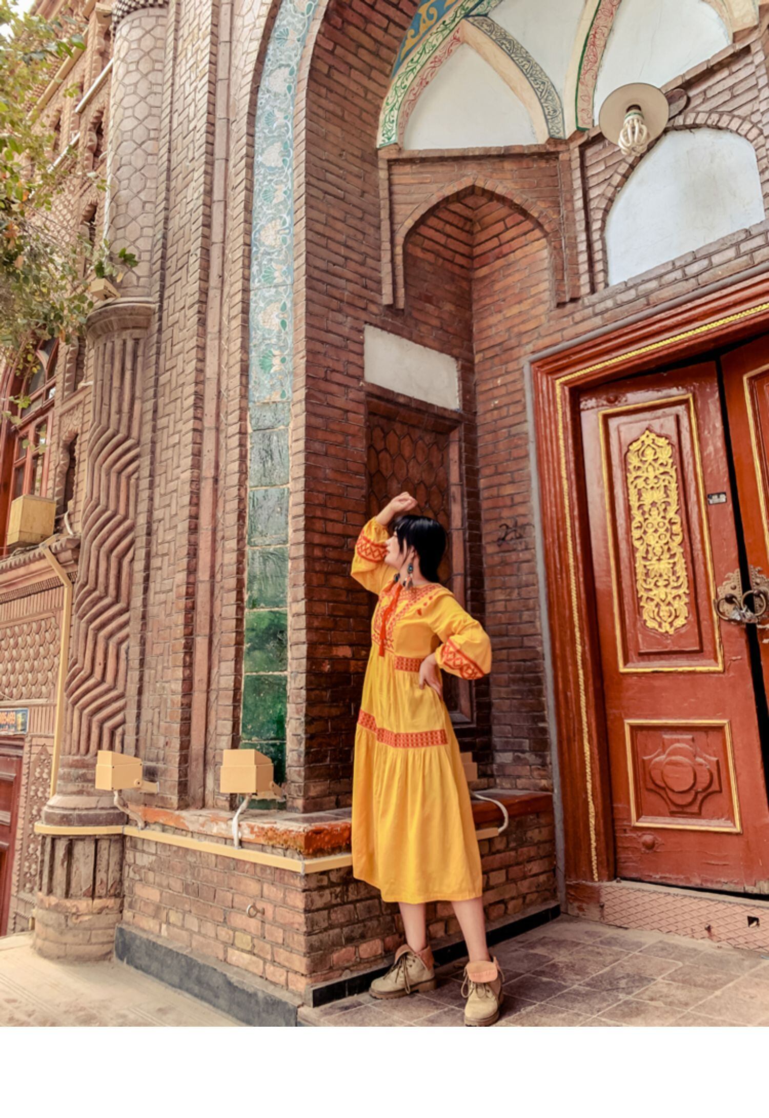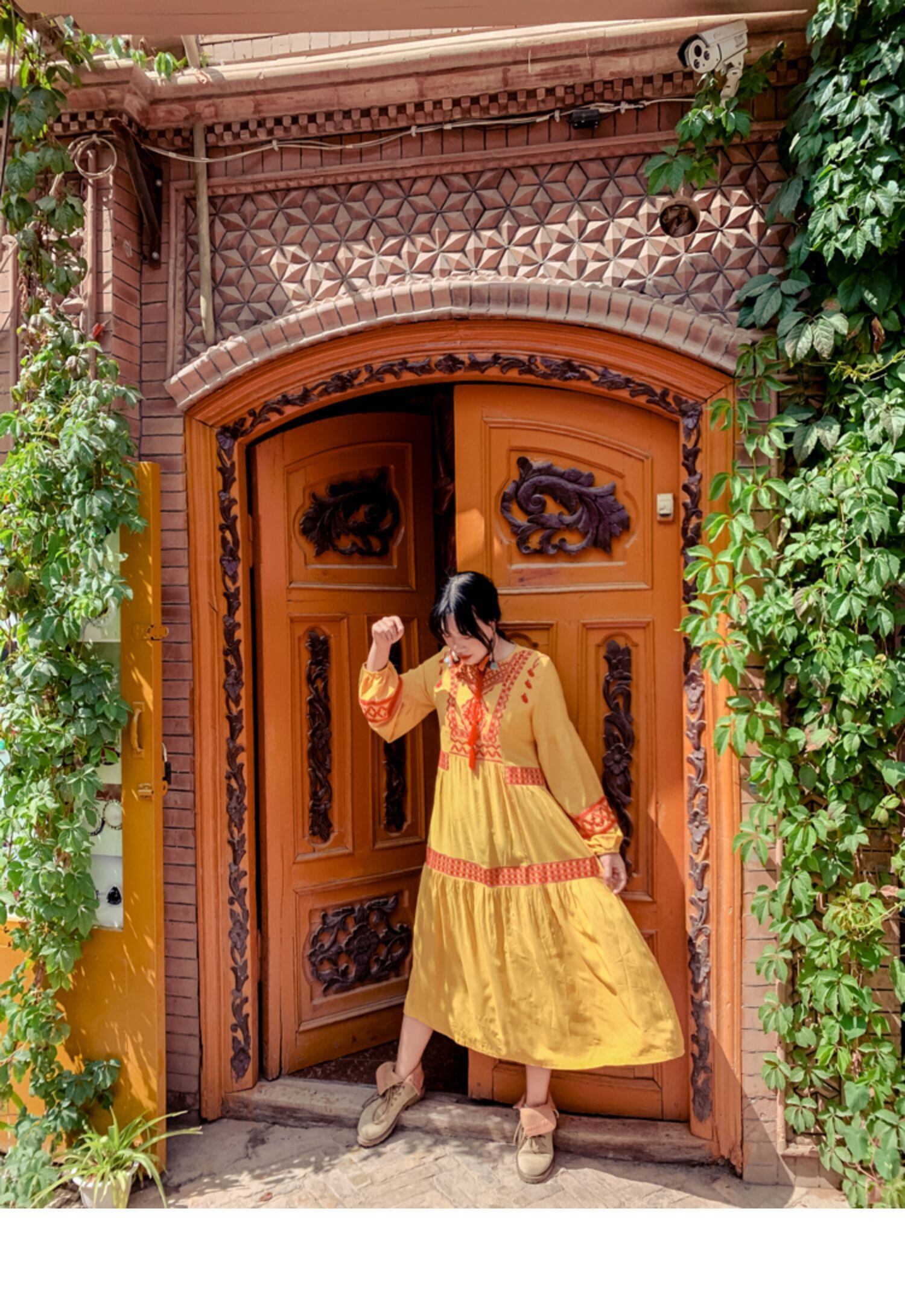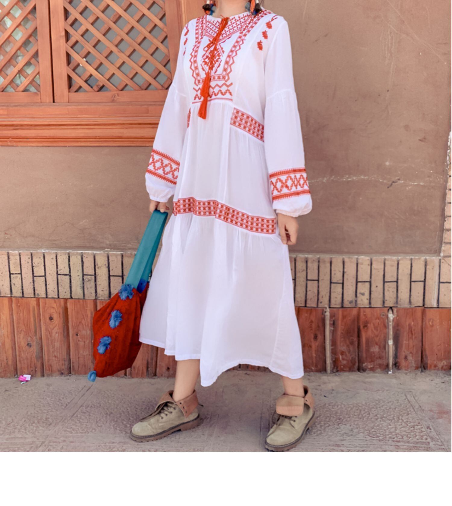 タイタイドブランドロングスカートボヘミアホリデーエスニック風フリンジランタンロングスリーブ刺繍ホリデールーズドレス 延命家ファッション1161039