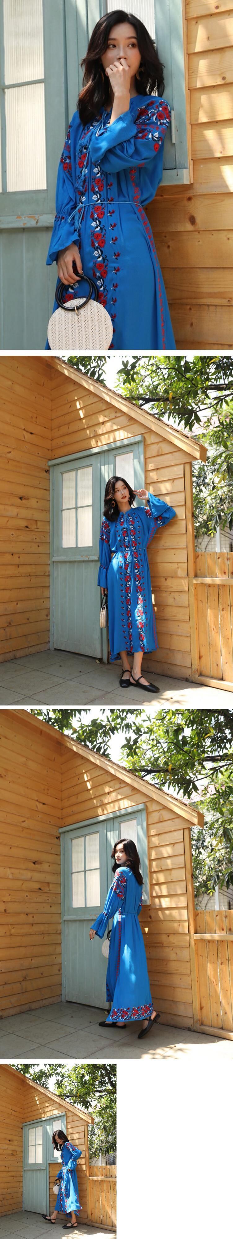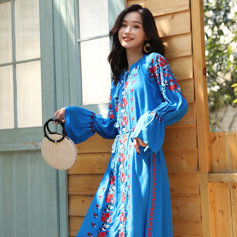 刺繍スリットボヘミアンスタンダードロングスカート エスニックスタイルドレス レトロ 延命家ファッション2478679