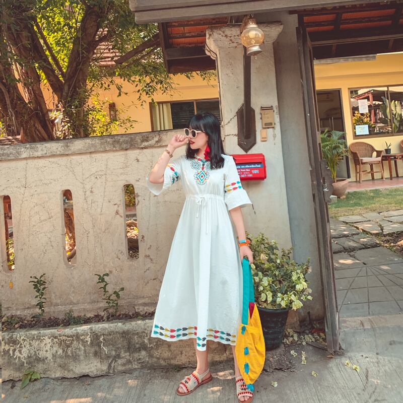タイ旅行島ビーチスカートボヘミアンエスニック刺繍Vネックコットンとリネン緩いホリデードレス夏 延命家ファッション4552623