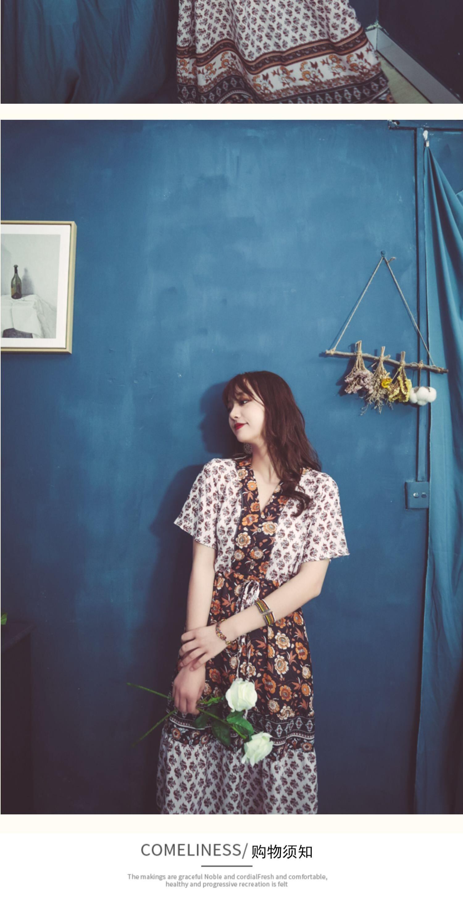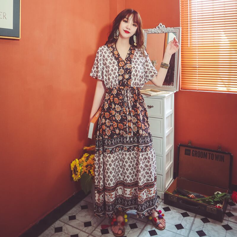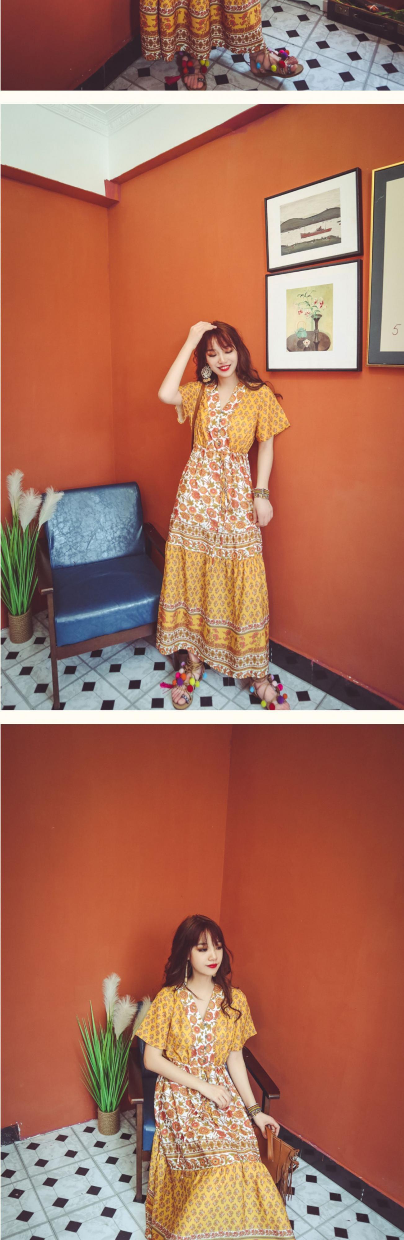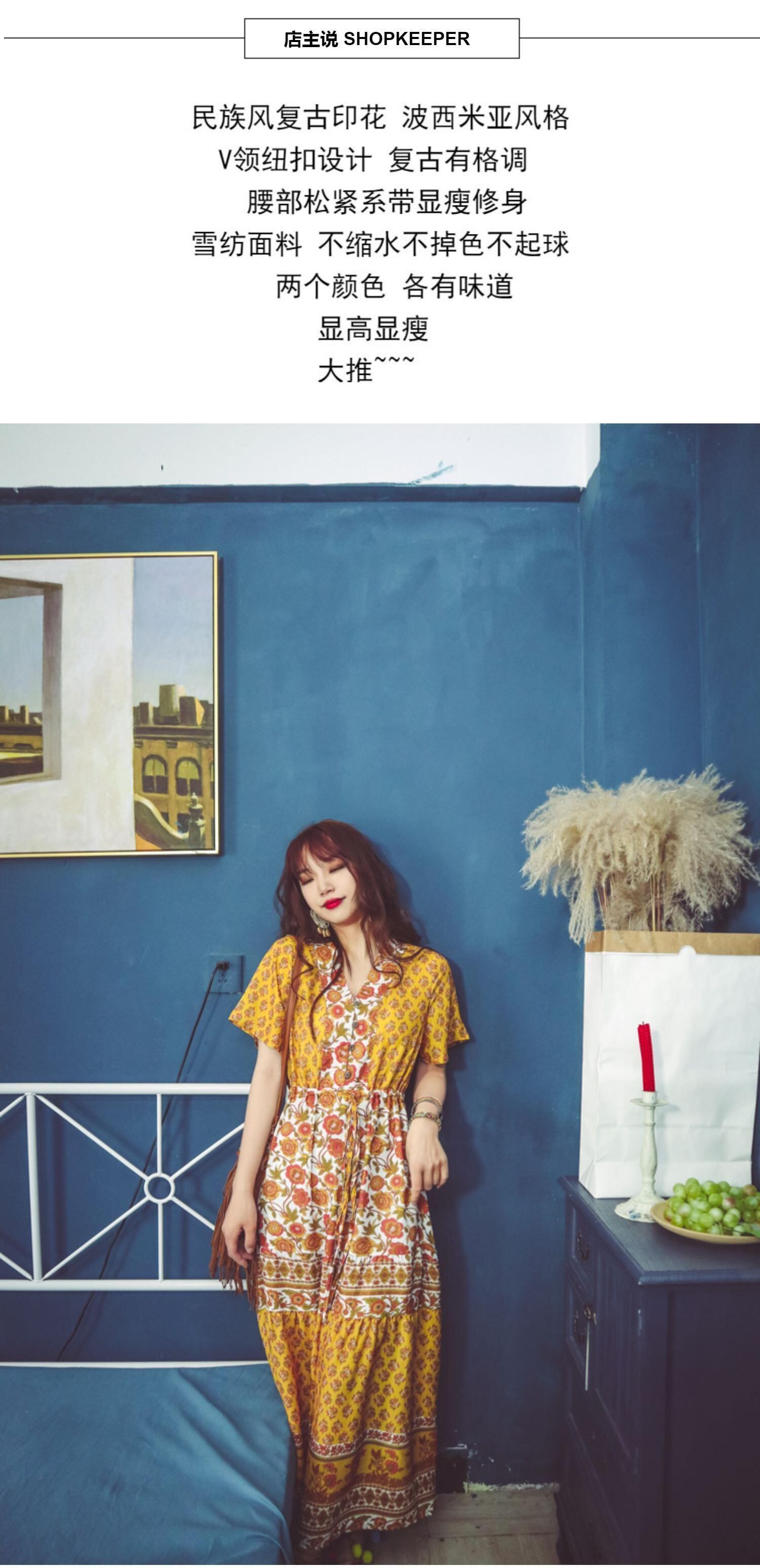 サマーボヘミアンスタンダードエスニックプリント柄Vネックボタンウェスト薄手ドレス レトロ 夏物 延命家ファッション3961816
