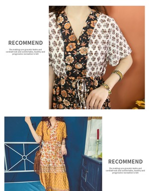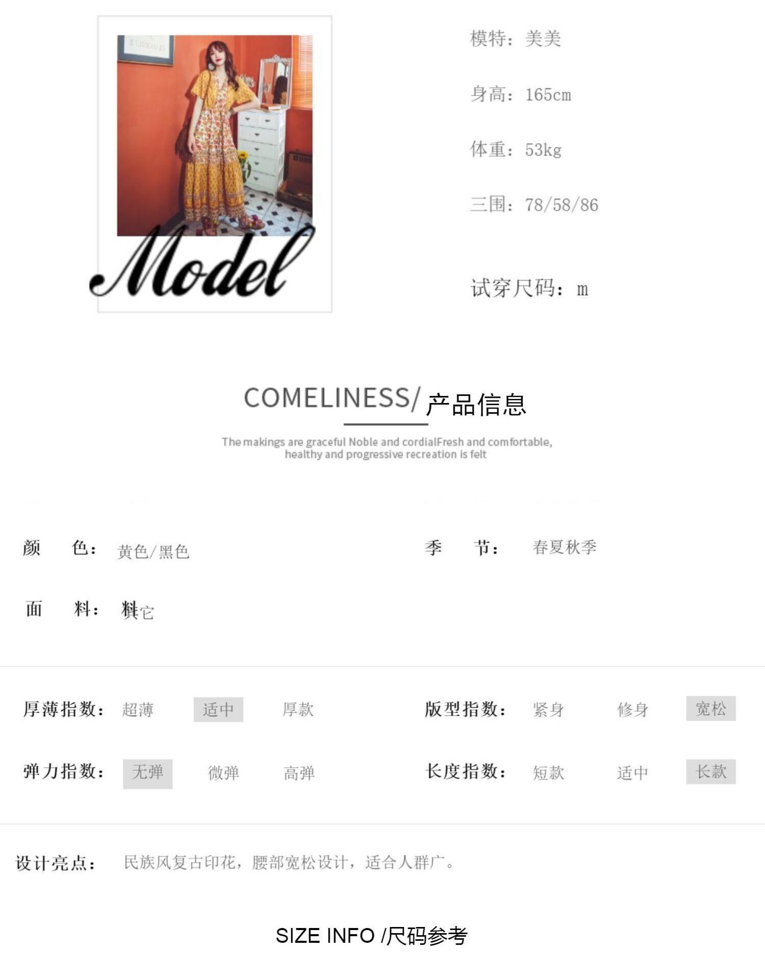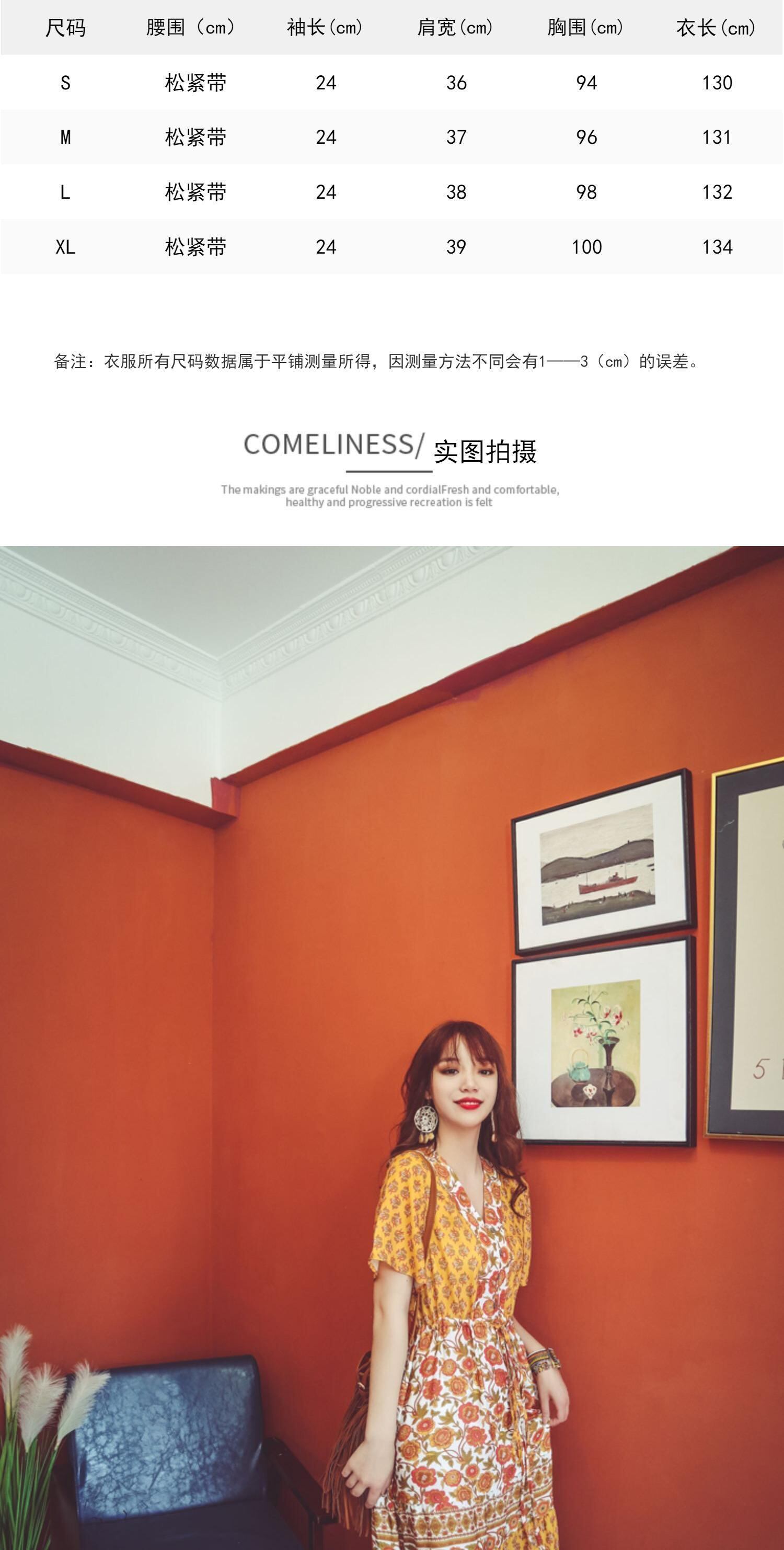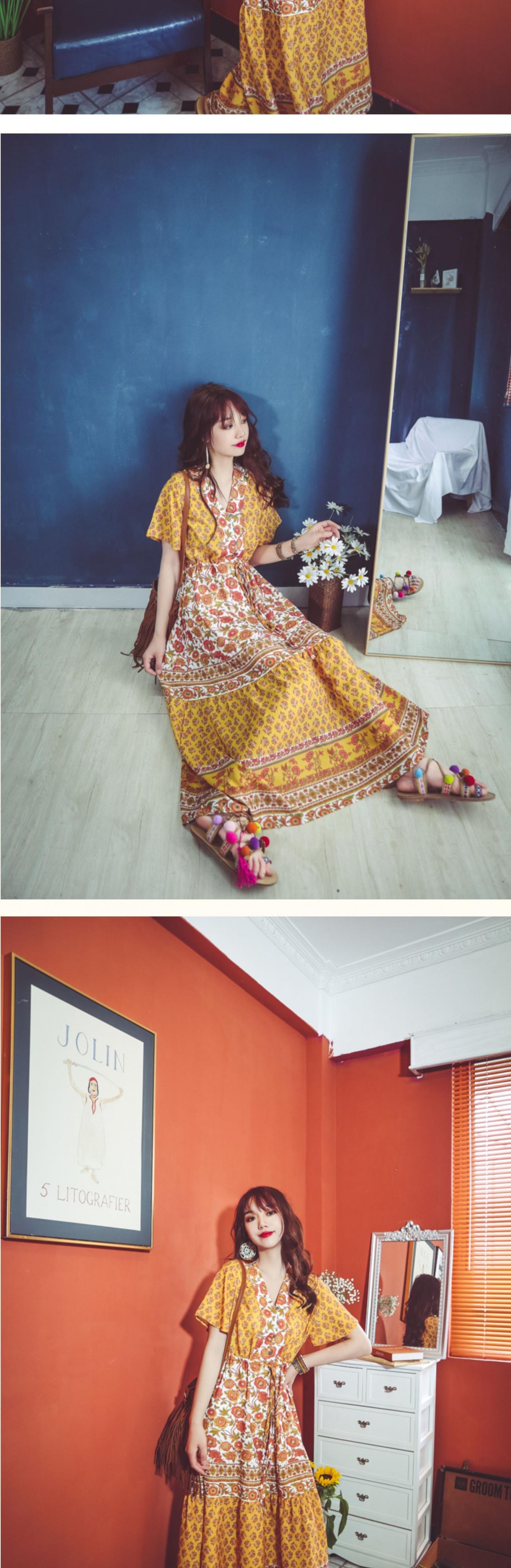 サマーボヘミアンスタンダードエスニックプリント柄Vネックボタンウェスト薄手ドレス レトロ 夏物 延命家ファッション3961816