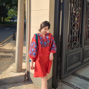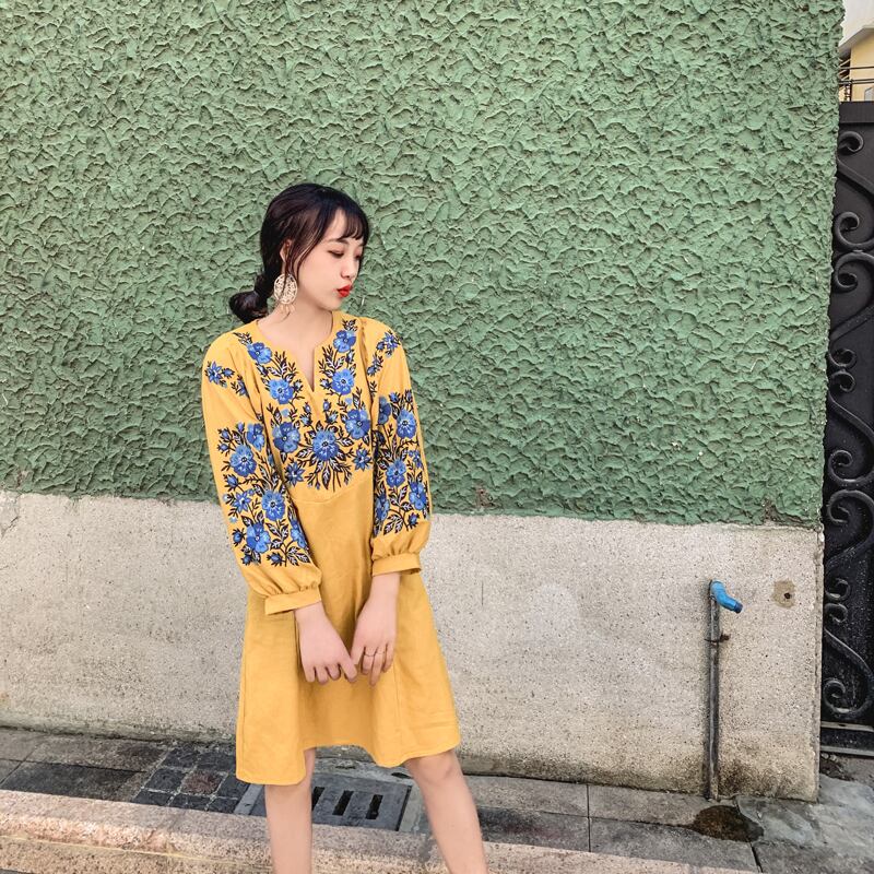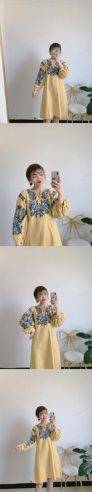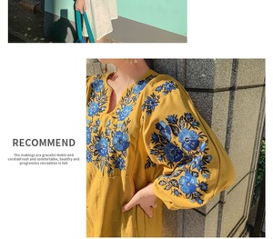 スタンダードショートスカート 刺繍Flowerデザイン スリーブVネックドレス ランタンスリーブ レトロ ビーチ フラワーデザイン 延命家ファッション4245160