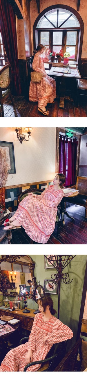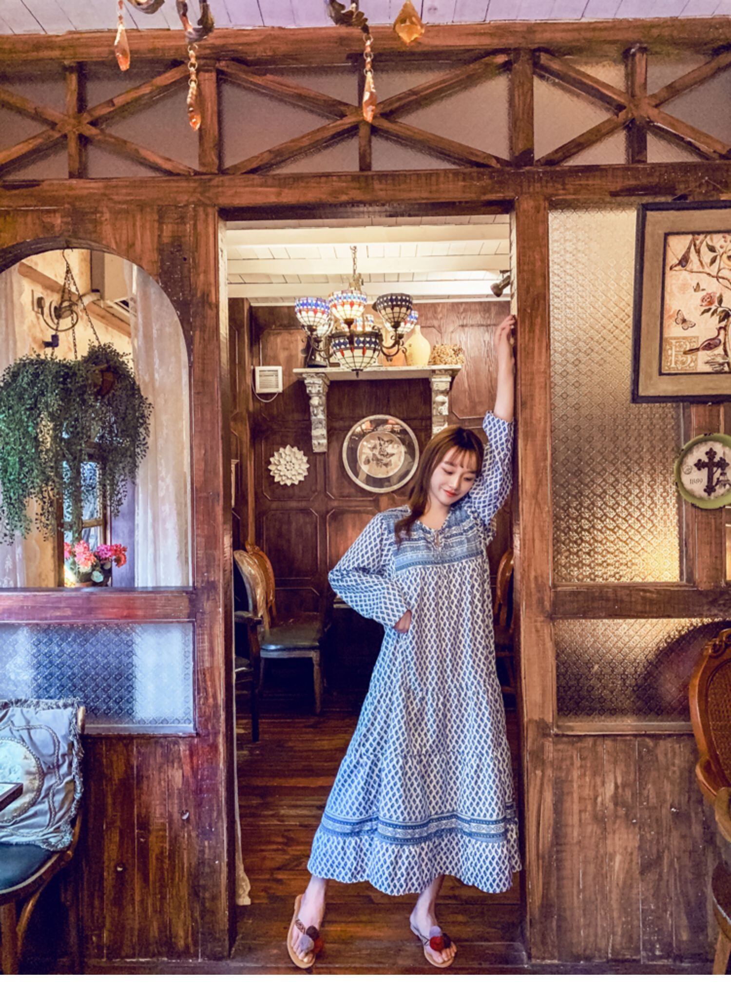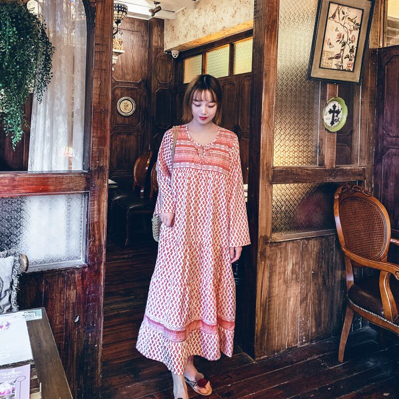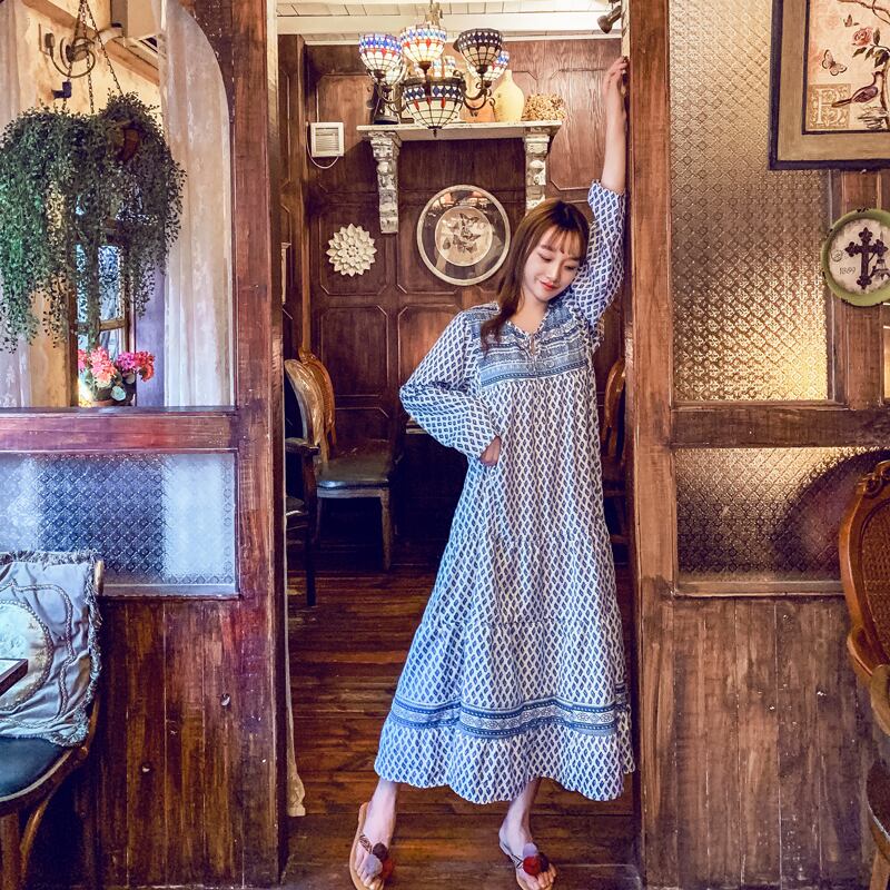 タイタイドブランドボヘミアンバケーションレトロロングスカートスタイルレースアッププリント長袖ロング丈ゆったり大きいサイズドレス 延命家ファッション0659304