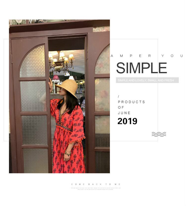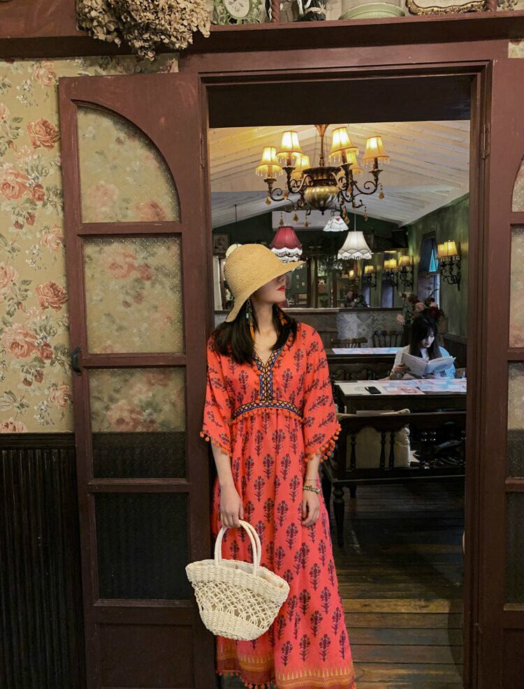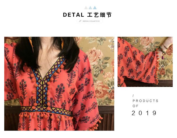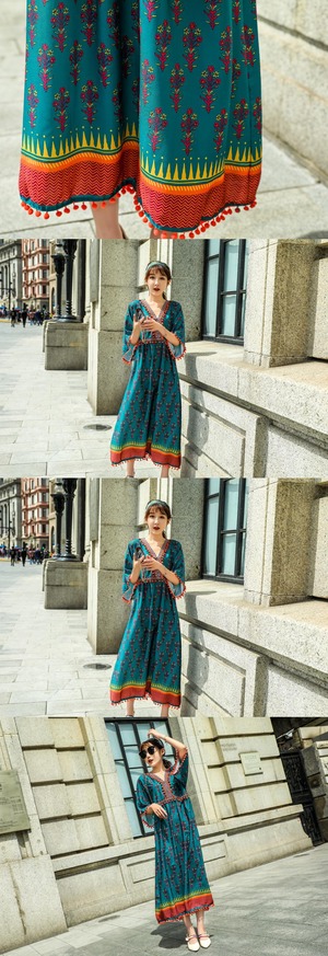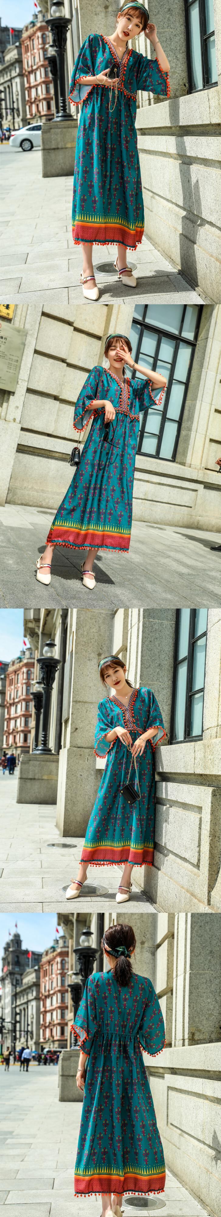 スタンダードロングスカート サマースタイルVネックファー刺繍ハイウェストウェストドレス レトロ 夏物 延命家ファッション5420820