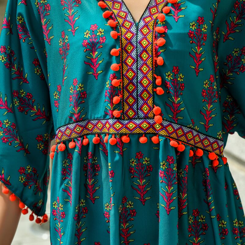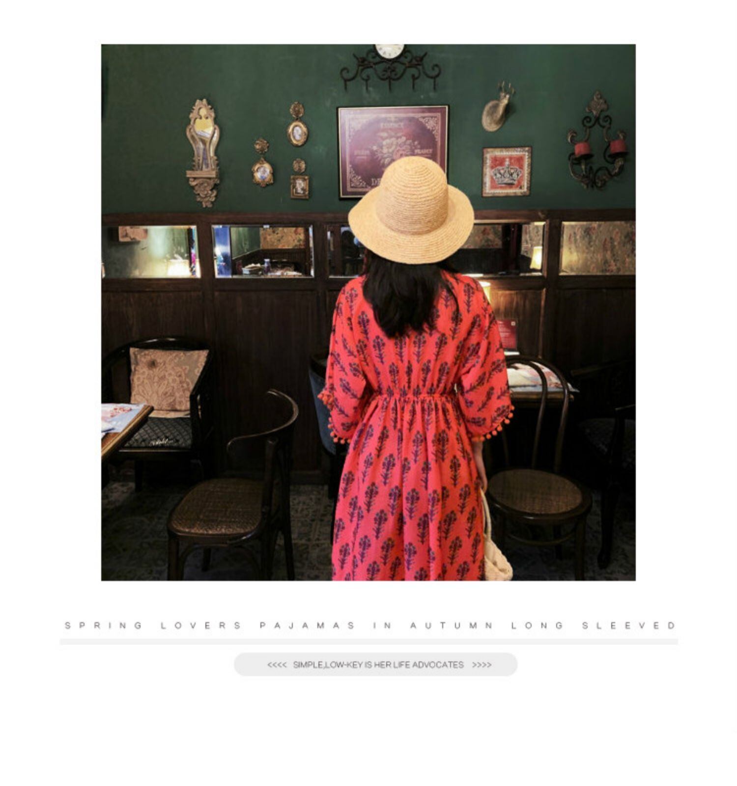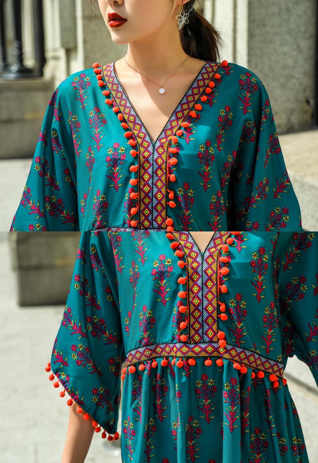 スタンダードロングスカート サマースタイルVネックファー刺繍ハイウェストウェストドレス レトロ 夏物 延命家ファッション5420820