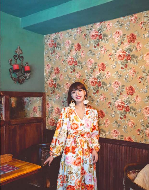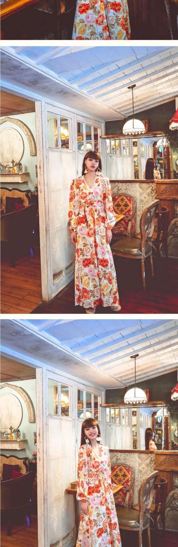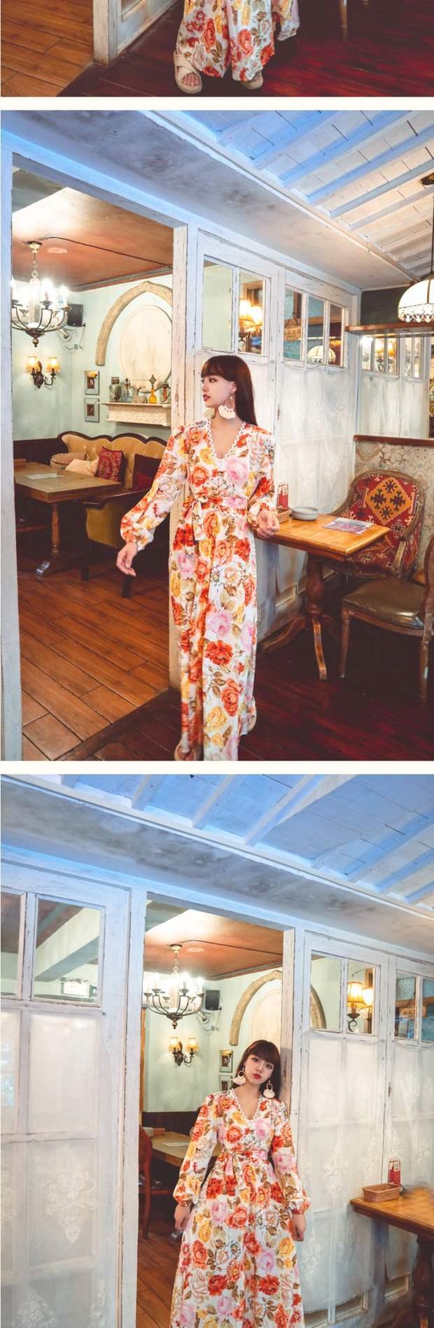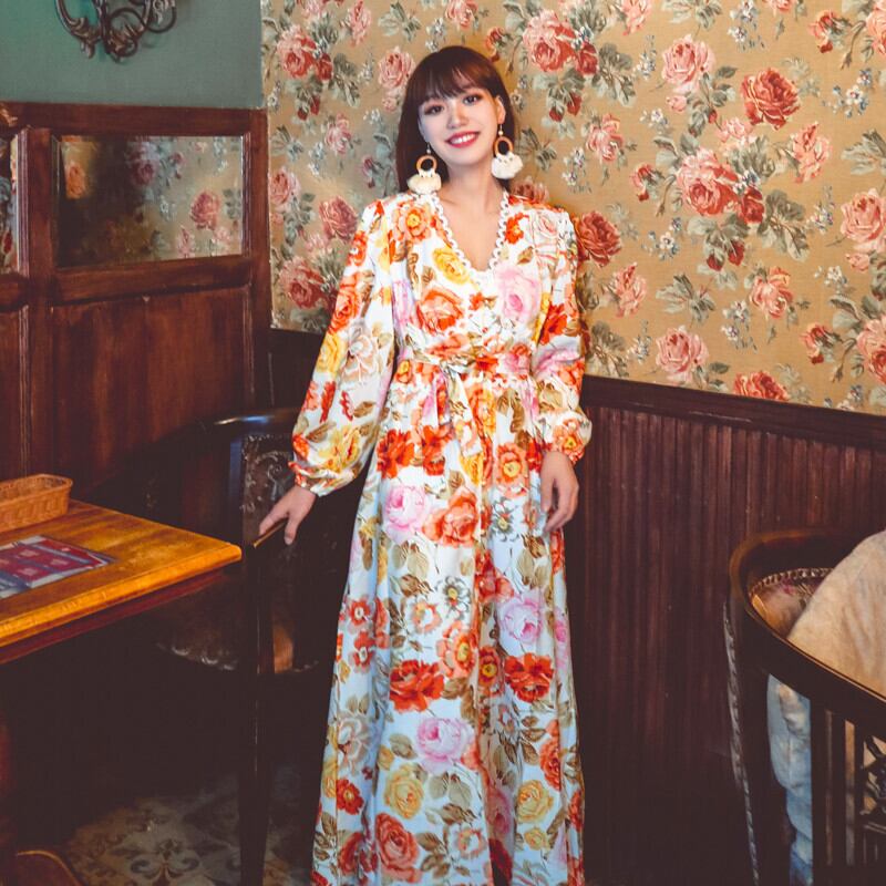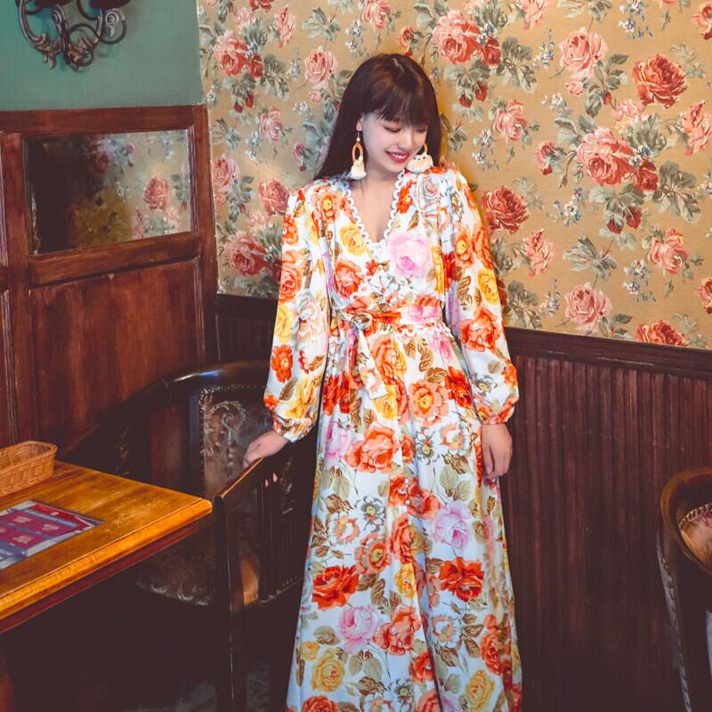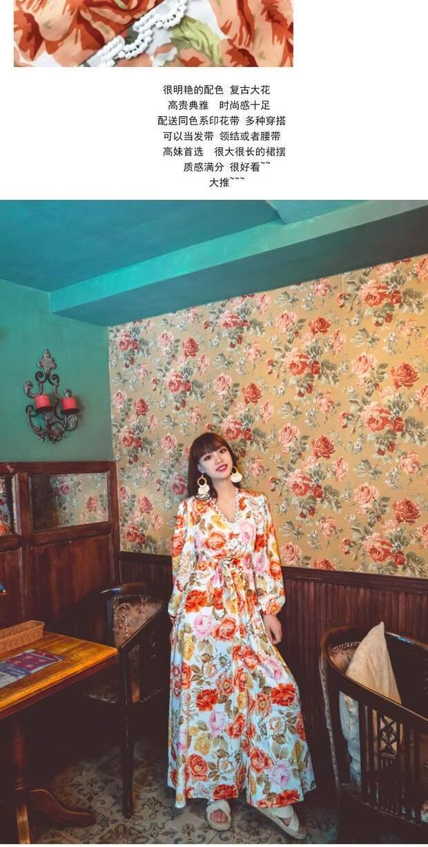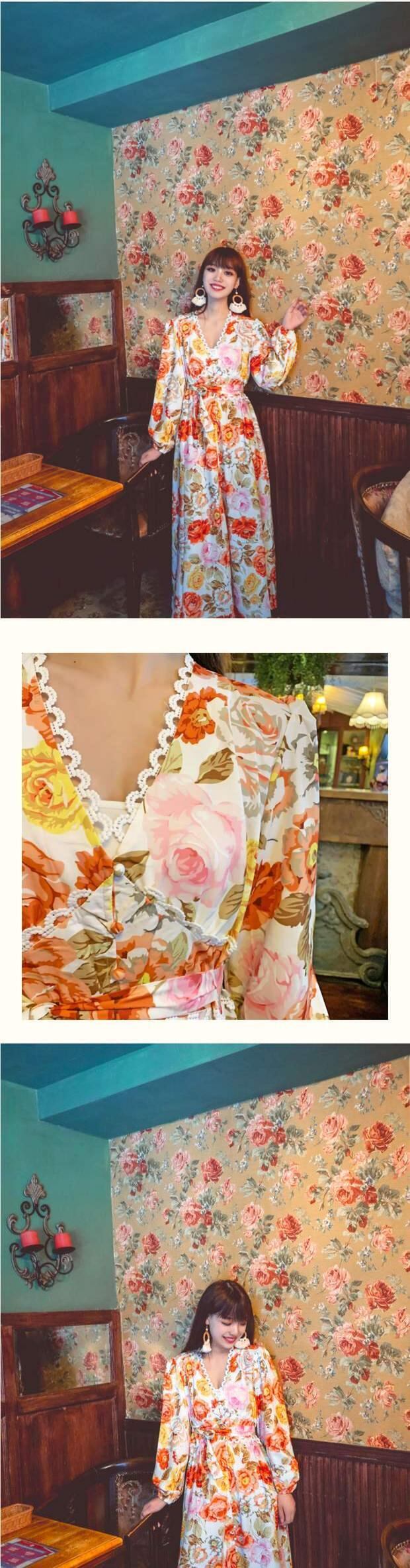 秋の休暇、レトロな色の花柄のレースのボーダー長袖ハイウエストストラップエスニックスタイルのドレスを着用してください 延命家ファッション49070101530