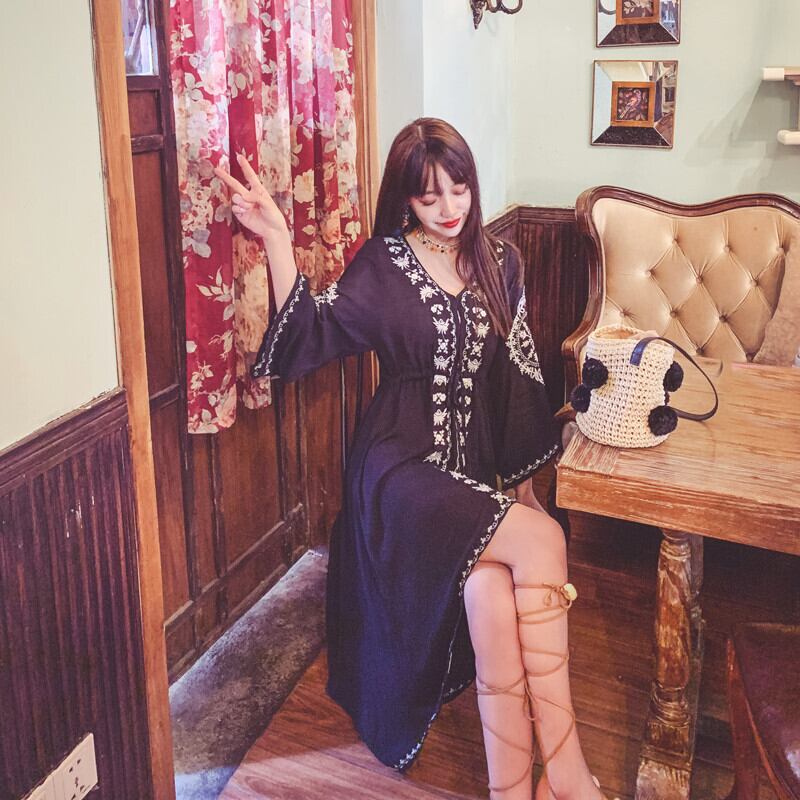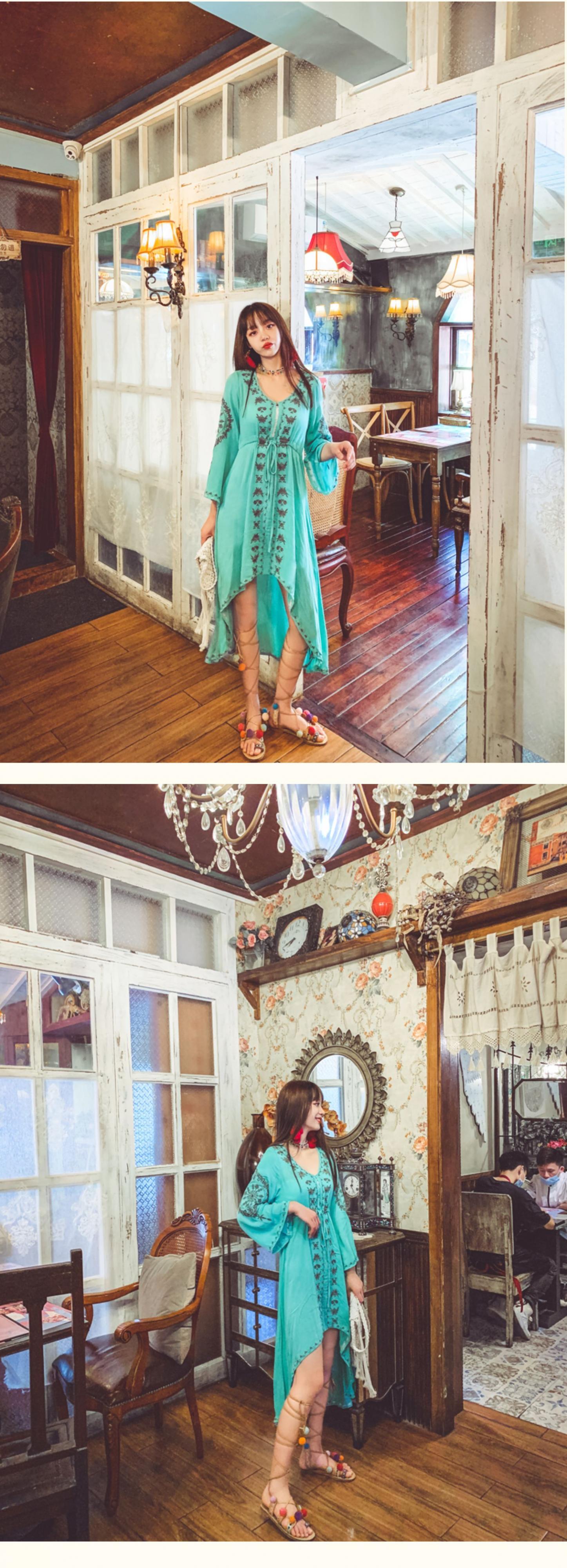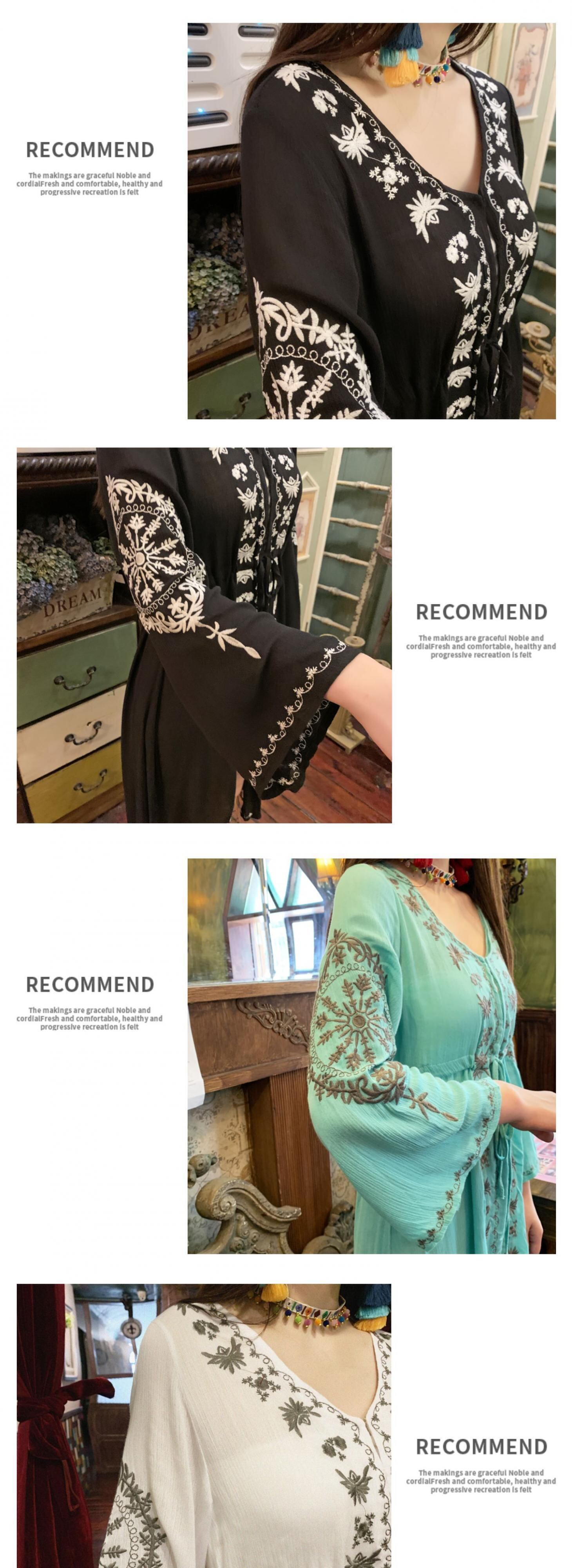 エスニックスタイルスカート 刺繍Vネックスリーブドレス ロングサマー レッド コットン 夏物 延命家ファッション53837622977