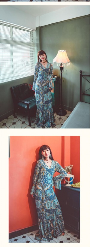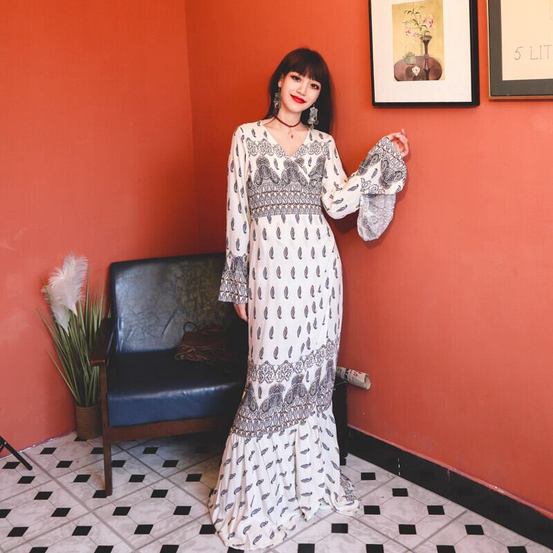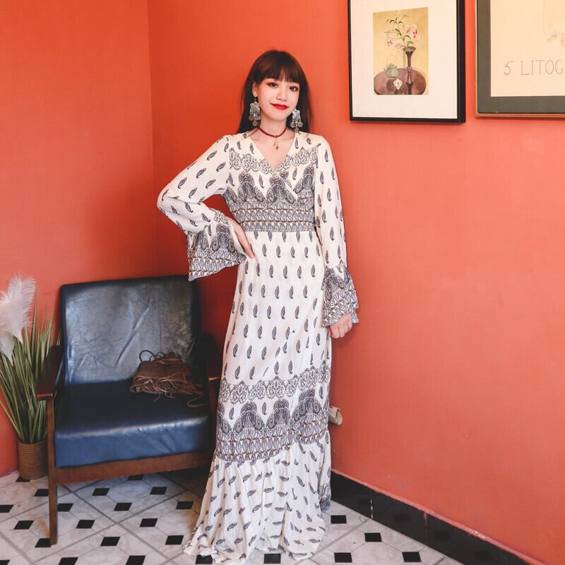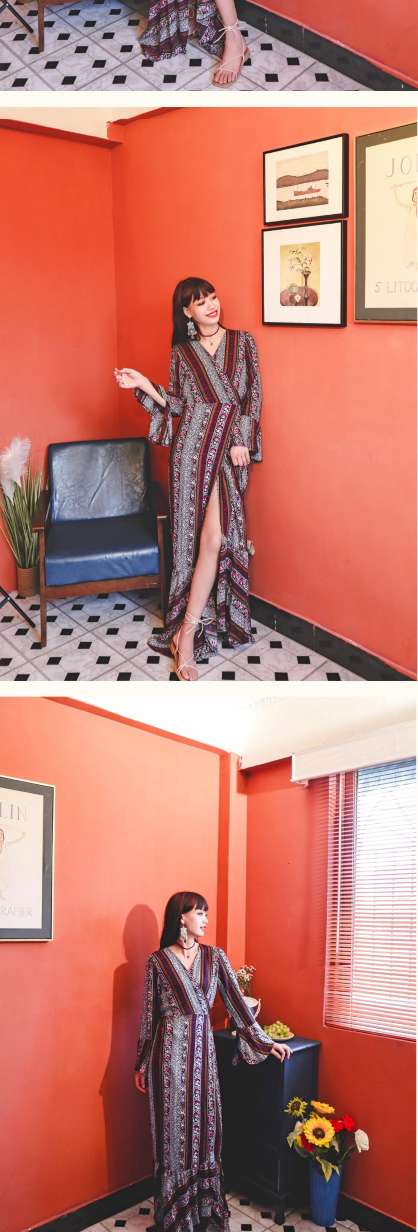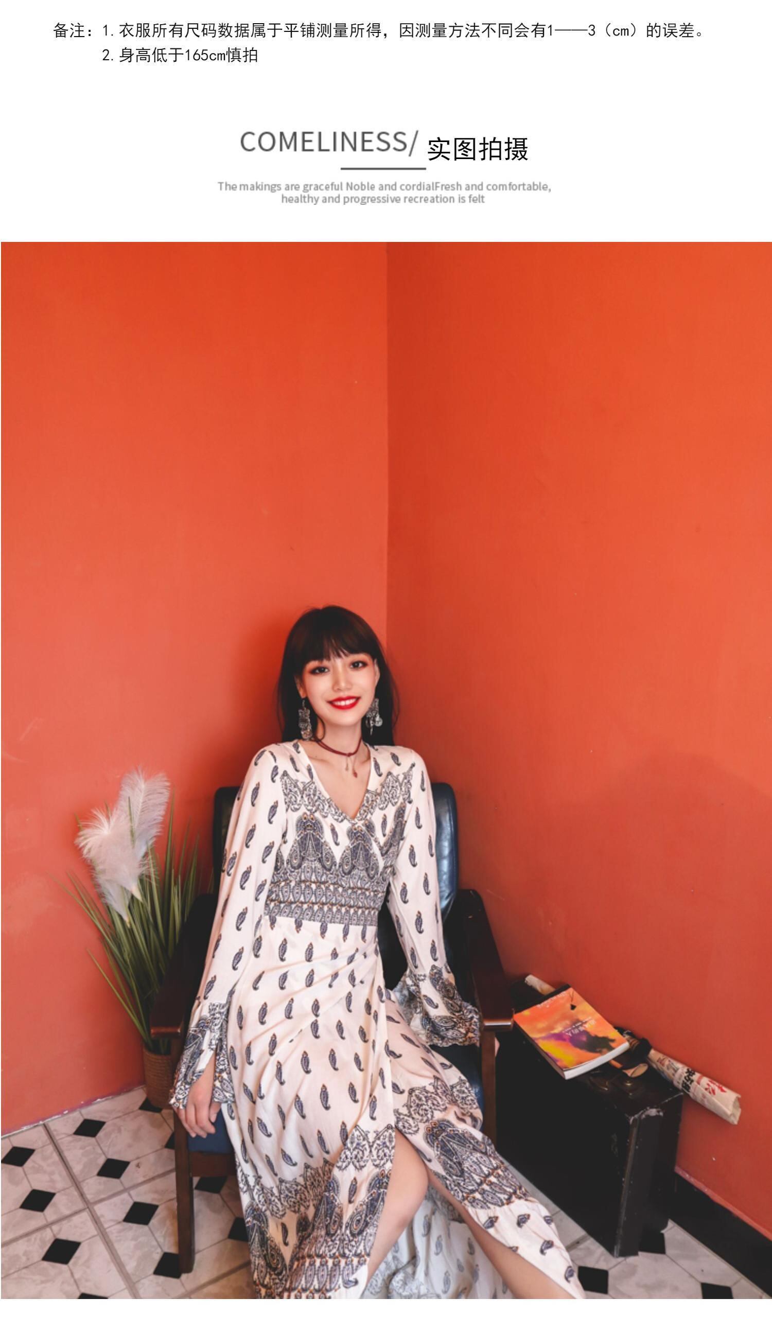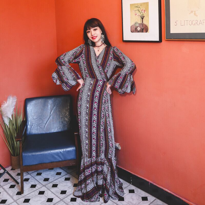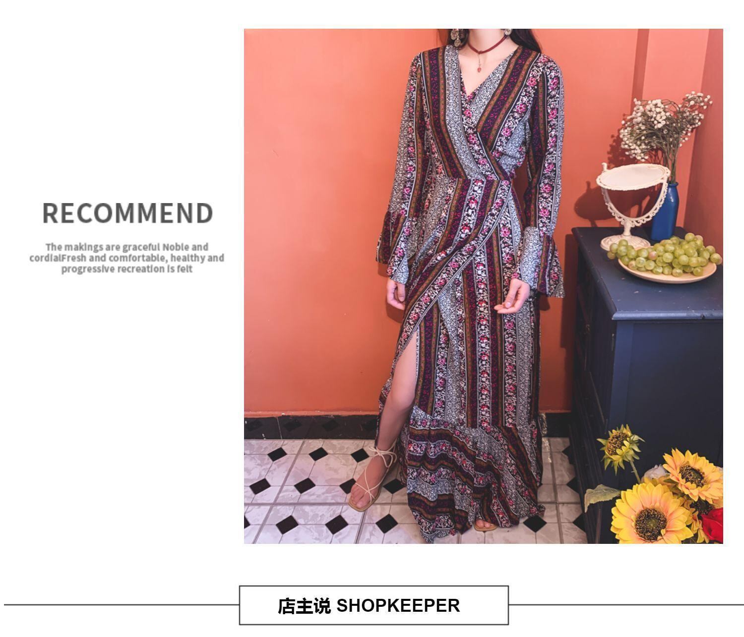 ボヘミアンアイランドリゾートビーチスカートレーヨンレトロプリントロングスカートスリム気質花びらスリーブワンピース 延命家ファッション44283733330