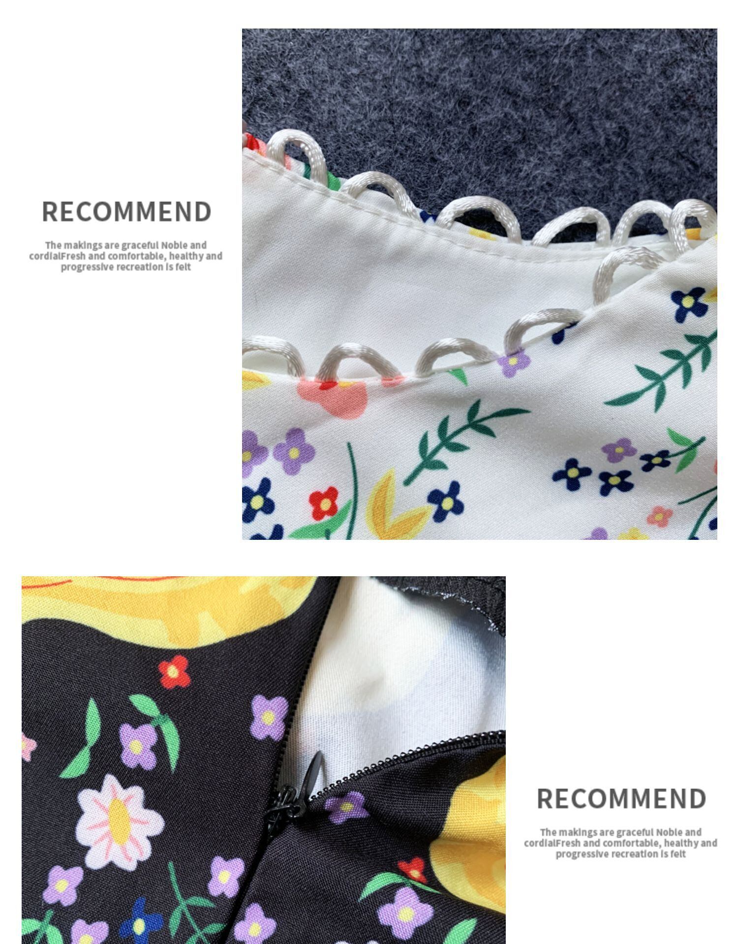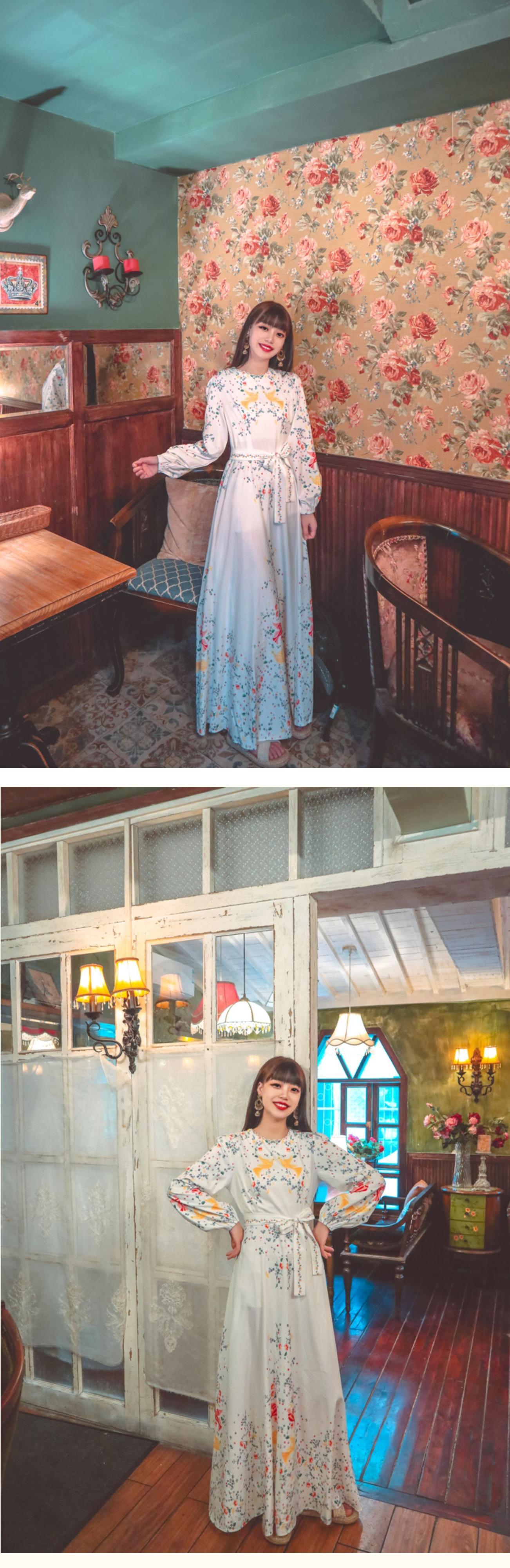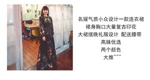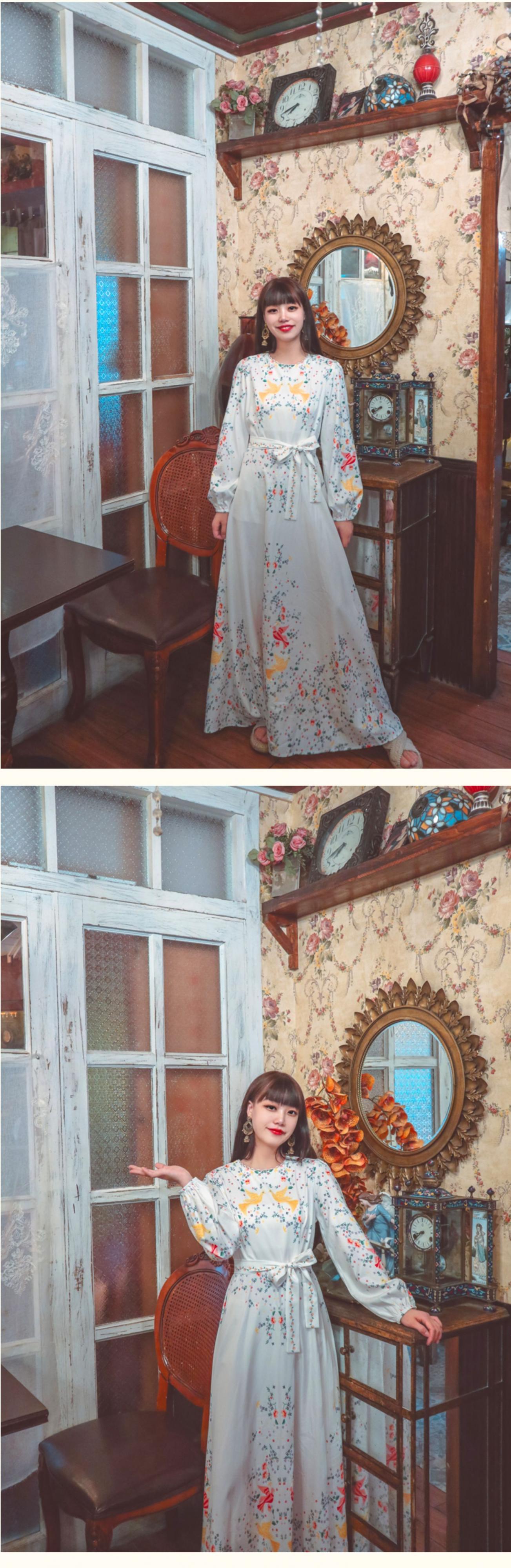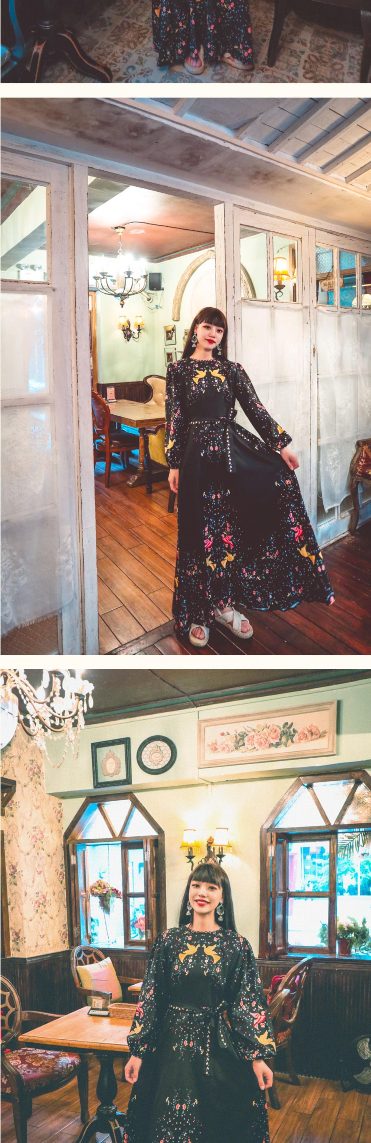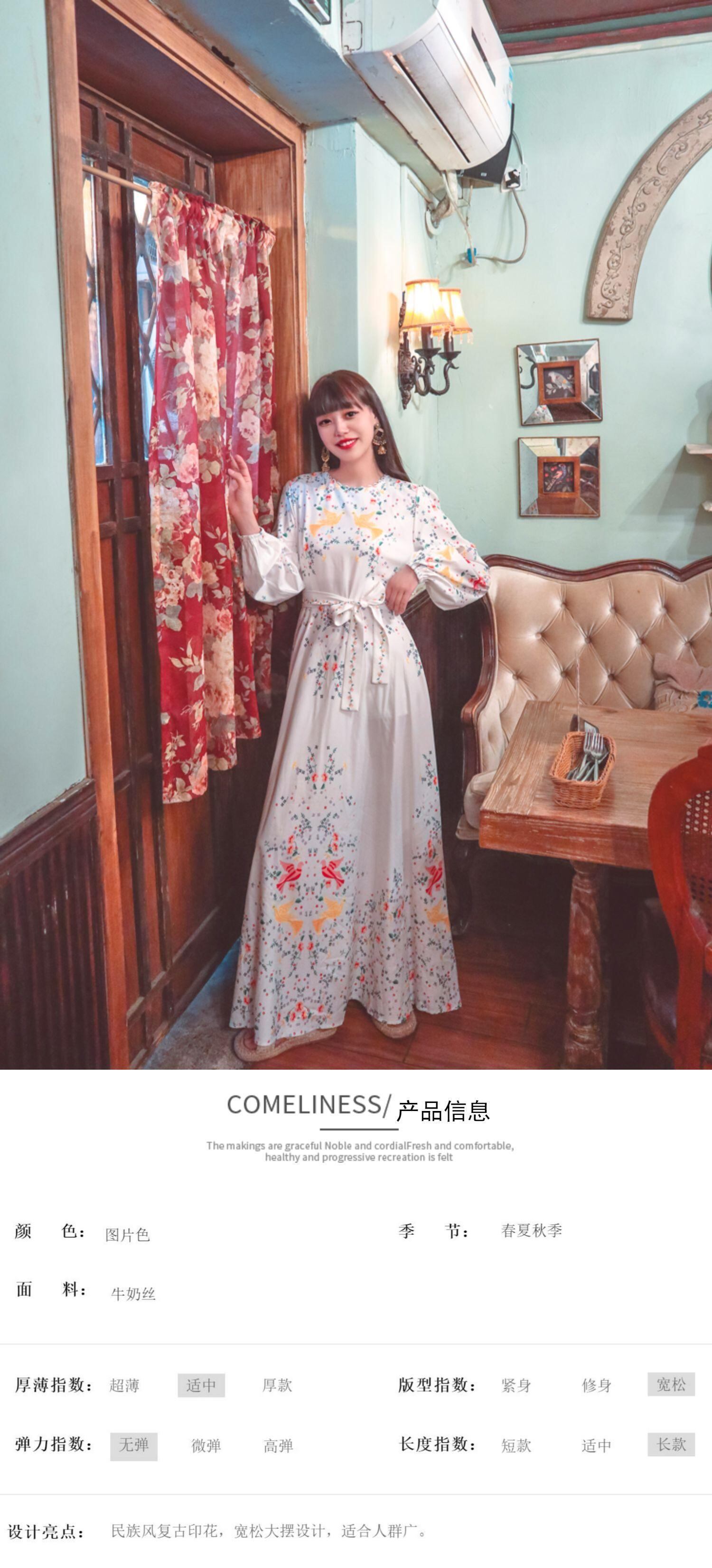 春の旅行のニッチなデザイン、パフスリーブ、プリント、ウエスト、ビッグスイング、ロングスカート、レトロなスタイルのドレス、イブニングドレス 延命家ファッション96656875093