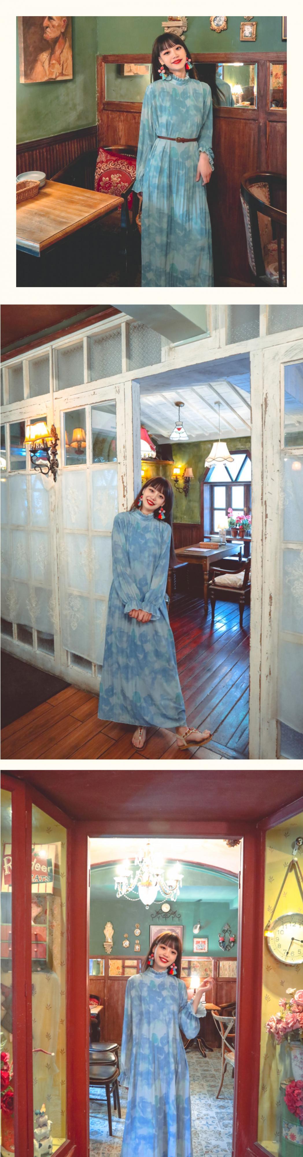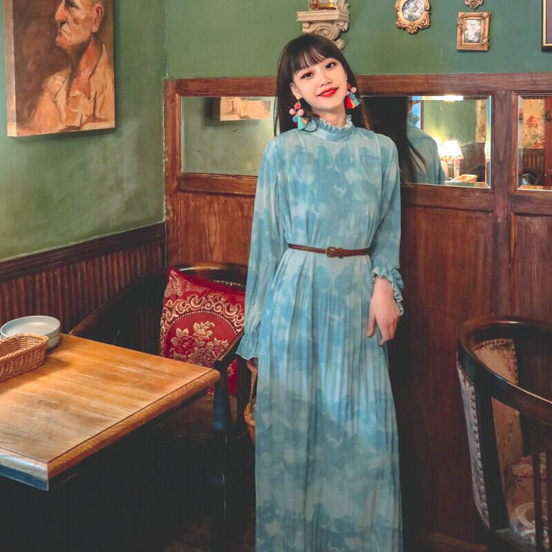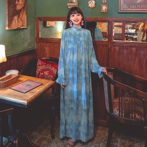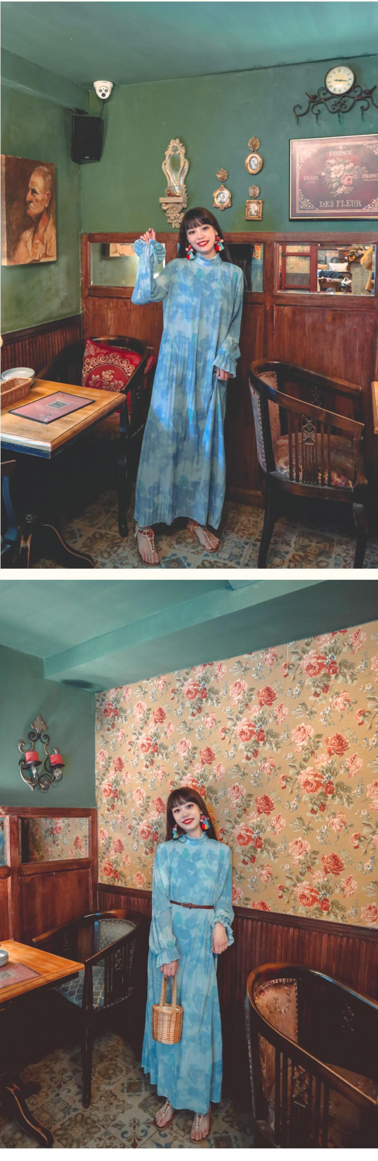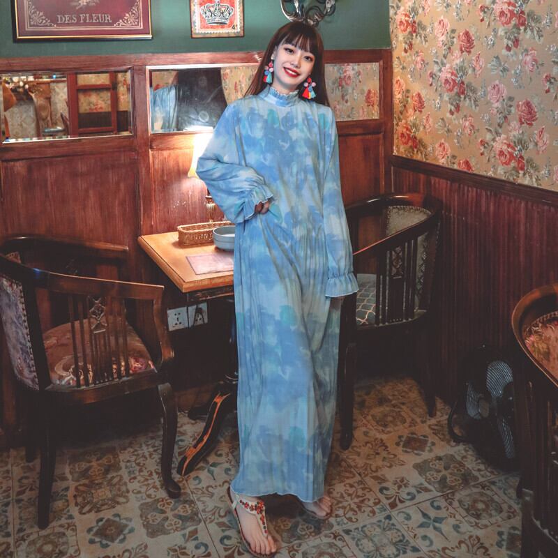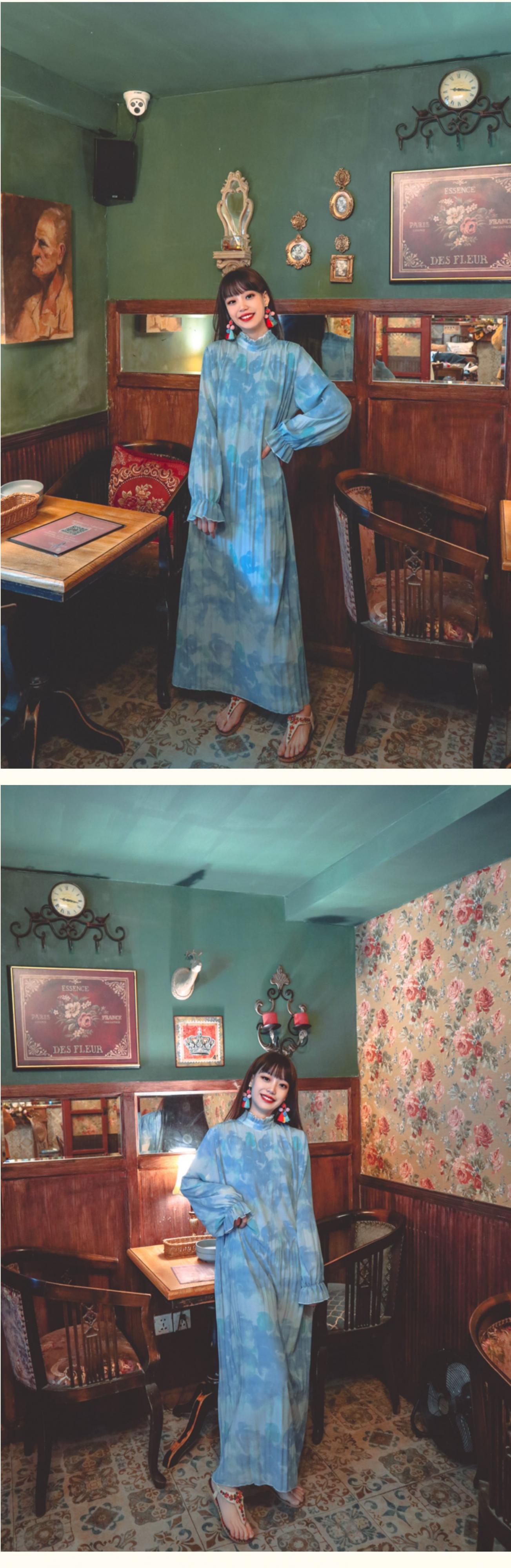 春の新油絵エストラインロングスカートアンクルフェアリーヘイズブルーラージサイズエスニックスタイルフローラル優しいドレス 延命家ファッション56859797382