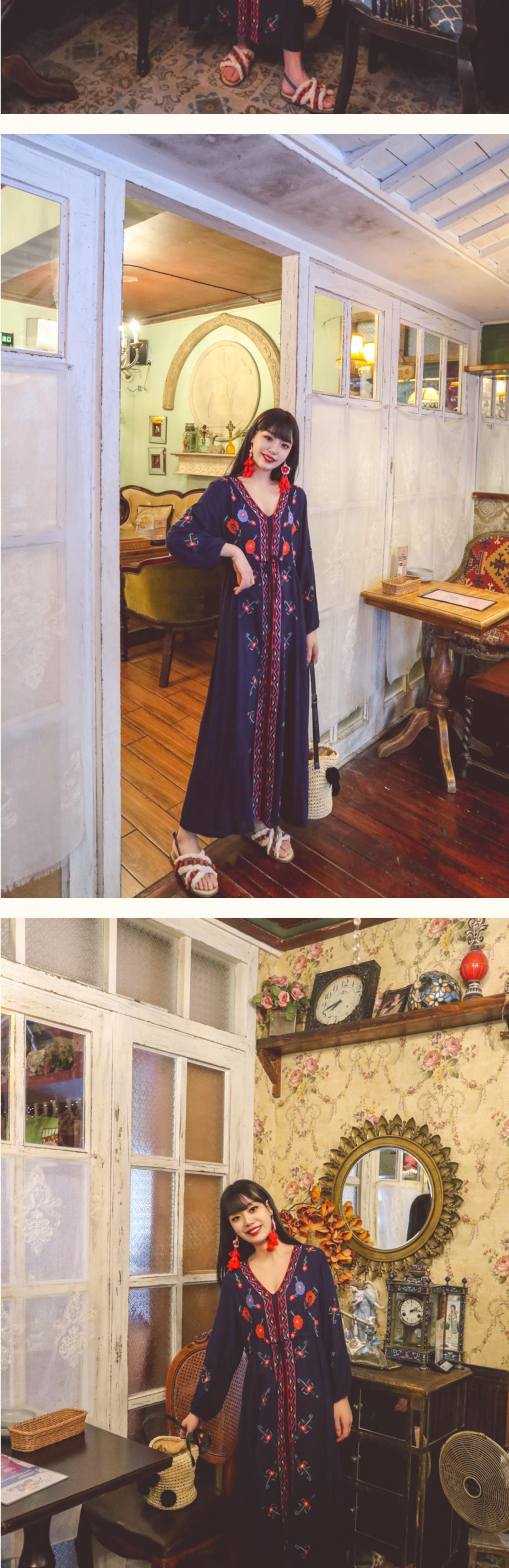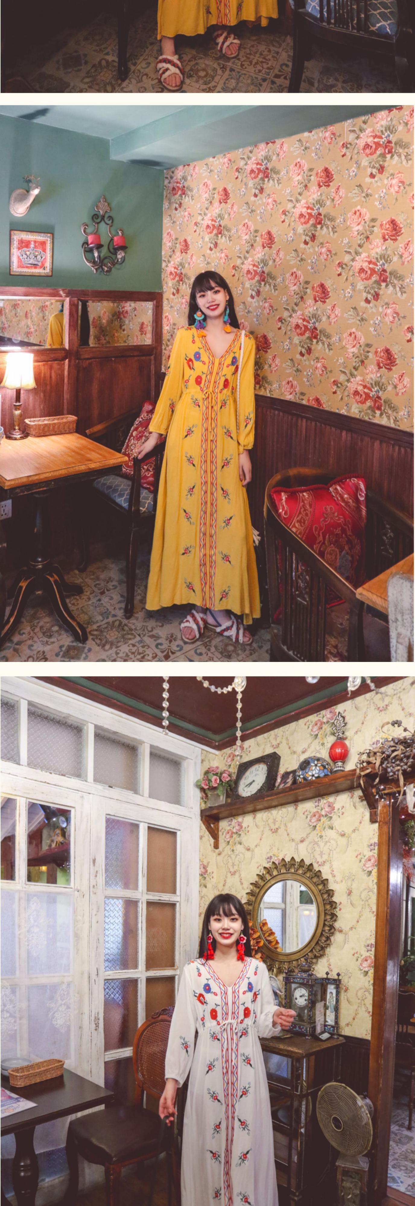 スプリングサマーボヘミアン自然派スタイルロングスカート 刺繍レースVネックルーズウェストドレス コットン 春物 夏物 延命家ファッション30816648022