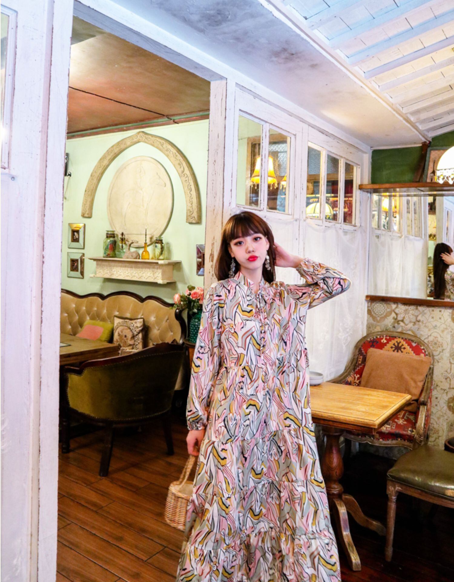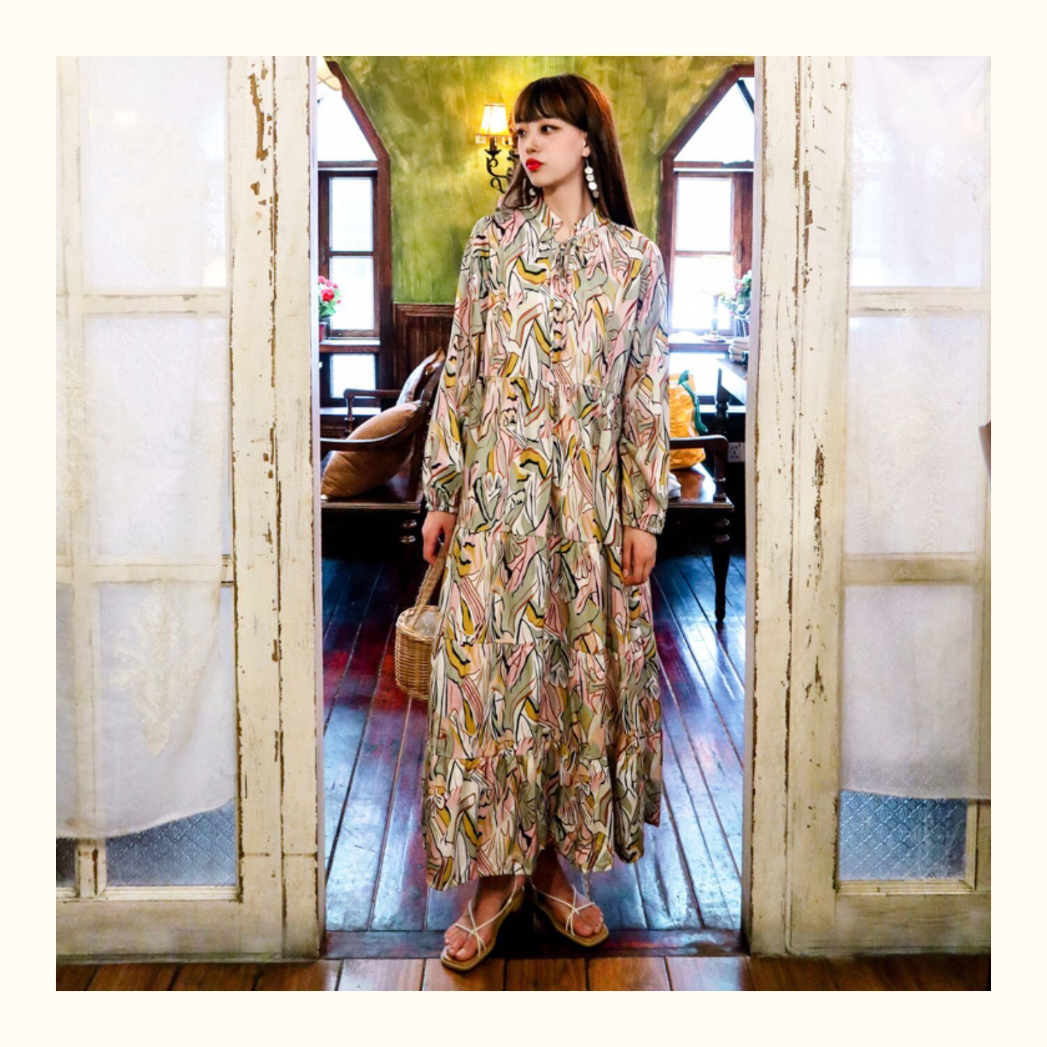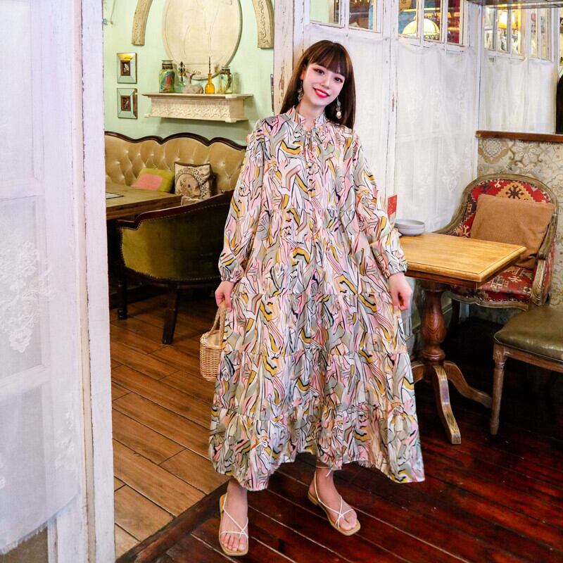 スプリングスタイルロングルーズドレス レトロ 長袖 春物 スカート 延命家ファッション56567510329