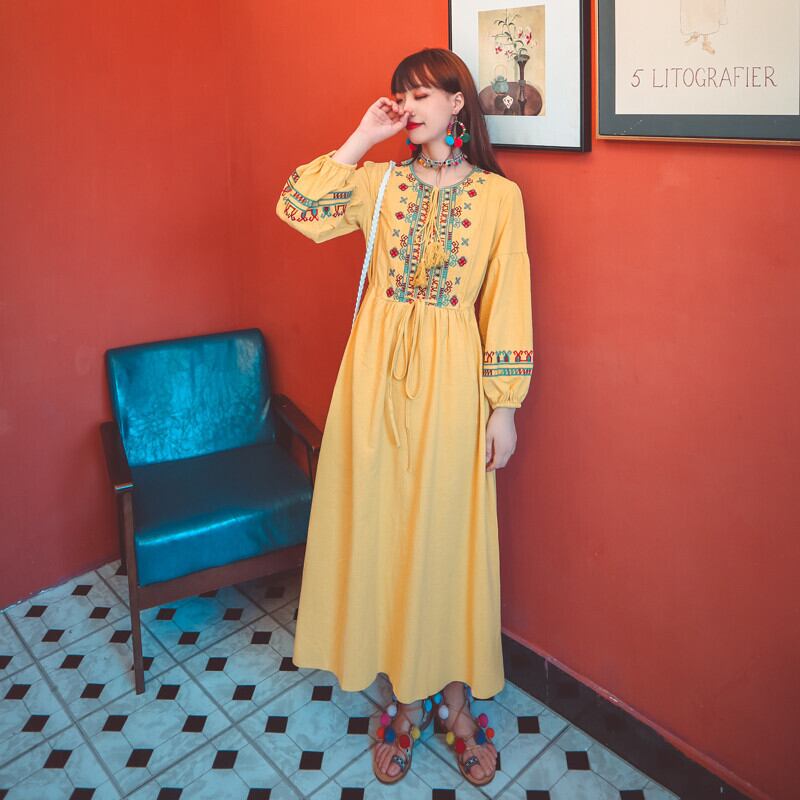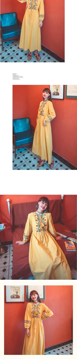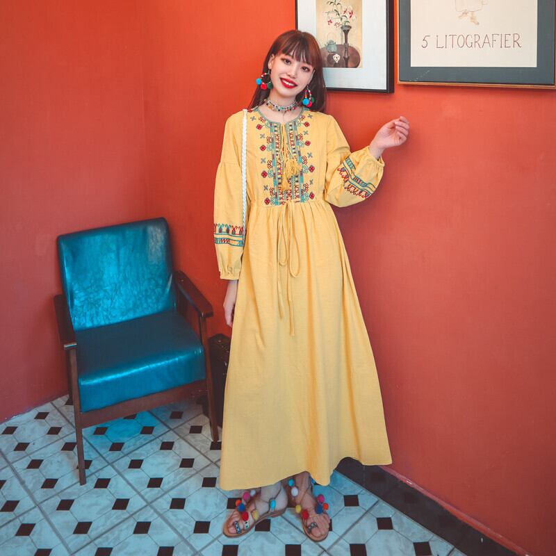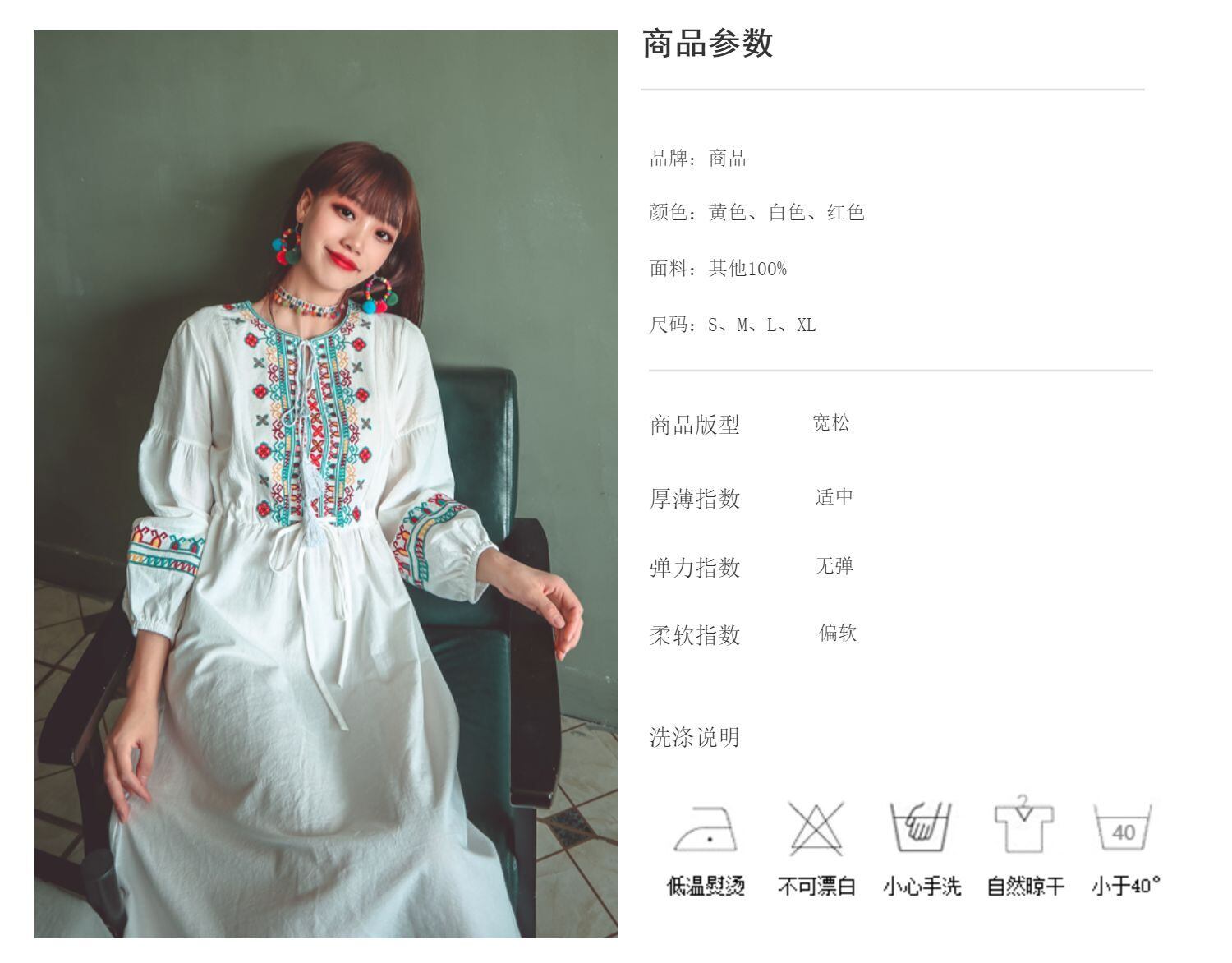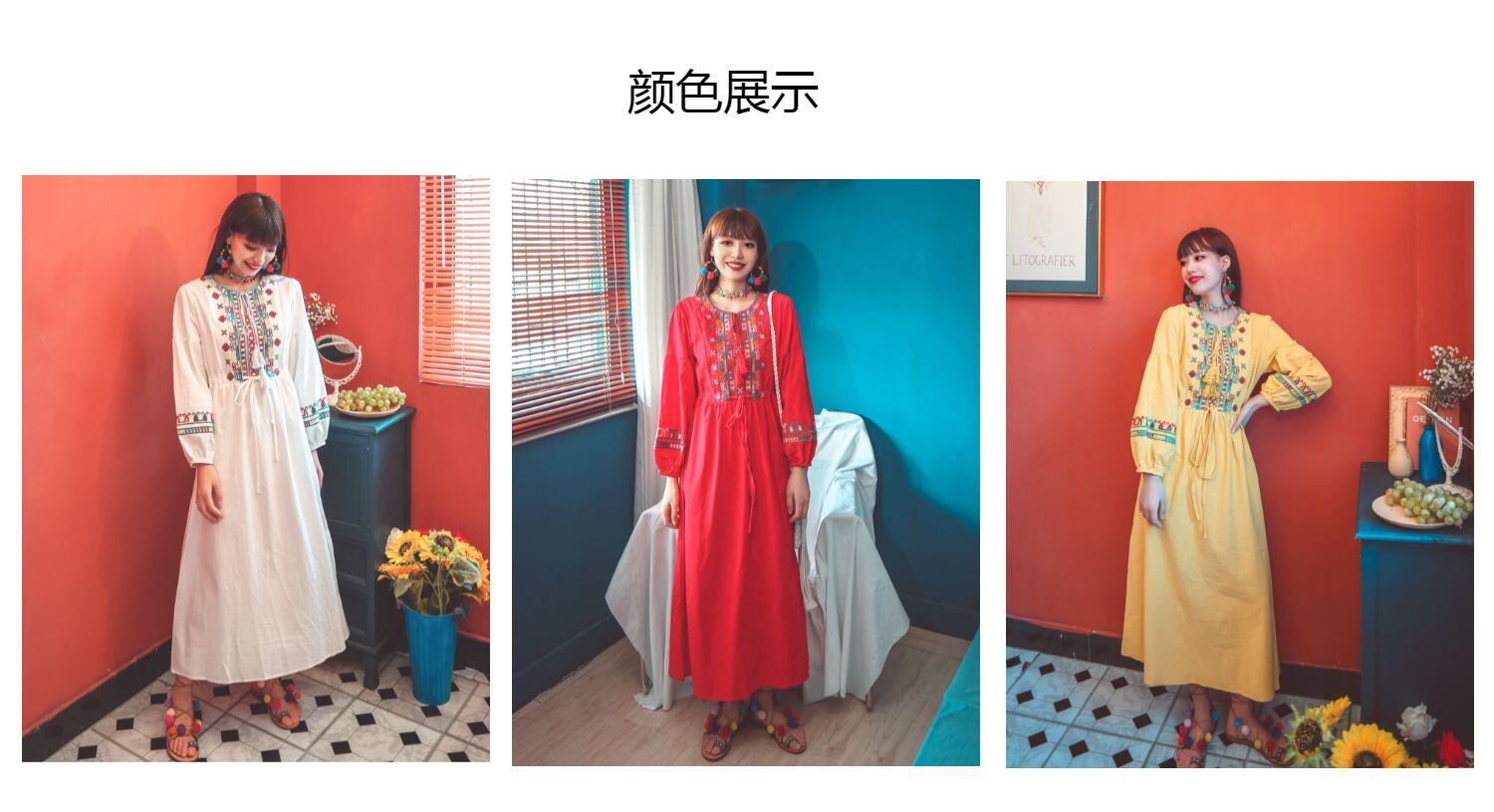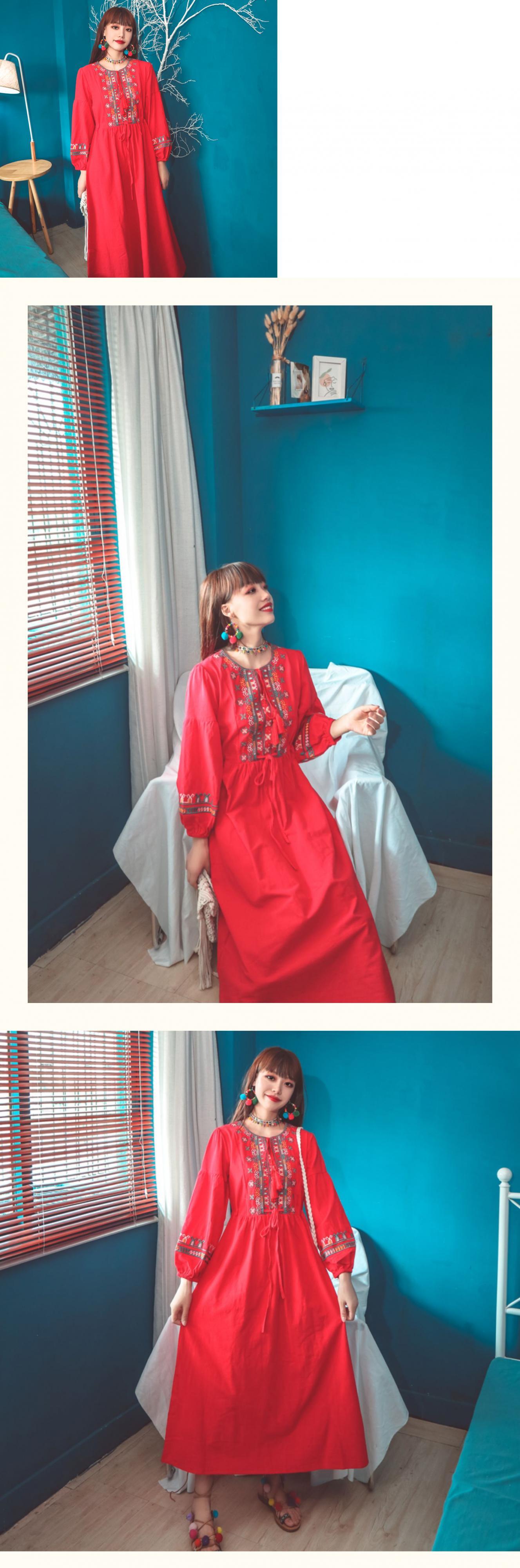 スプリングサマーエスニック刺繍ロングスカート ルーズVネックウェストドレス コットン 春物 夏物 延命家ファッション16459915532