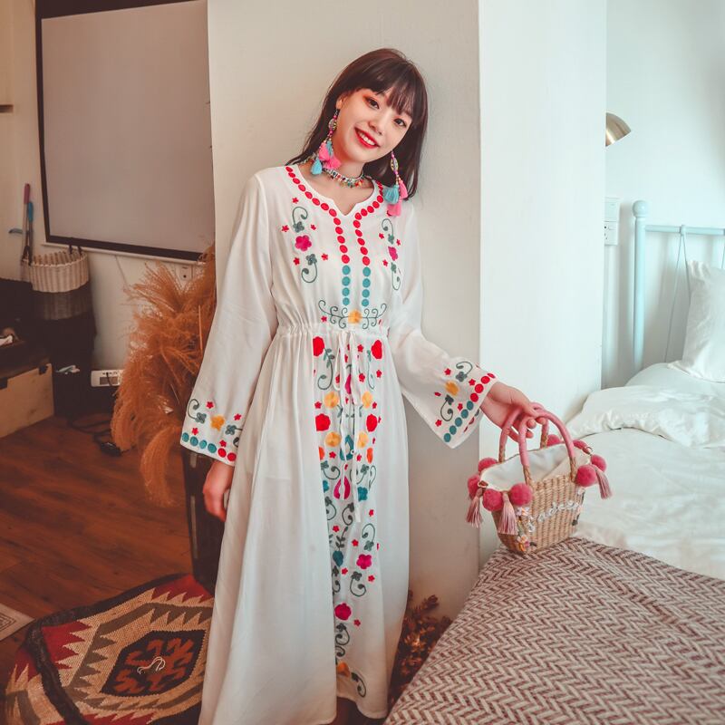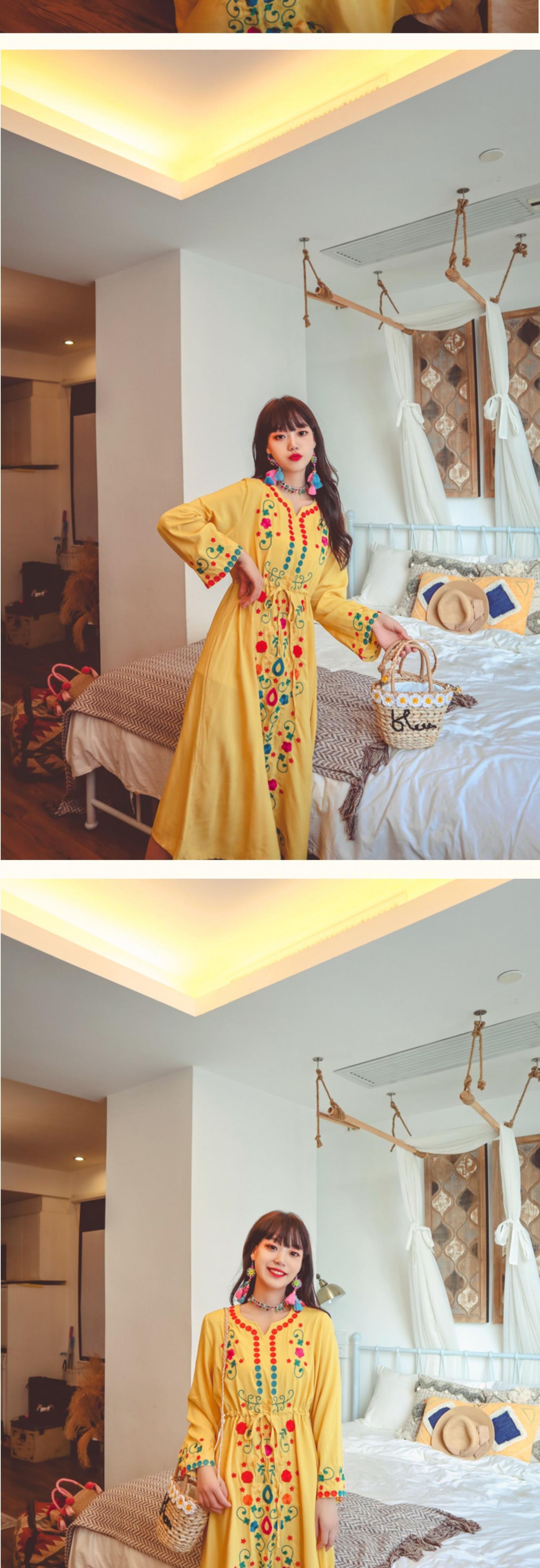 スタンダードスカート エスニック刺繍Vネックウェストドレス レディース レトロ 延命家ファッション48821775008