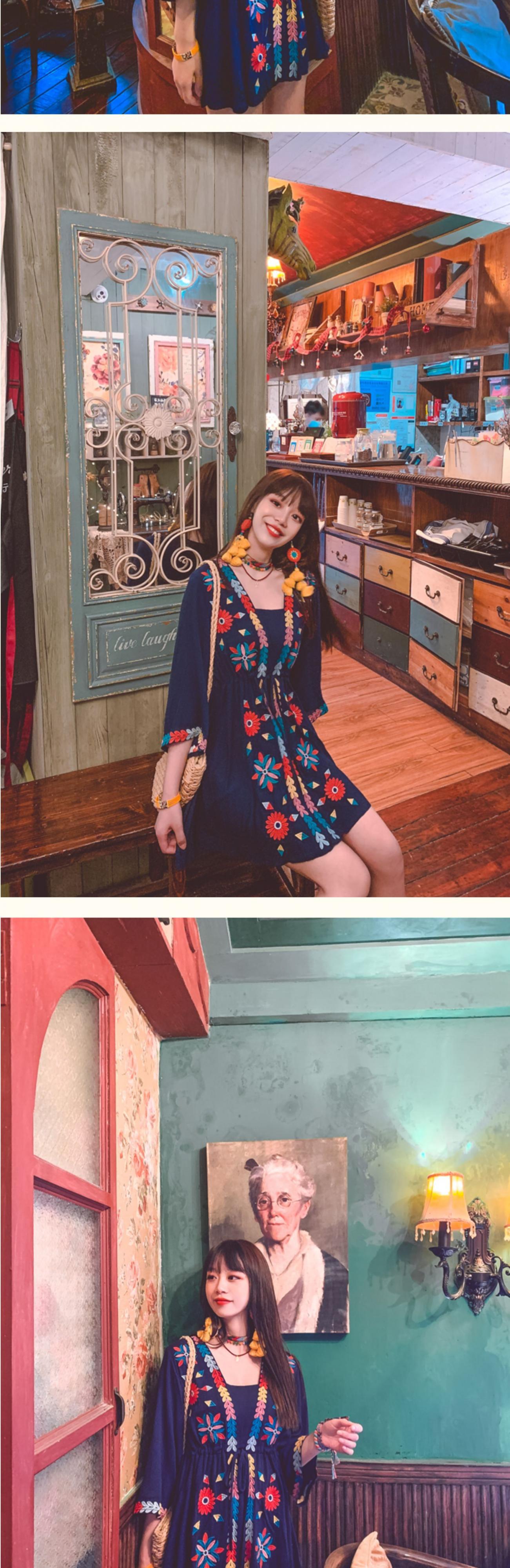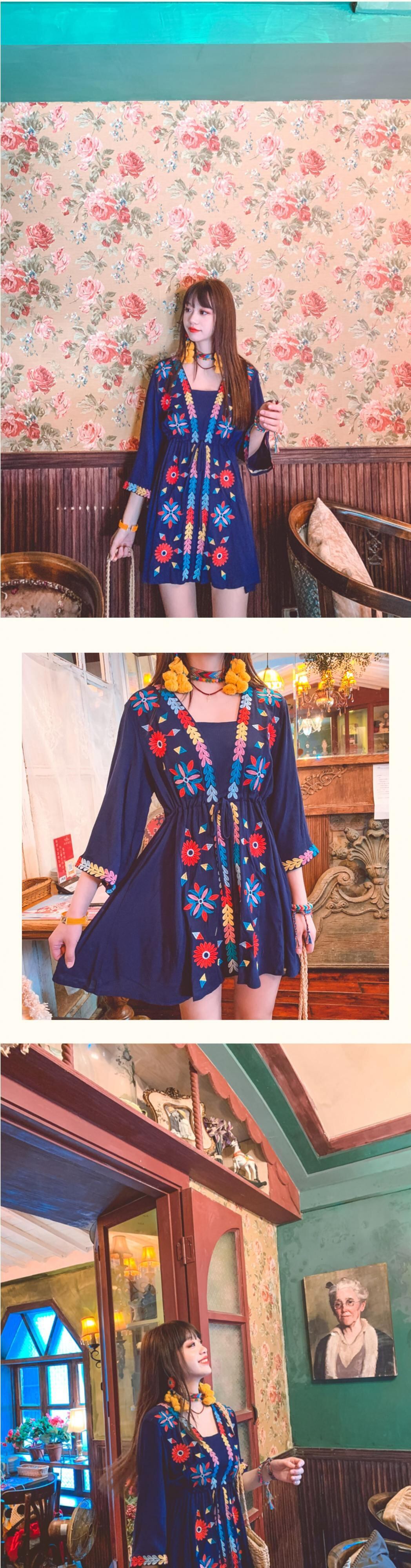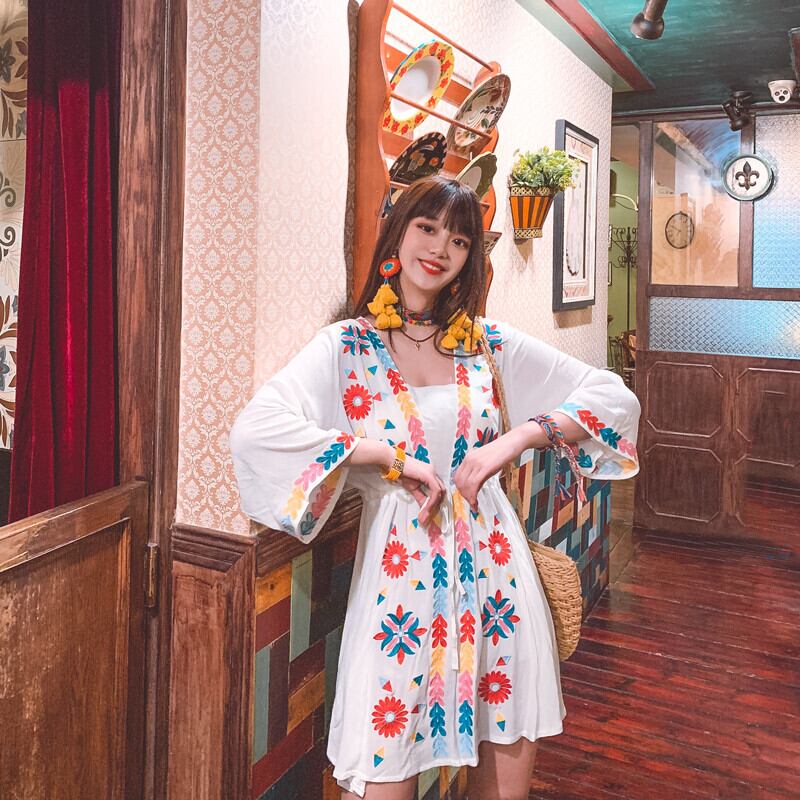 ボヘミアンスカート エスニック刺繍Flowerデザイン ウェストスタンダードルーズドレス レトロ ビーチ フラワーデザイン 延命家ファッション3259723196
