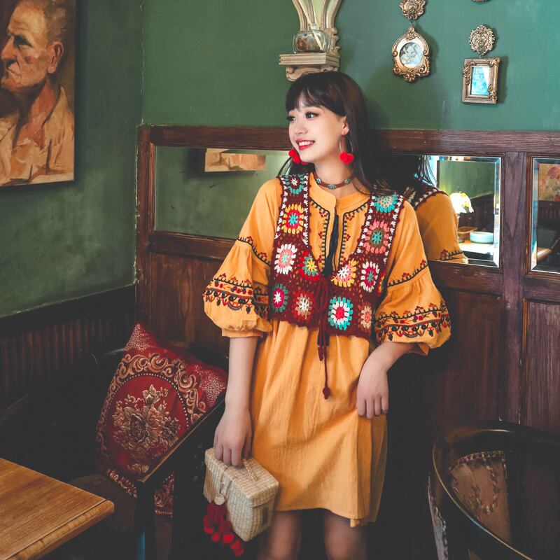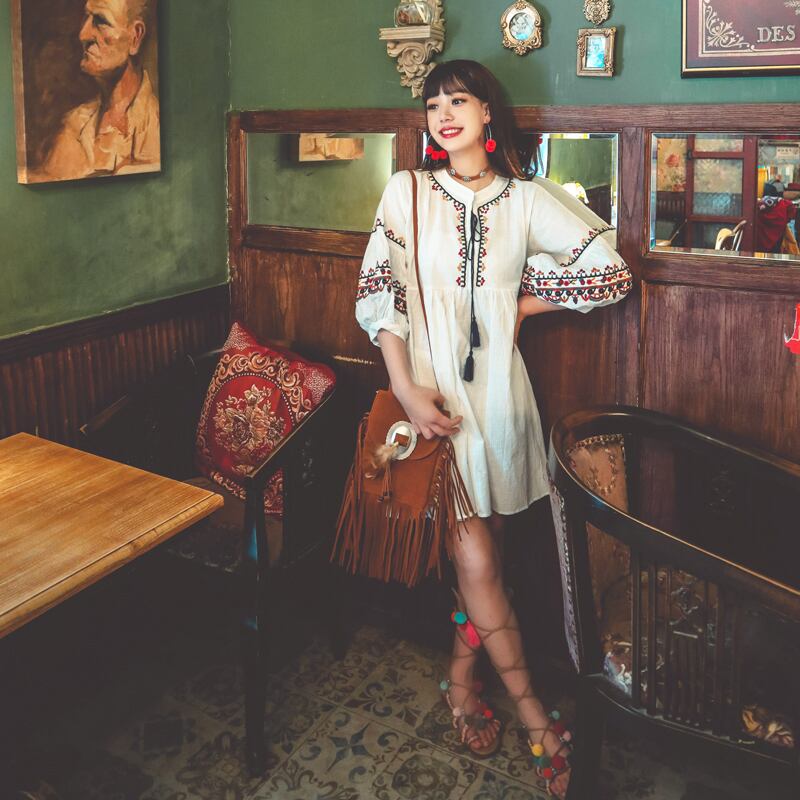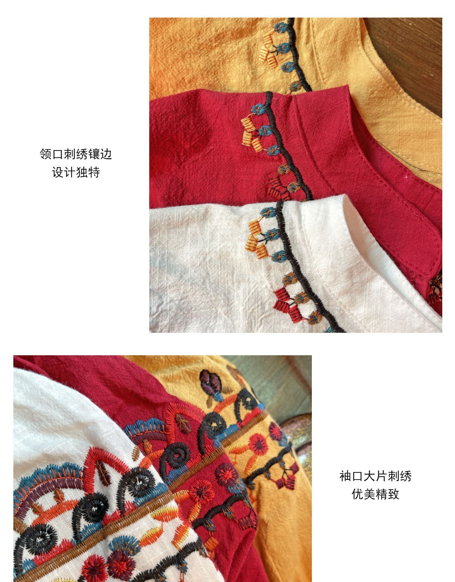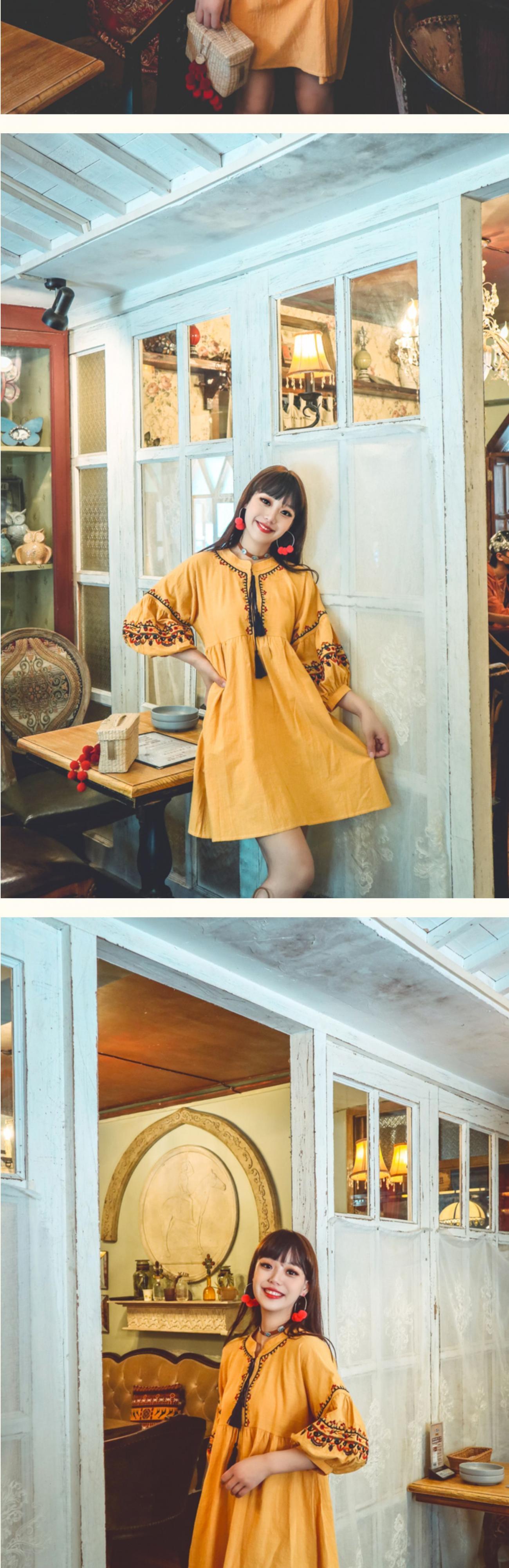 エスニックスタイルショートスカート スリーブドレス レッド ランタンスリーブ コットン レース 刺繍 大人ガーリー スウィート キュート カジュアル レースアップ 延命家ファッション84202601627