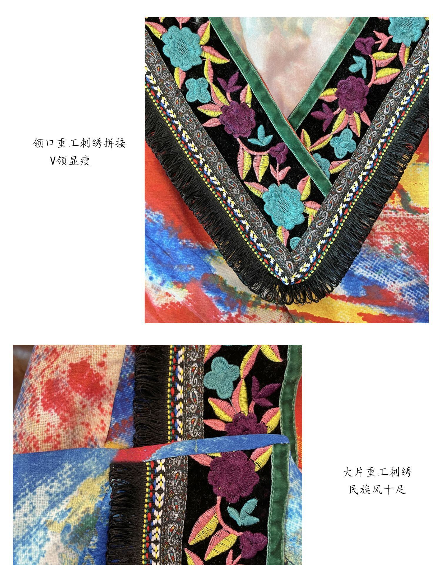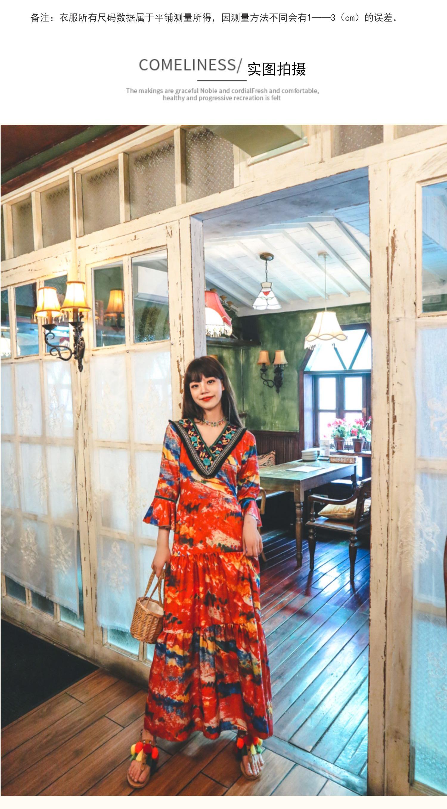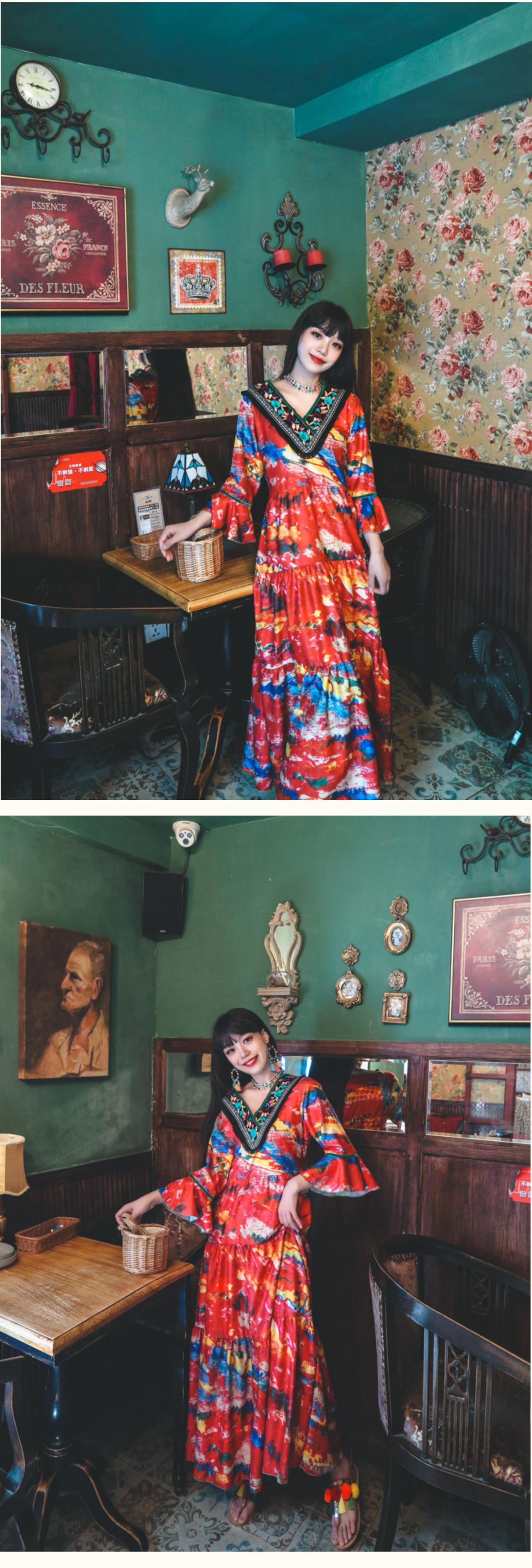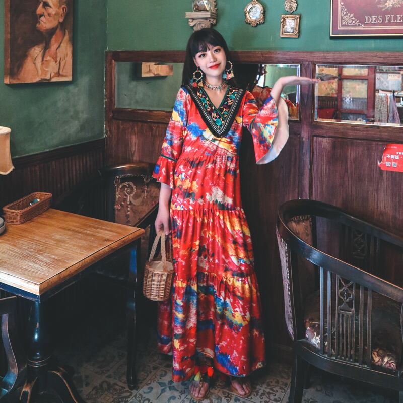 レッド刺繍スタンダードロングスカート プリントスリーブエスニックスタイルドレス サマー レトロ 夏物 延命家ファッション84202858195