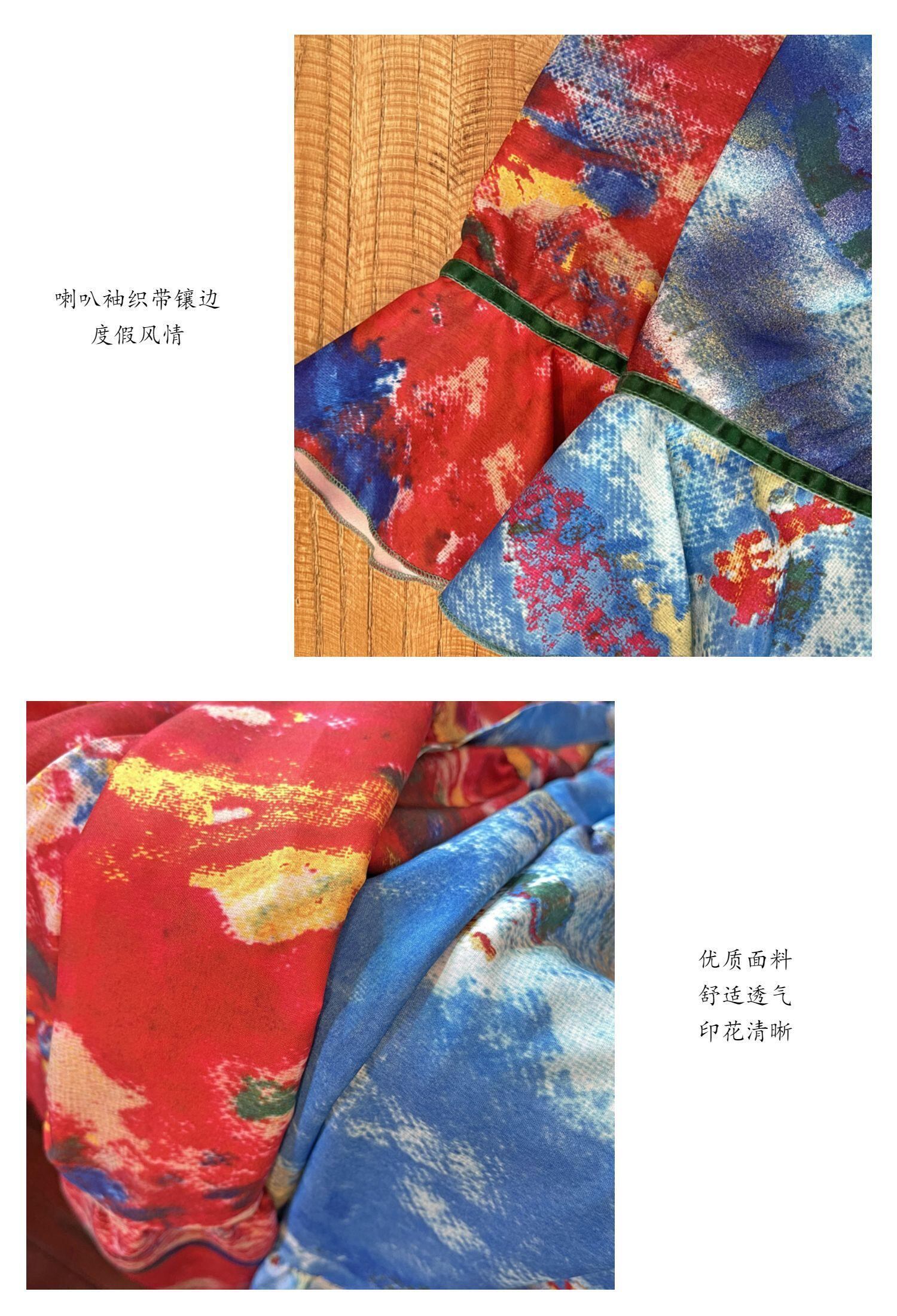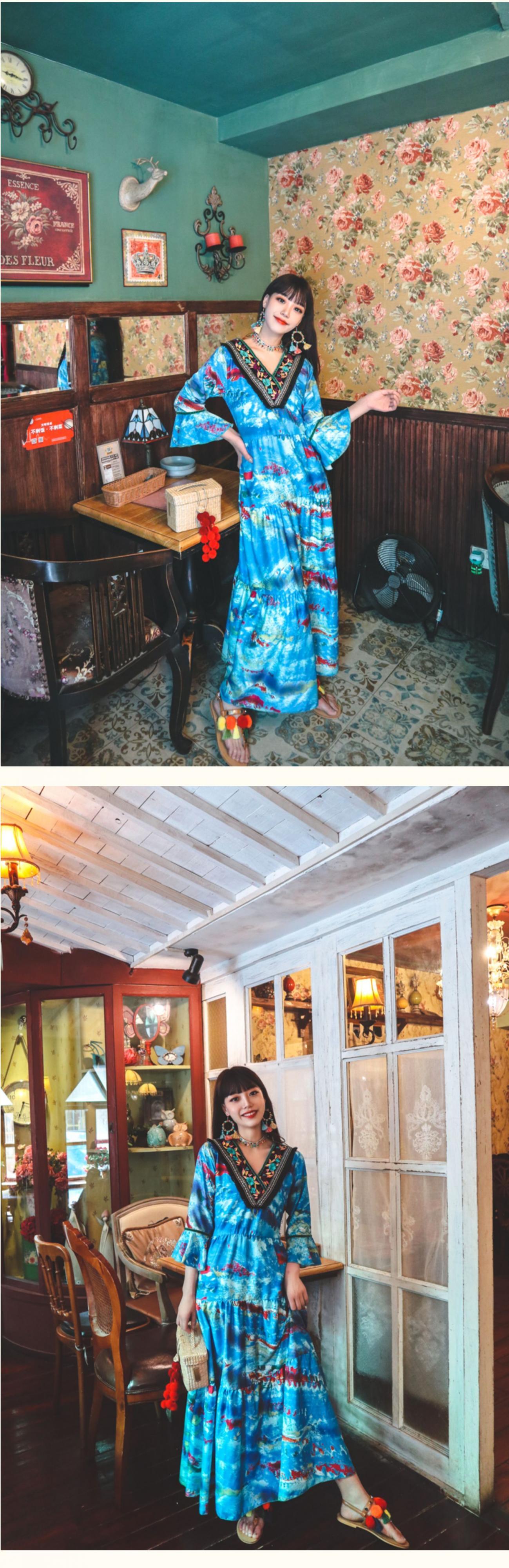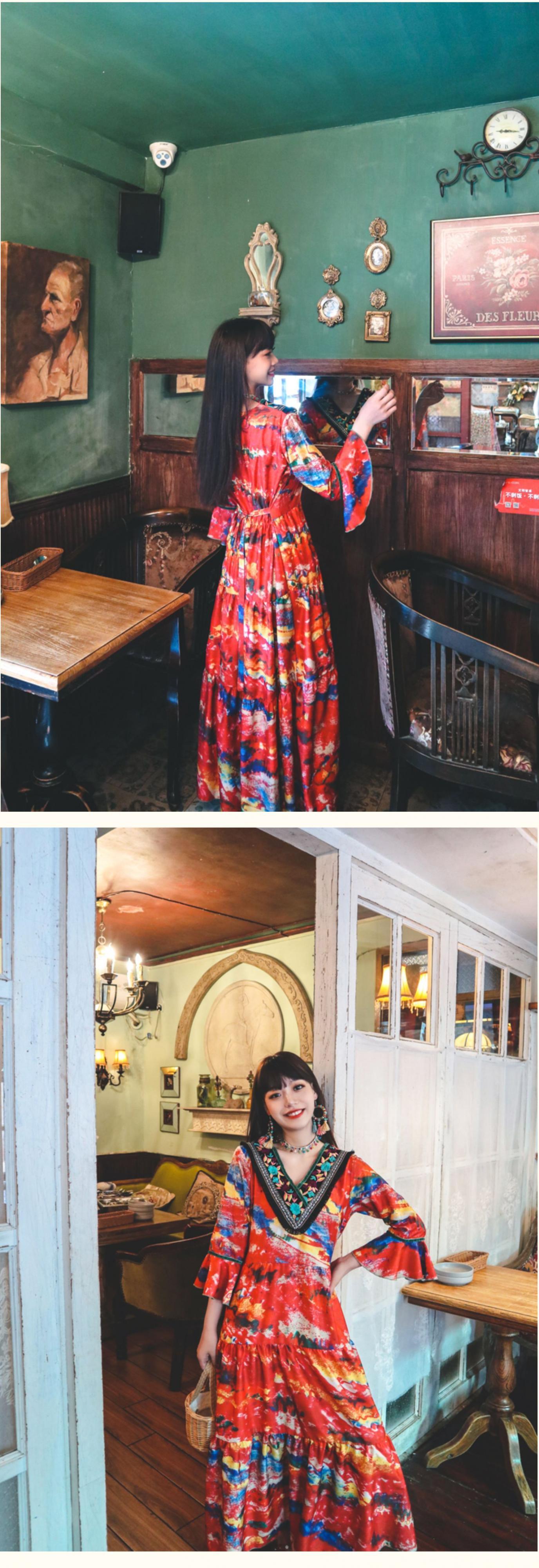 レッド刺繍スタンダードロングスカート プリントスリーブエスニックスタイルドレス サマー レトロ 夏物 延命家ファッション84202858195