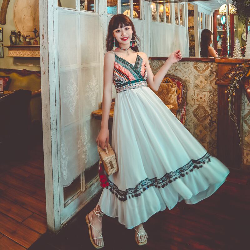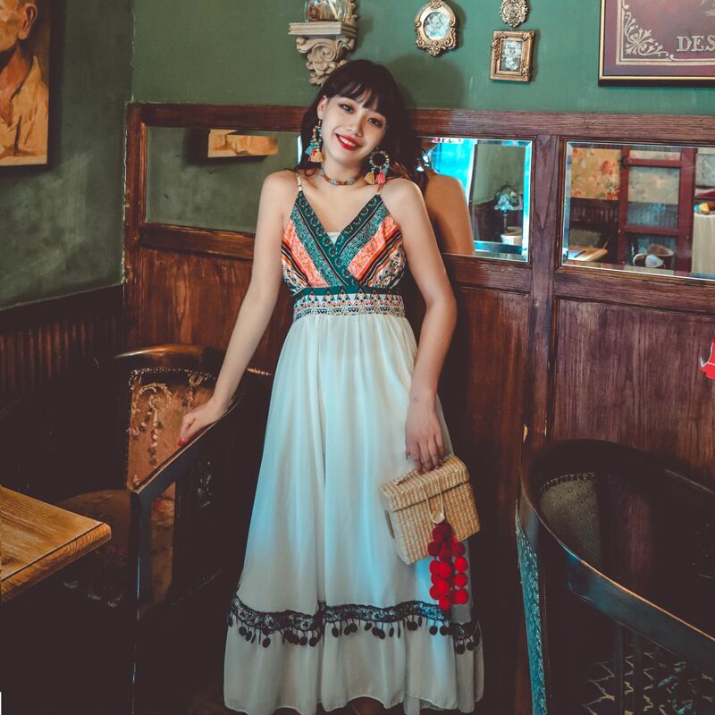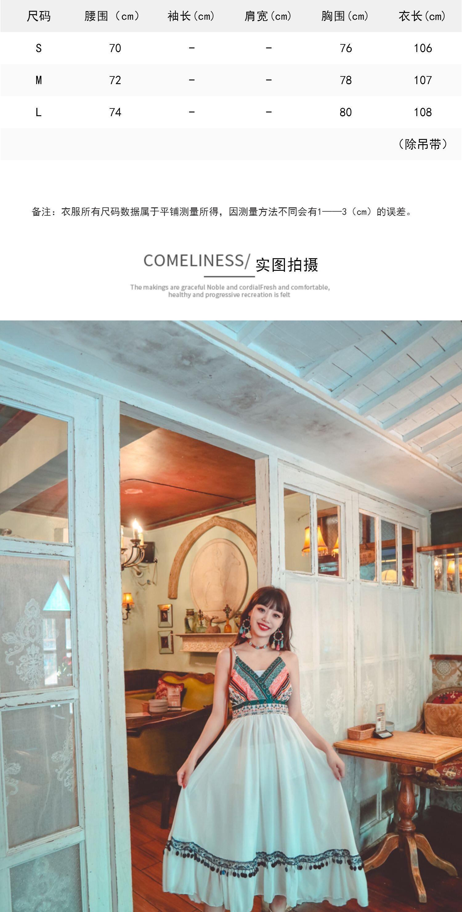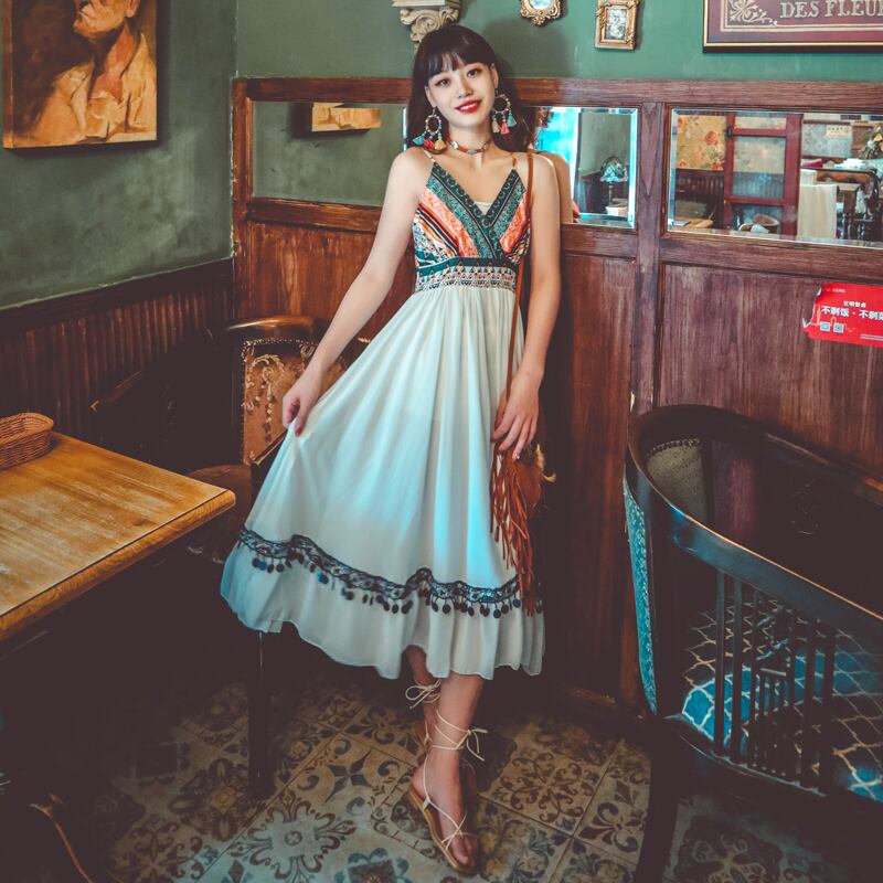ボヘミアンサマーVネックロングドレス スタンダードプリントエスニックスタイル レトロ 夏物 ビーチ 延命家ファッション99248141163