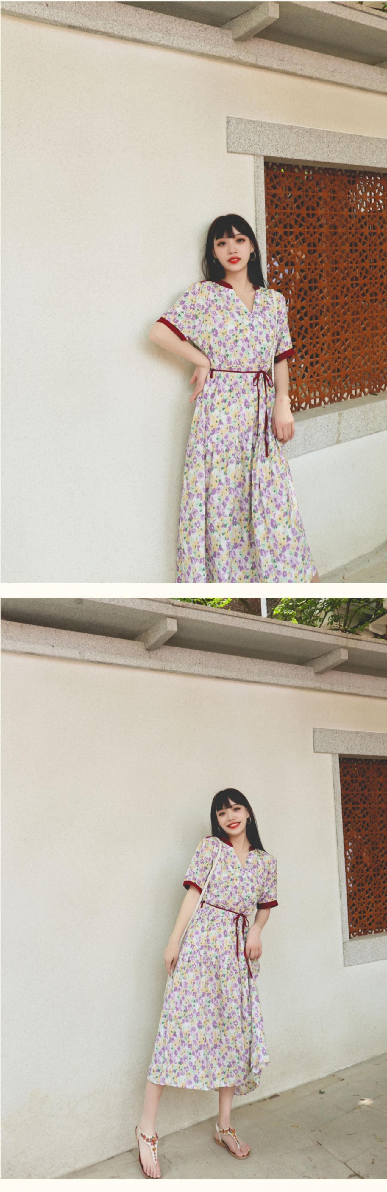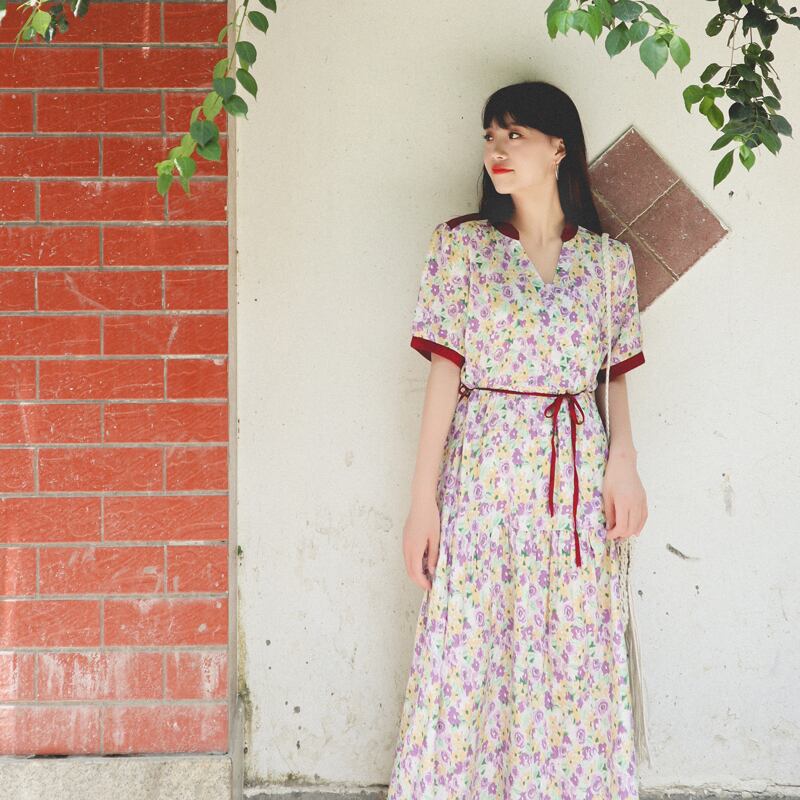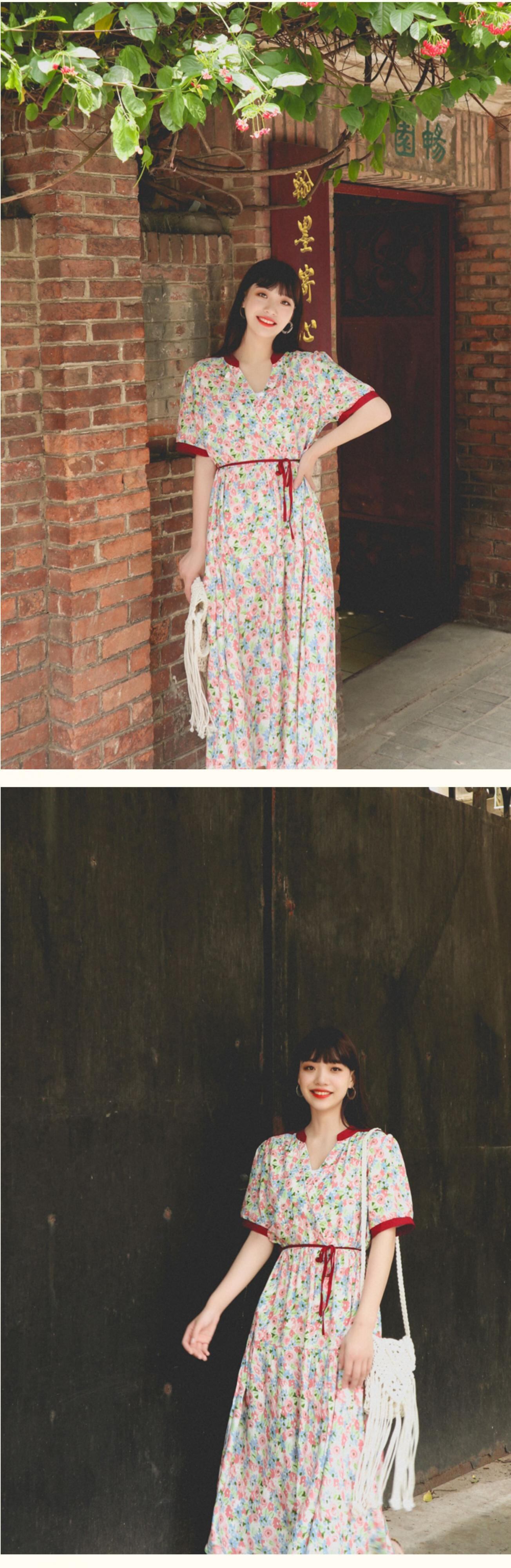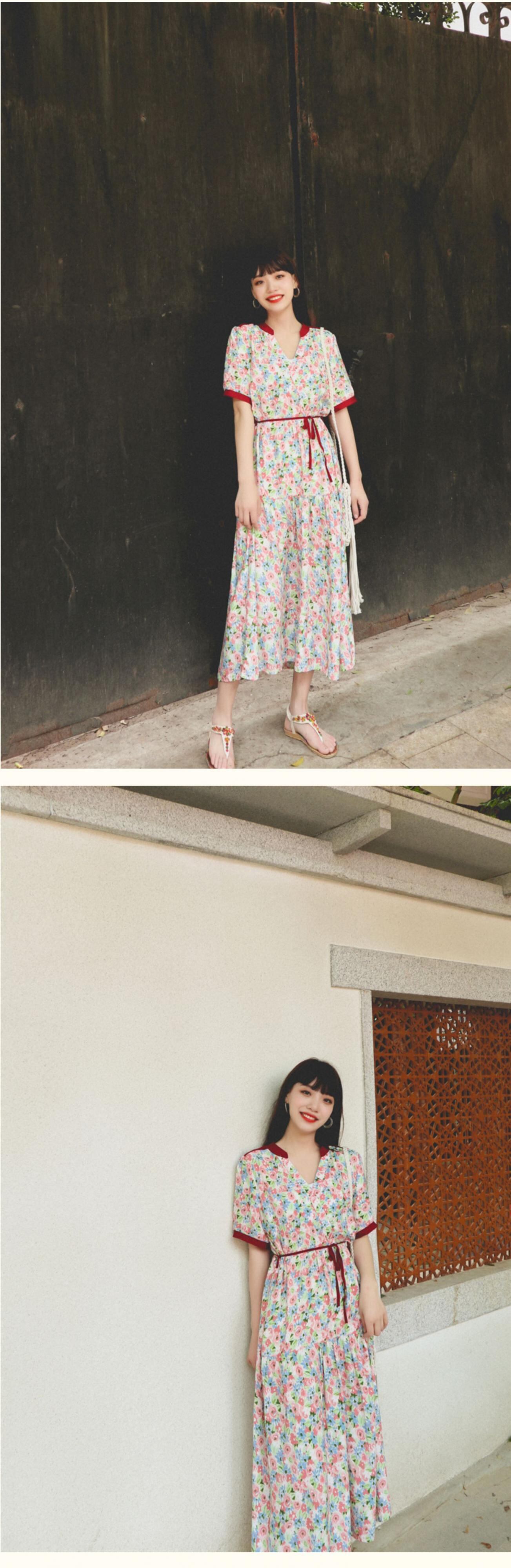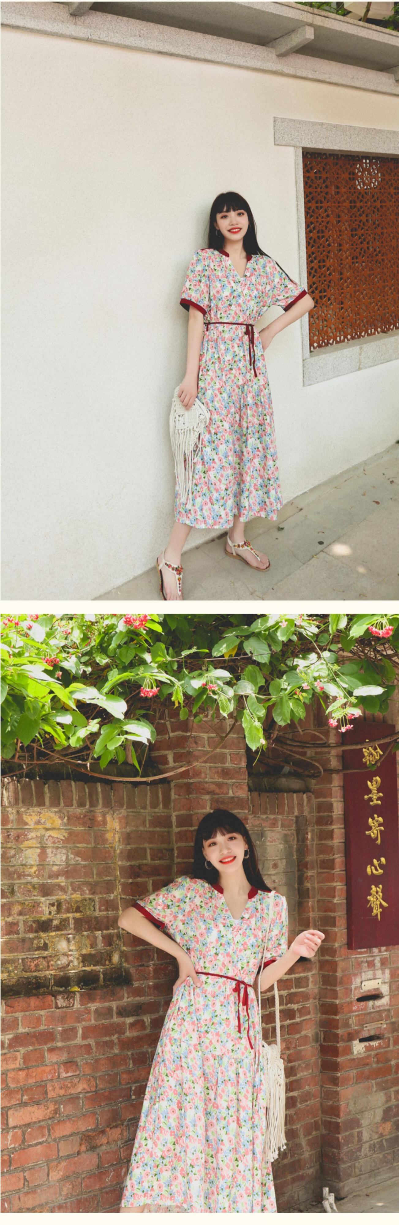ボヘミアンドレス エスニックフローラルVネックウェストサマー 夏物 花柄 延命家ファッション52862109093