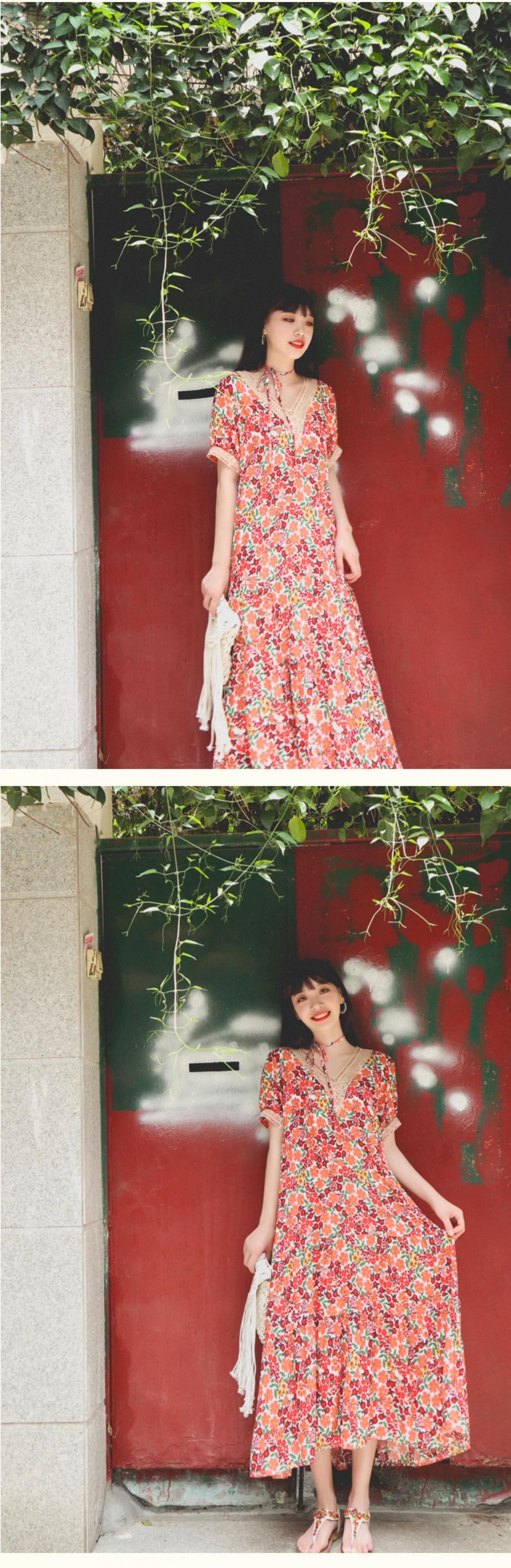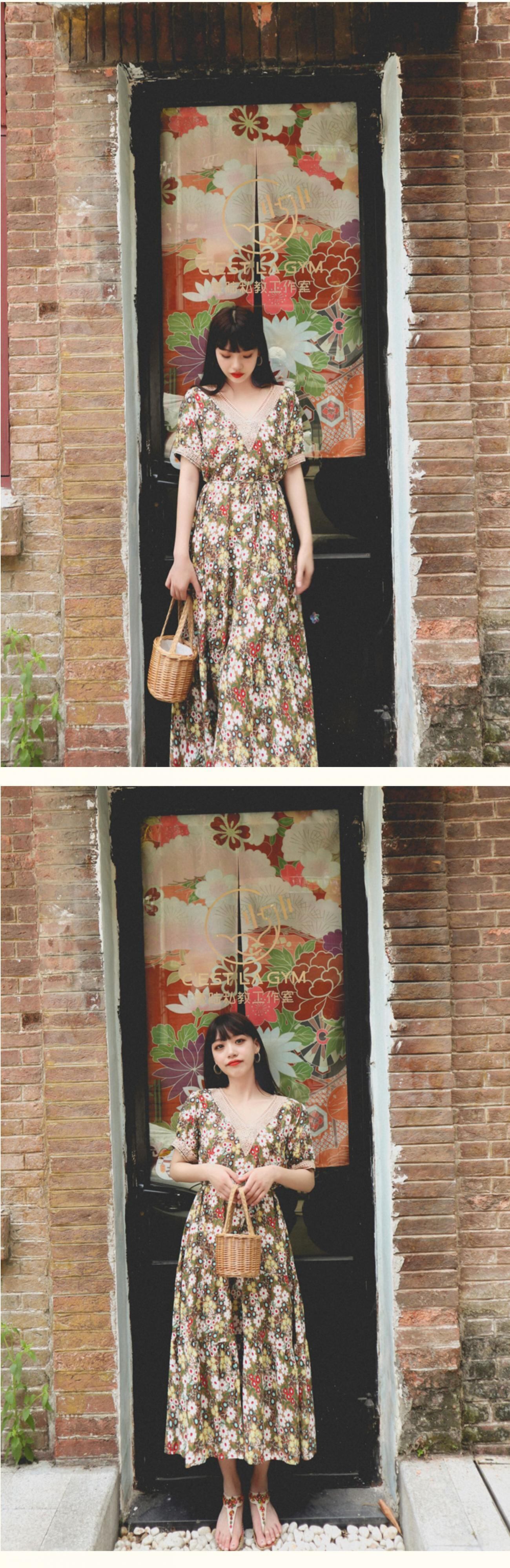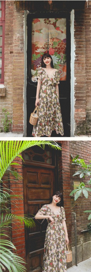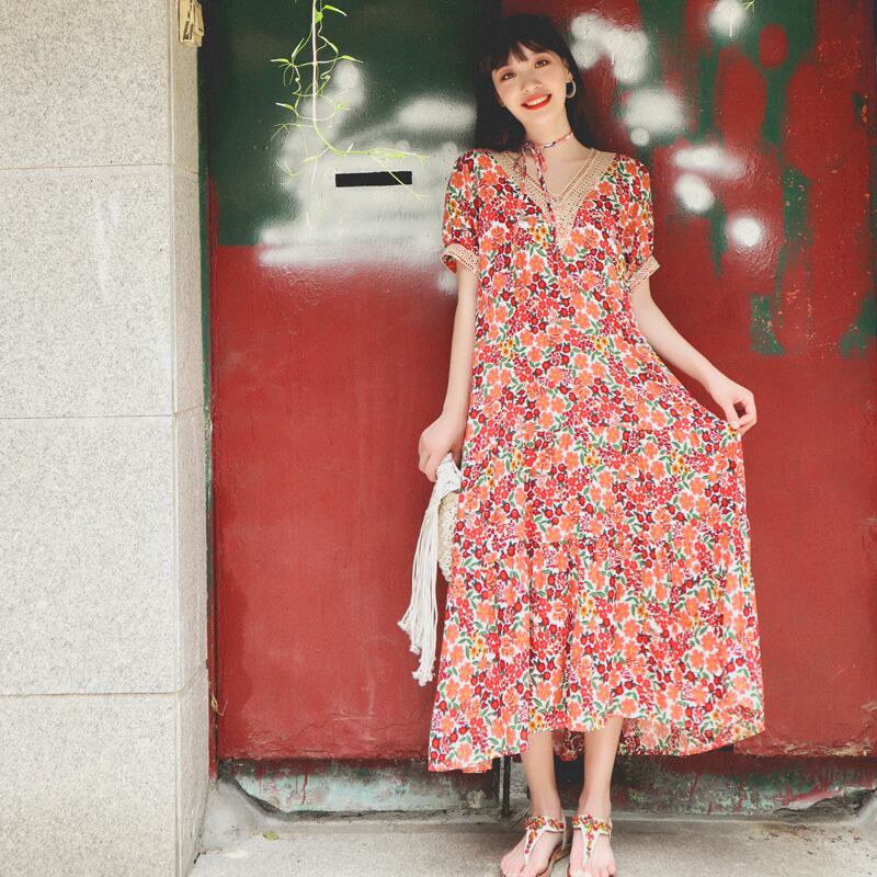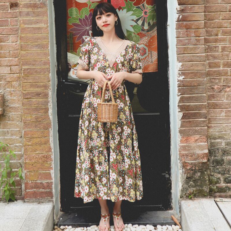 ロングスカート VネックフローラルFlowerデザイン スタンダードドレス レトロ 花柄 フラワーデザイン 延命家ファッション30465206843