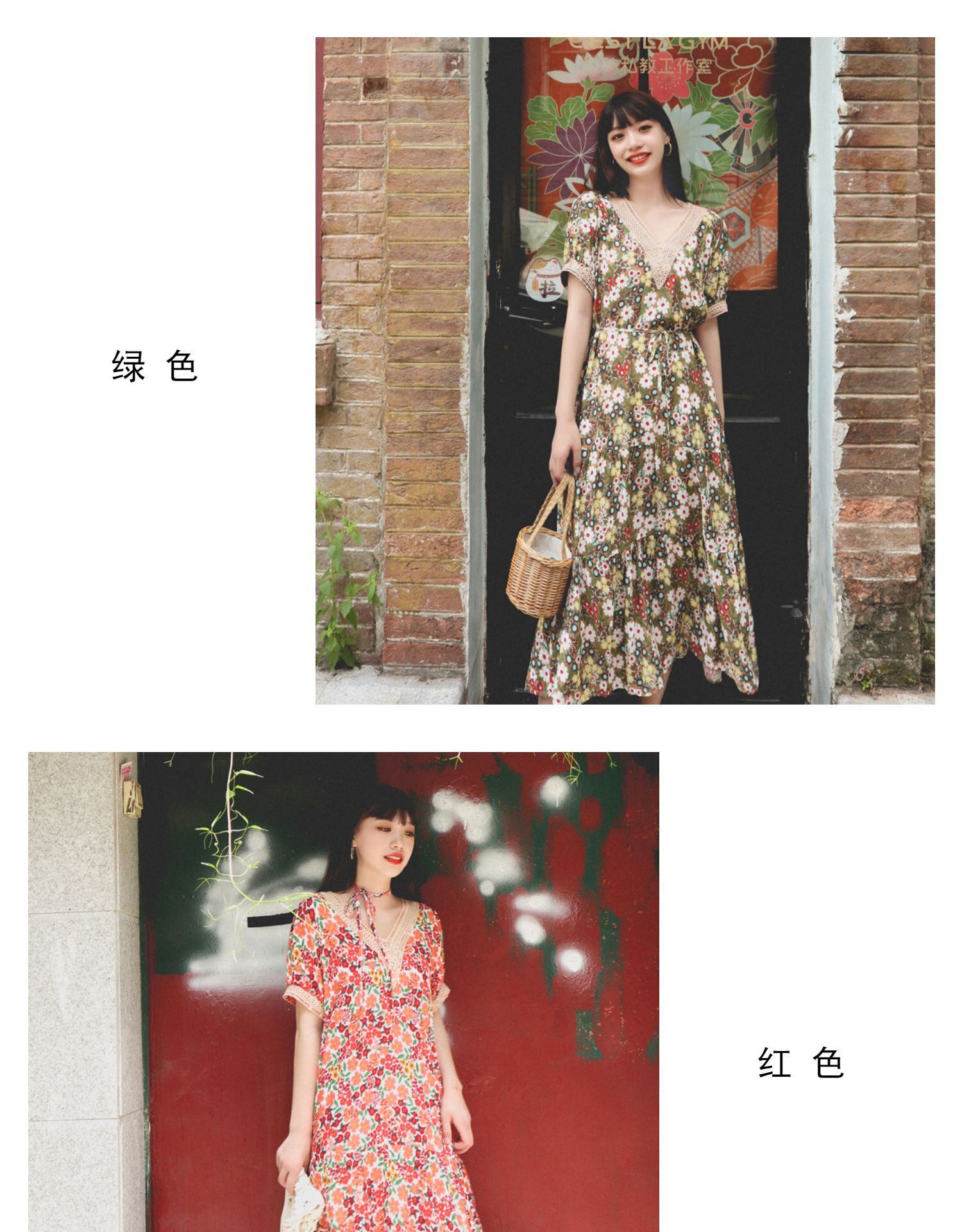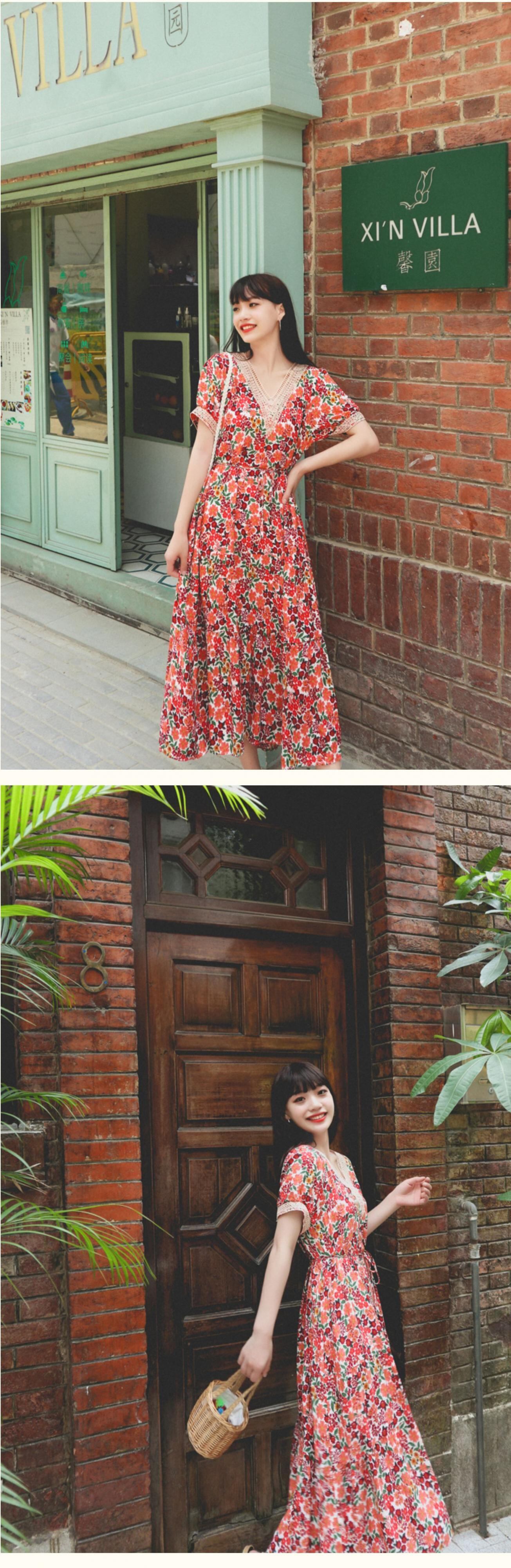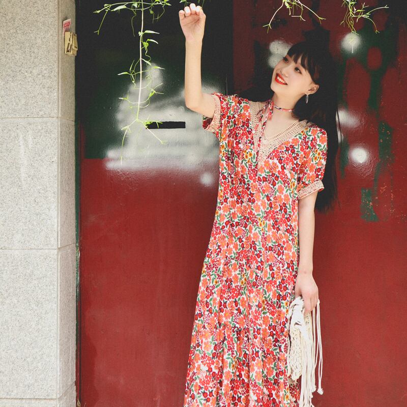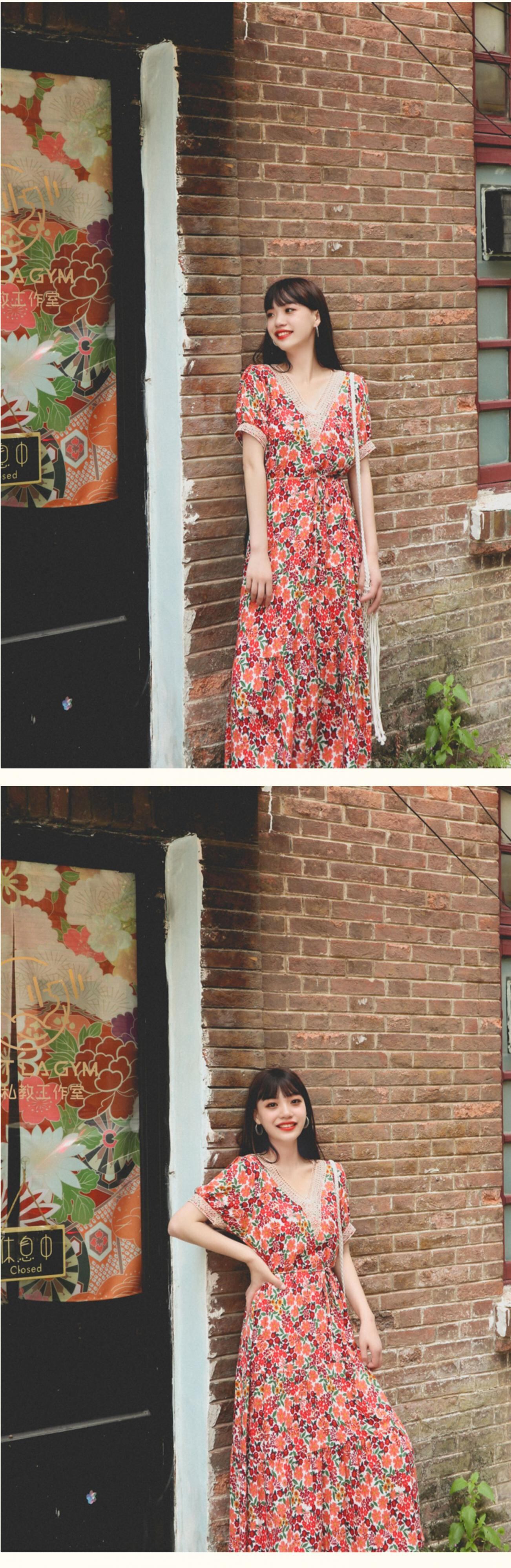 ロングスカート VネックフローラルFlowerデザイン スタンダードドレス レトロ 花柄 フラワーデザイン 延命家ファッション30465206843