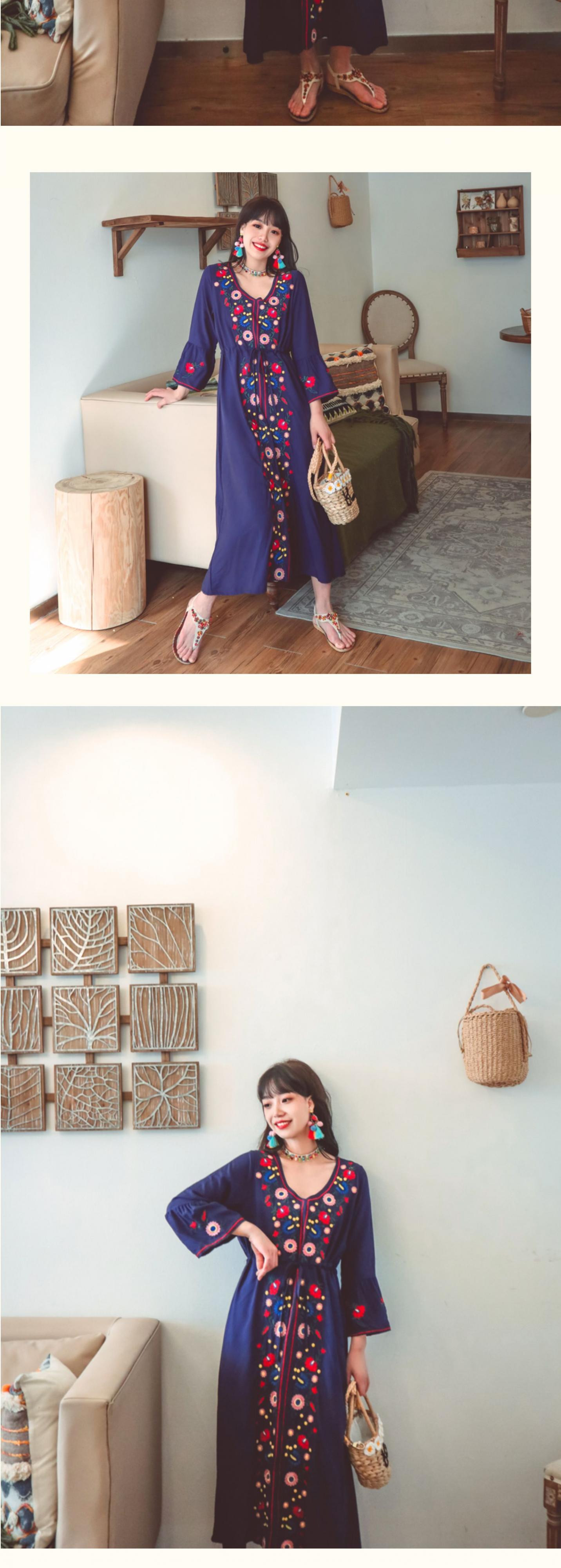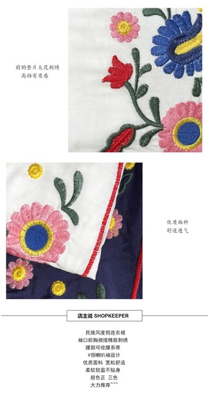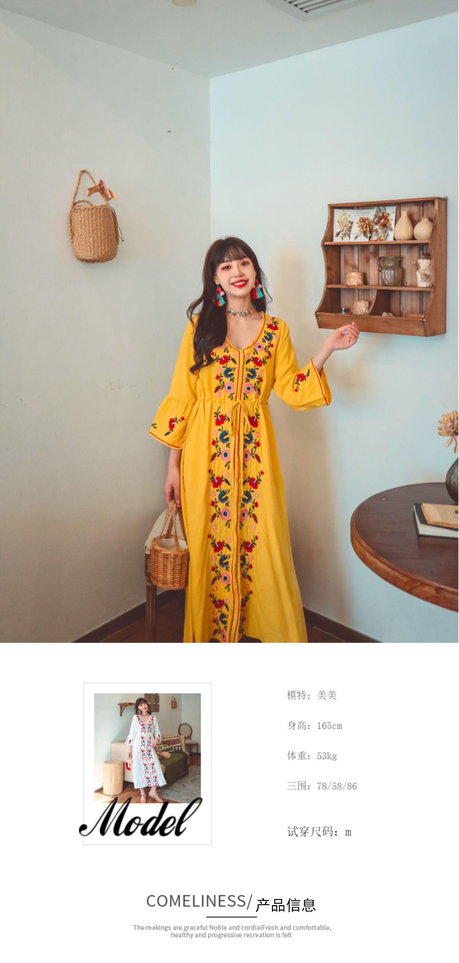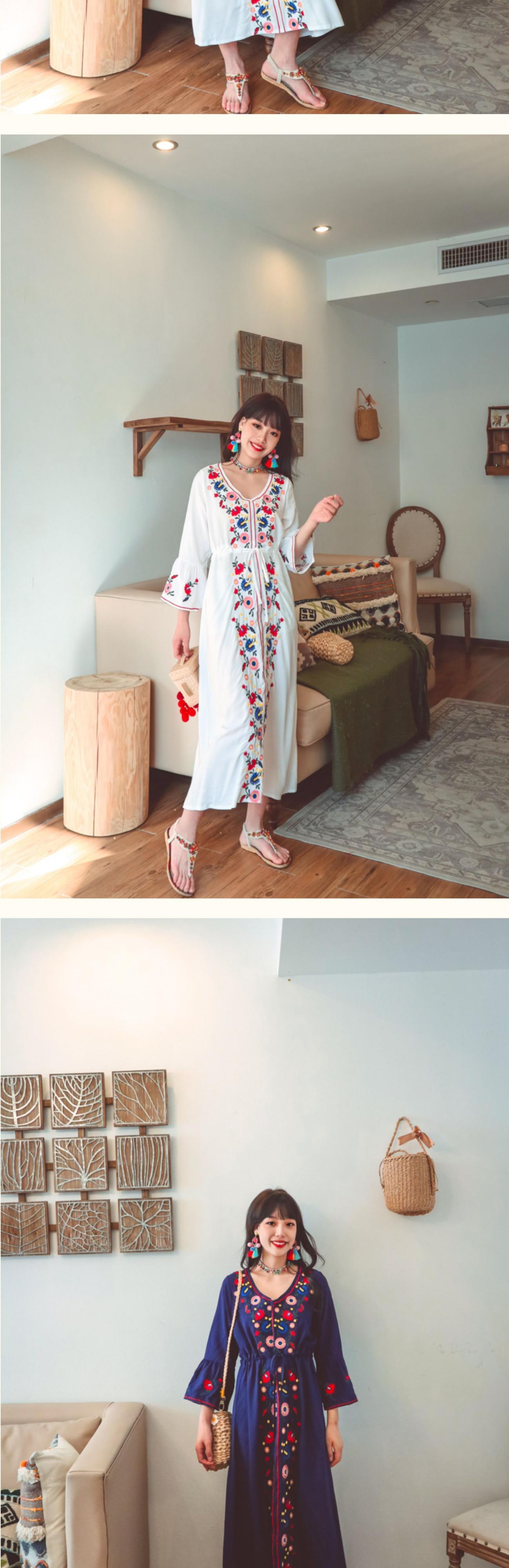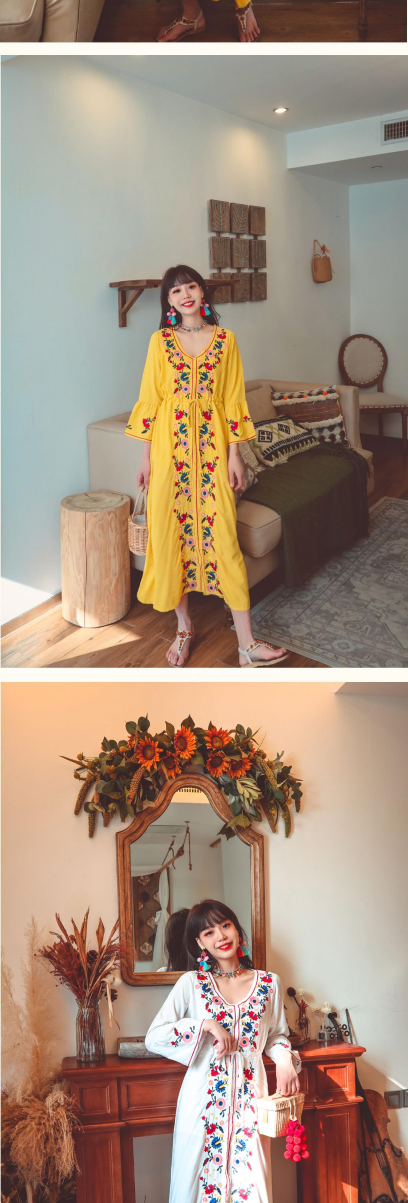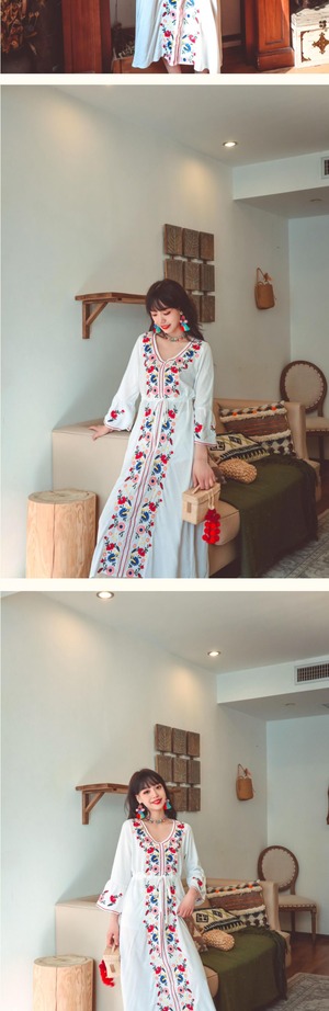 ボヘミアンエスニックスカート 刺繍Vネックウェストホワイトドレス サマー 夏物 ビーチ 延命家ファッション1396312902